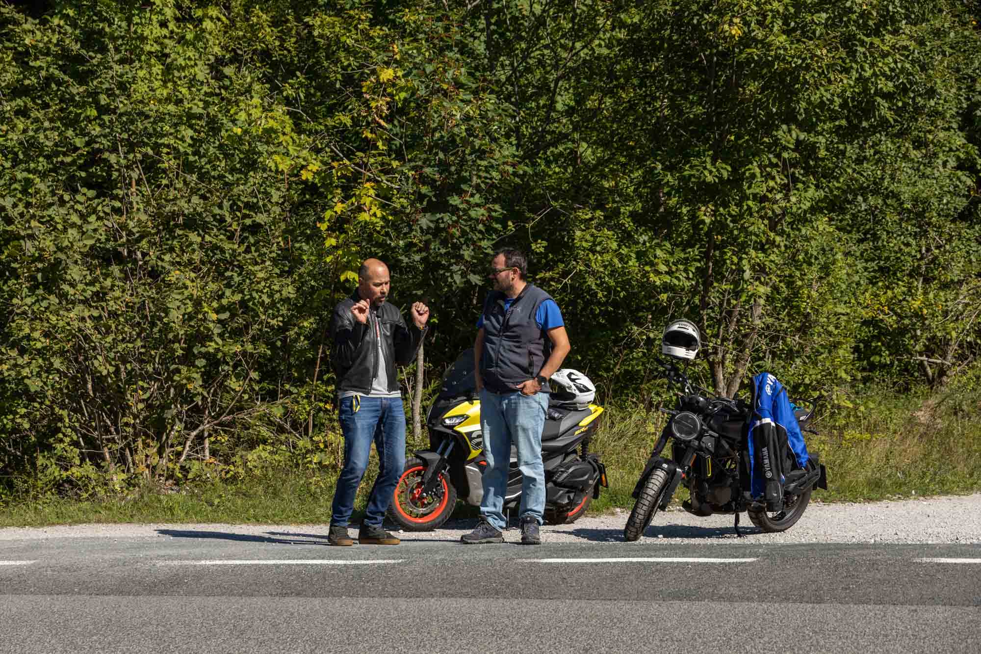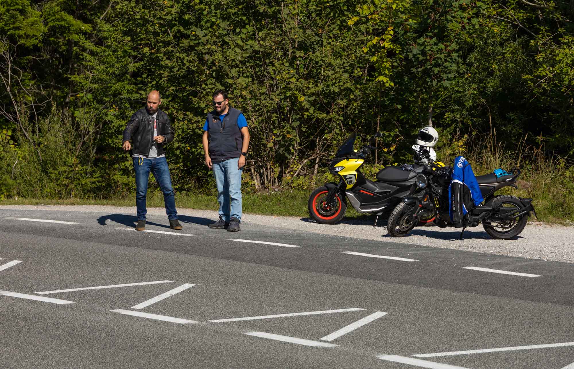 S Petrom sva se na izlet odpravila z dvema že na videz popolnoma različnima 125-kubičnima dvokolesnikoma. Peter je sedel na športni skuter aprila SR 125 GT, jaz pa sem vozil klasičen motocikel brez oklepa z rahlo terensko profiliranimi pnevmatikami in 6-stopenjskim menjalnikom - Husqvarnin svartipilen 125. Oba poganjata enovaljna motorja z 11 kilovati moči, kar omogoča, da ju lahko vozijo vozniki s kodo 125 oziroma kategorijo A1. Moči je dovolj, da oba dvokolesnika dosežeta največjo hitrost dobrih 100 km/h, kar je na cesti v odprtem prometu - sploh za začetnika - že visoka hitrost, ki jo je treba spoštovati. Med njima je zelo pomembna varnostna razlika: skuter, ki ga je vozil Peter, je bil opremljen “le” z zavornim sistemom CBS, ki za varnejšo vožnjo omogoča samodejno porazdelitev zavorne sile na obe kolesi, ne preprečuje pa blokiranja koles pri zaviranju v sili. Motocikel, ki sem ga vozil jaz, spada med varnostno najbolje opremljene manjše motocikle, saj ima spredaj in zadaj nameščene Brembove zavore z dvokanalnim Boschevim ABS zavornim sistemom, ki tudi pri maksimalnem pojemku preprečuje blokiranje koles. Na makadamu s slabšim oprijemom sva s Petrom preskusila zaviranje v sili in razlika je bila očitna: ABS tako kot v avtomobilih tudi na motorjih rešuje življenja, saj v kočljivih trenutkih motorist lahko zavira in usmerja motocikel. Tudi zato sem se odločil za husqvarno, ki poleg odličnih zavor ponuja še sistem za preprečevanje zdrsa pogonskega kolesa.