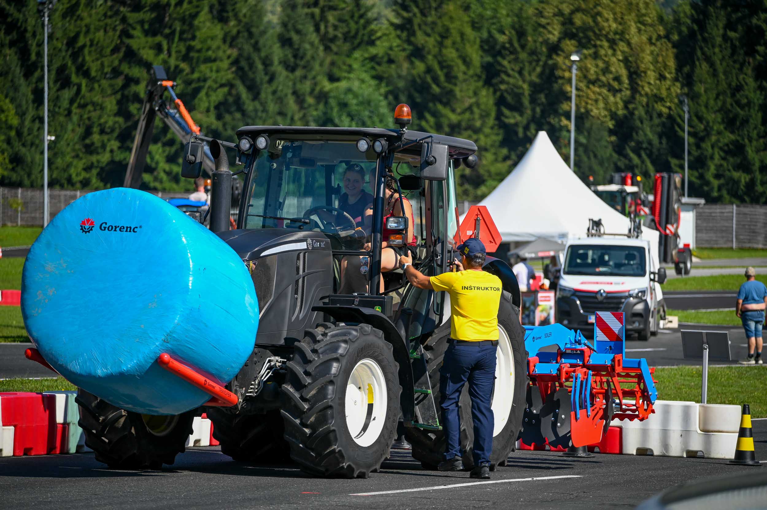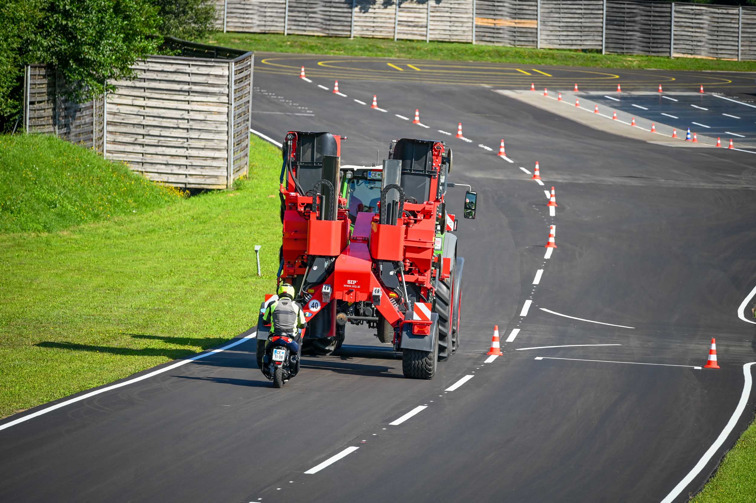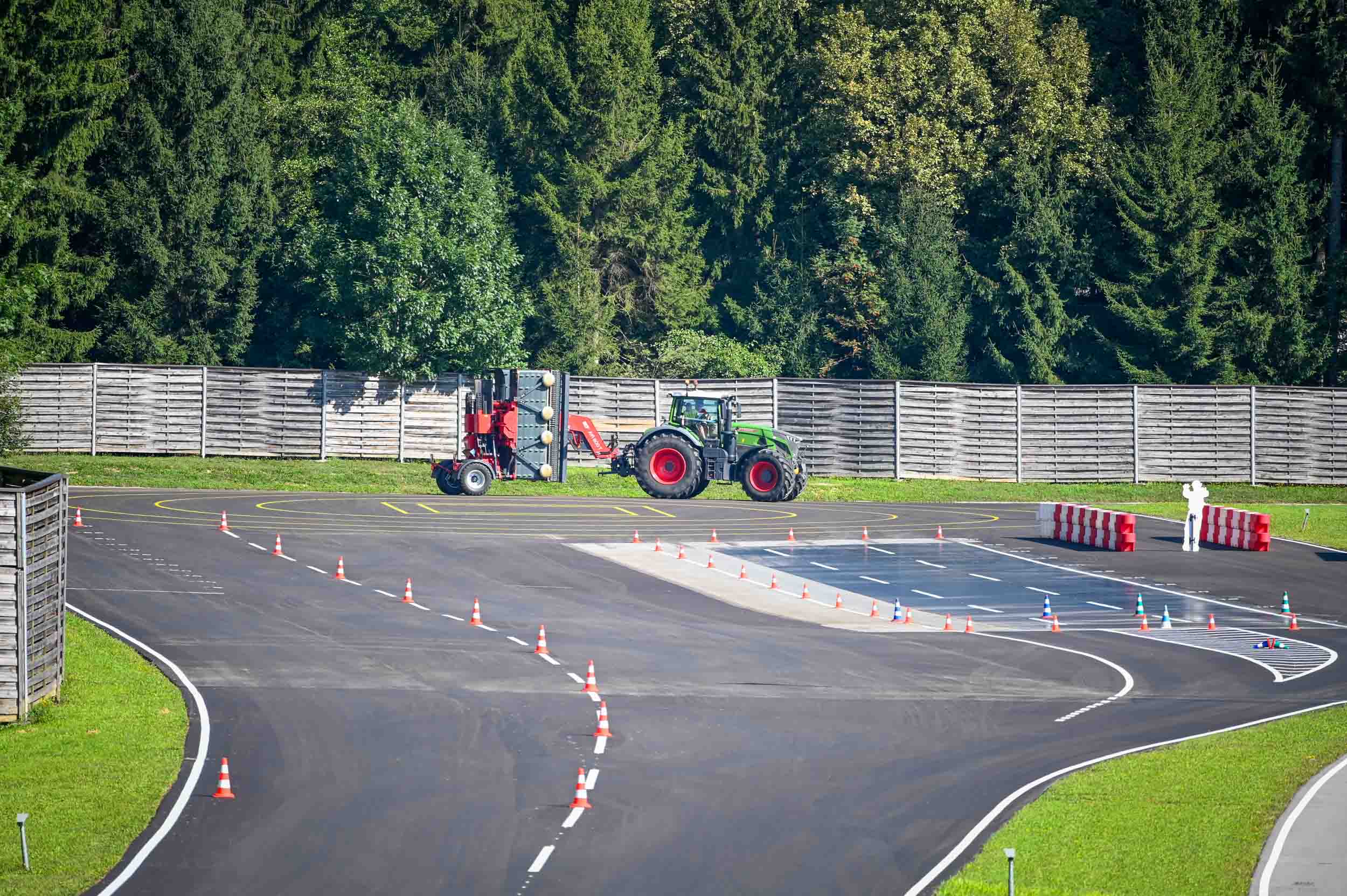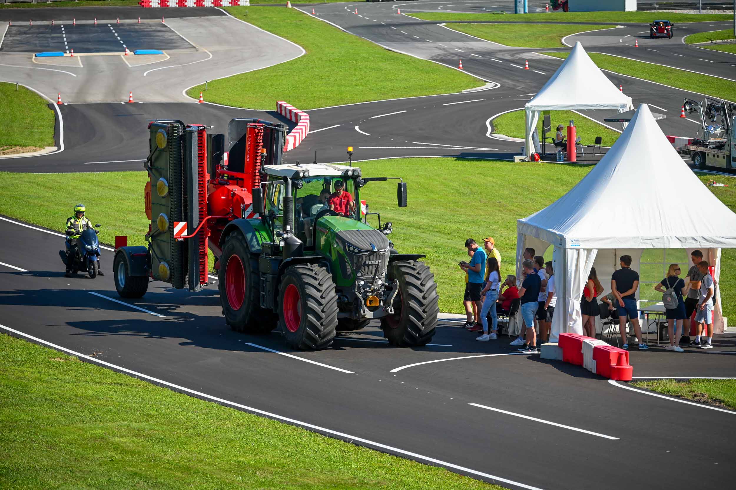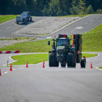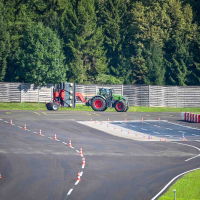 Na poligonu AMZS centra varne vožnje na Vranskem so inštruktorji za vse prijavljene obiskovalce pripravili zanimive preizkušnje, v katerih so pod nadzorom izkušenih inštruktorjev lahko preskusili svojo natančnost pri obvladovanju traktorja s širokimi priključki med tehničnimi ovirami. Preskusili so lahko tudi najsodobnejše sisteme za vleko različno velikih priklopnih vozil s poudarkom na varnem zaviranju in vodenju priklopnika pri vožnji po strmini. Pri tehniki zaviranja so še posebno pozornost namenili pravilnim nastavitvam priključkov in uporabi motorne zavore. Pri tem je vse voznike na pomen nadzora mrtvih kotov vseskozi s svojo prisotnostjo opozarjal inštruktor v vlogi motorista na 125-kubičnem skuterju.