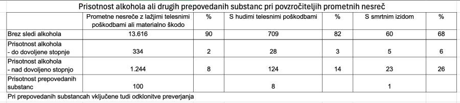 Pri povzročiteljih vseh prometnih nesreč je bila v 1.758 primerih ugotovljena prisotnost alkohola, od tega je bila vsebnost alkohola v 367 primerih pod dovoljeno vsebnostjo. Delež alkoholiziranih (nad dovoljeno stopnjo) povzročiteljev prometnih nesreč s smrtnim izidom je bil 26-odstoten, v primeru nesreč s hudimi telesnimi poškodbami pa 14-odstoten.