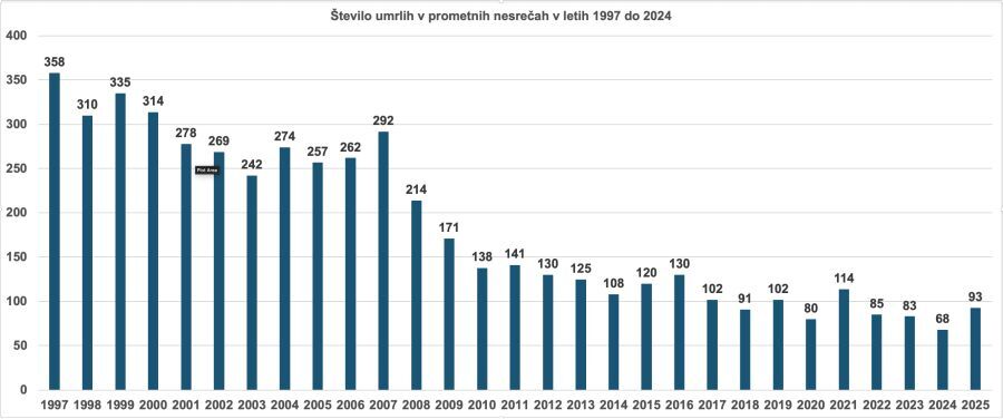 Potem, ko je bilo v letu 2024 najmanj smrtnih žrtev v prometu v zgodovini (samostojne) Slovenije, se je žal "uresničilo" naše opozorilo, da nas to lahko navdaja z optimizmom, a da kljub temu ne smemo biti preveč evforični; v letu 2025 je namreč za posledicami prometnih nesreč, umrlo 93 oseb, kar je kar 25 več kot leto poprej.