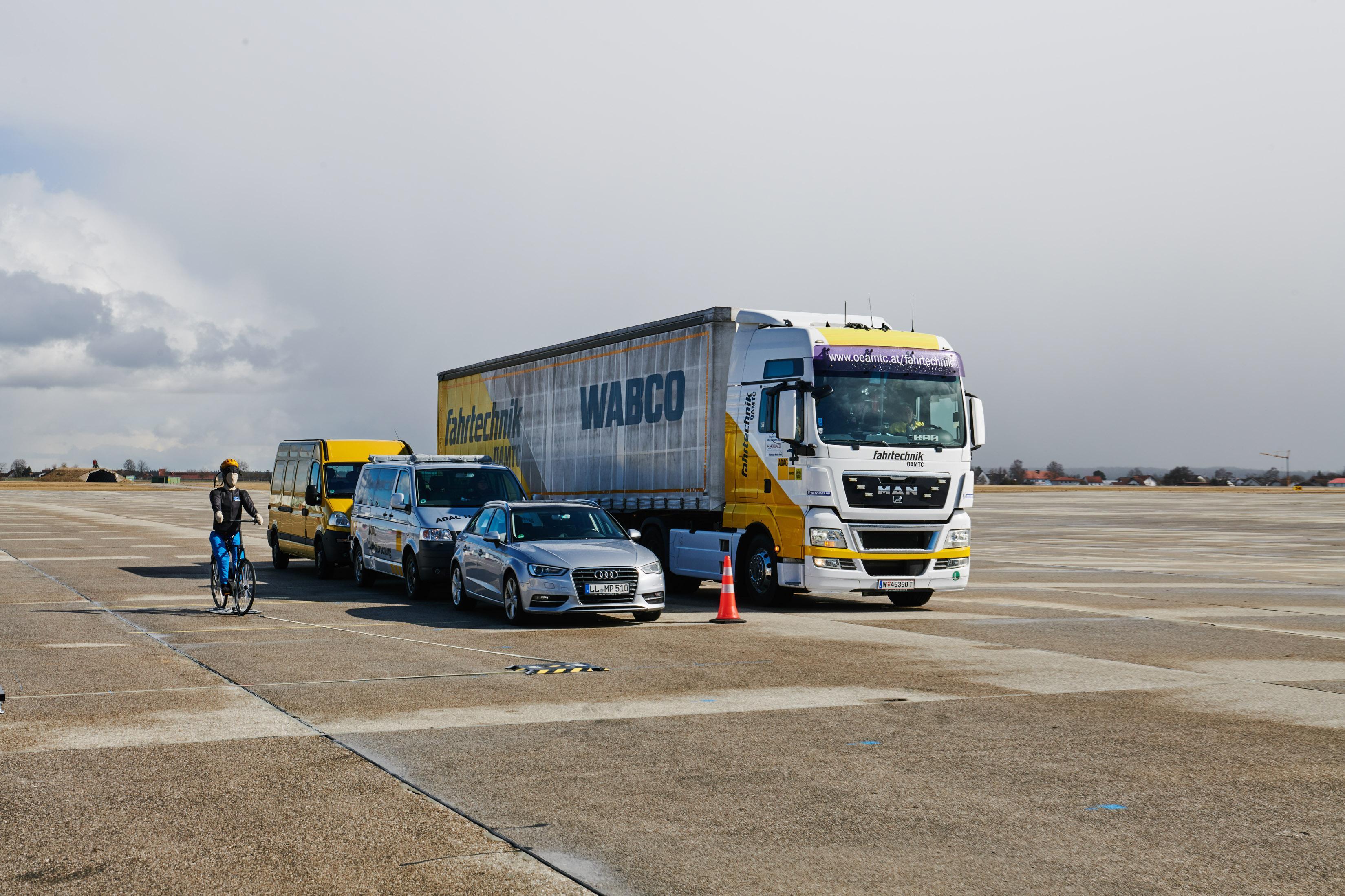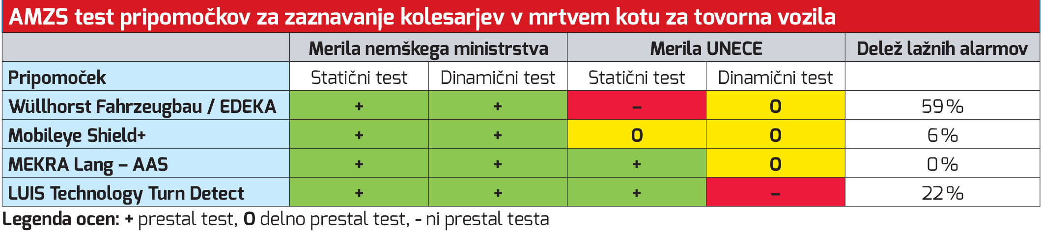 Za oceno učinkovitosti smo sisteme za zaznavanje kolesarjev v mrtvem kotu za tovorna vozila preskusili na dva načina. Prvi sloni na tehničnih merilih, ki jih je izdalo nemško ministrstvo za transport in digitalno infrastrukturo, ko je objavilo, da bodo s subvencijami podprli vgradnjo tovrstnih sistemov v nemške tovornjake. Drugi sklop meril se ravna po zahtevah komisije za standardizacijo Združenih narodov za Evropo (UNECE), ki pripravlja predpis o obvezni vgradnji tovrstnih pripomočkov v vse evropske tovornjake od leta 2022 naprej. Testna scenarija se med seboj razlikujeta v podrobnostih, oba pa upoštevata zaznavanje kolesarjev pri stoječem (statični test) in pri premikajočem se tovornjaku (dinamični test), upoštevata pa tako vzporedno vozeče kolesarje kot kolesarje, ki prečkajo pot tovornjaku. “Evropski” test predvideva tudi scenarij, pri katerem so med kolesarjem in tovornjakom statične ovire (parkirani avtomobili), kar je delalo težave vsem preskušenim pripomočkom in zaradi česar noben pripomoček ni brezhibno prestal UNECE testa.