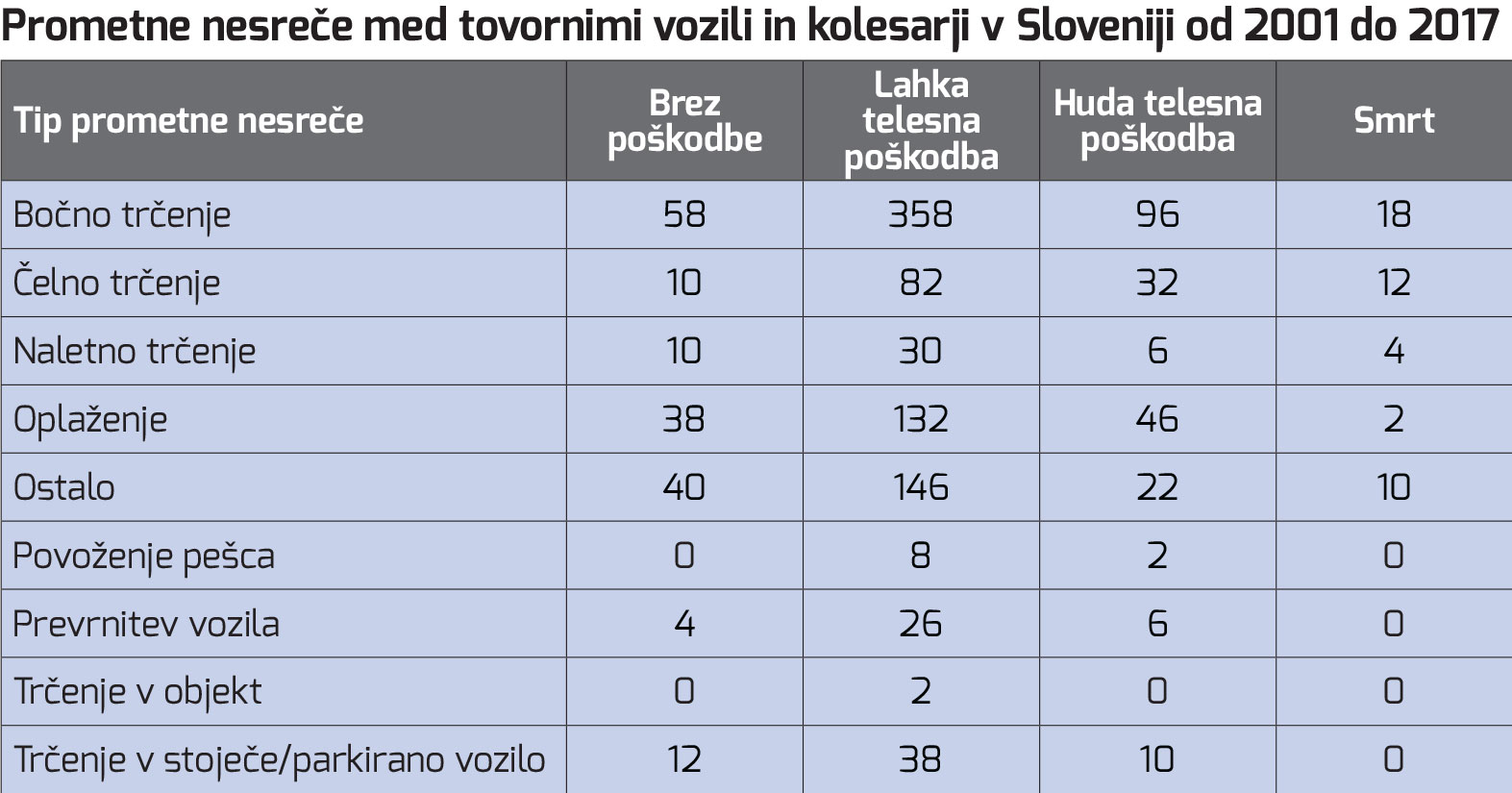 Slovenska statistika prometne varnosti beleži nesreče kolesarjev, ne spremlja pa dovolj natančno vzrokov zanje. Iz tabele, ki jo objavljamo v tem članku, lahko sklepamo, da opisan tip nesreče spada v rubriko “ostalo”; v takšnem tipu nesreč je v letih od 2001 do 2017 umrlo 10 kolesarjev, 22 jih je bilo hudo telesno poškodovanih, 146 pa lažje telesno poškodovanih. Koliko od teh nesreč se je zgodilo zaradi neprevidnega zavijanja desno, ne vemo, lahko pa zapišemo izkušnje z nemških cest: tam vsako leto v trčenjih kolesarjev s tovornjaki umre 70 kolesarjev, 665 pa je hudo telesno poškodovanih - in vsaka tretja tovrstna nesreča se zgodi zato, ker tovornjak pri zavijanju desno zapre pot kolesarju.