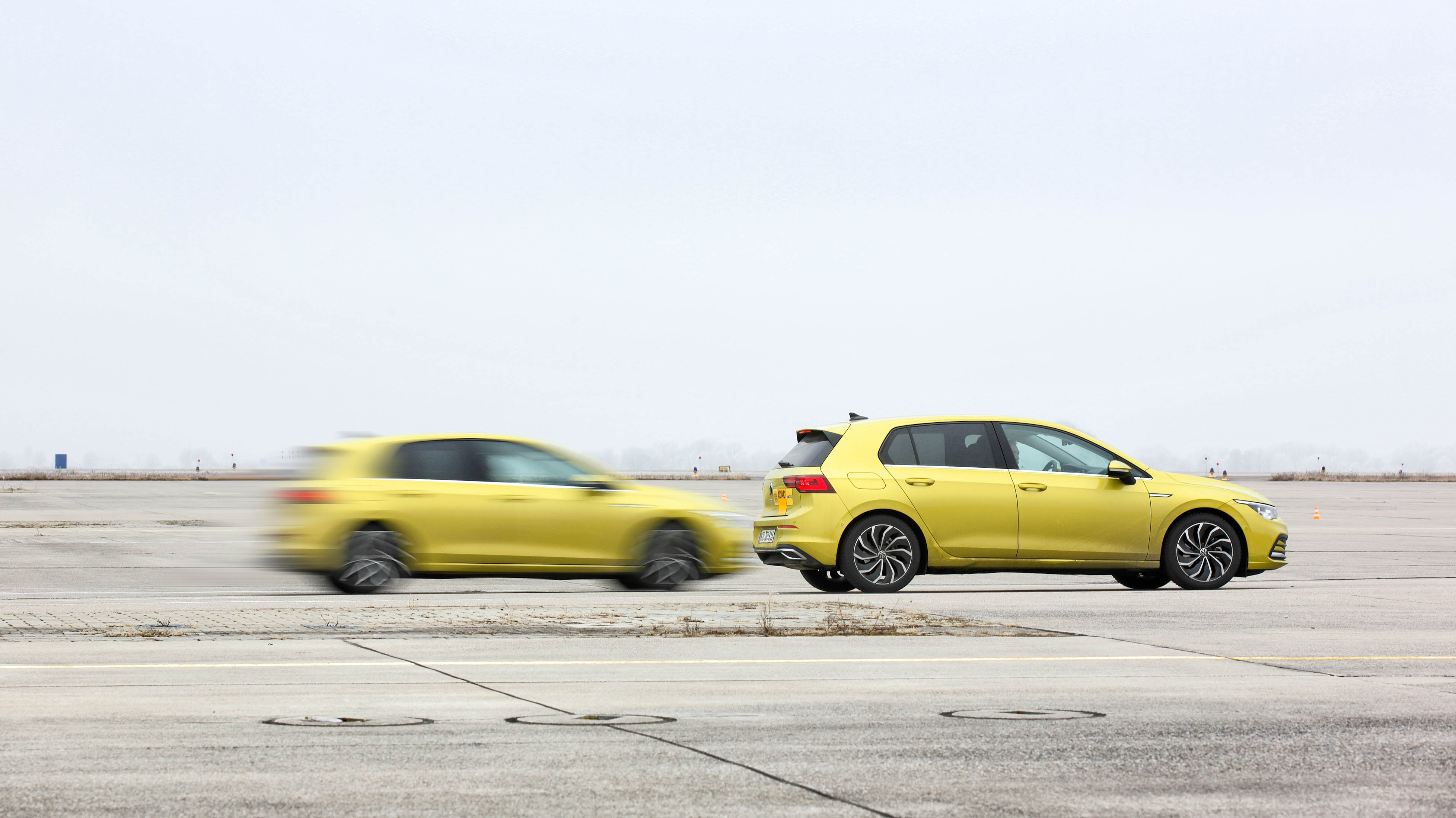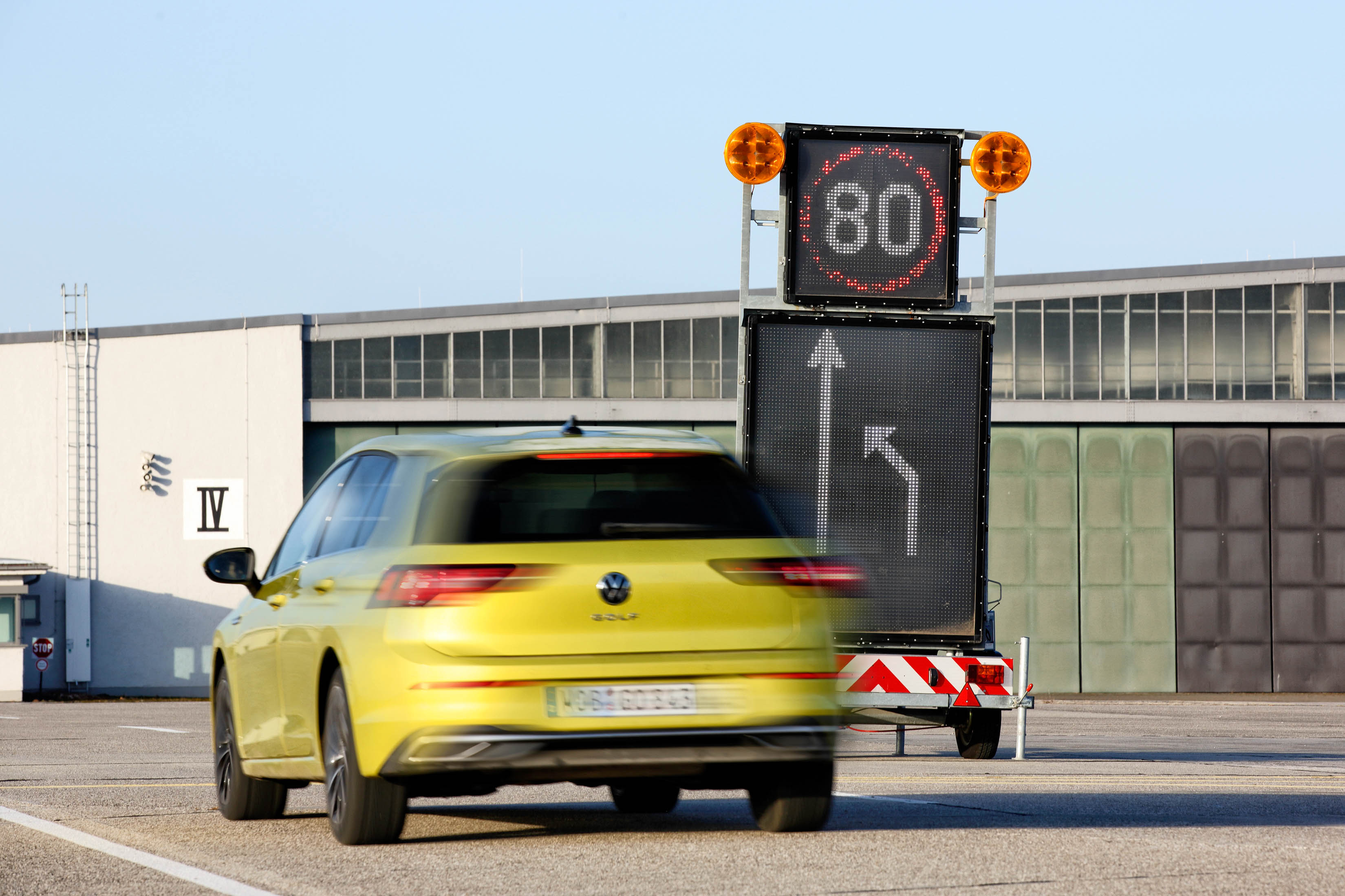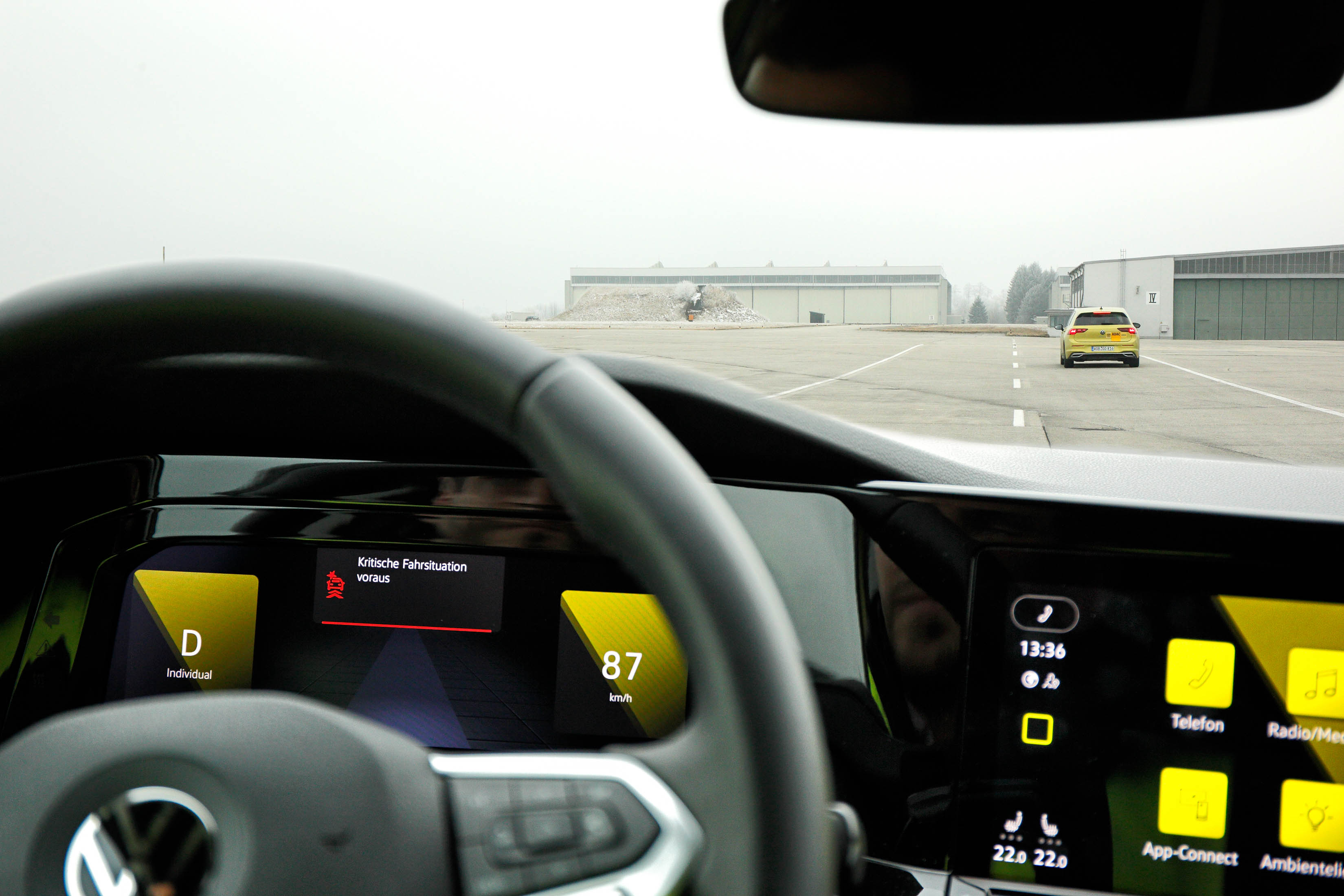Prvi test smo izvedli na ravni cesti: za volanom golfa smo vozili proti drugemu vozilu, pri katerem smo sprožili signal, da je vozilo v okvari in stoji ob robu ceste. Test smo izvedli v dveh različicah - z neoviranim pogledom iz bližajočega se avta na avto v okvari in z zakritim pogledom na mesto okvare. V obeh primerih sta se zvočni signal in obvestilo na armaturni plošči v našem golfu sprožila natanko 11 sekund pred prihodom na mesto okvare. Ko smo vozili s hitrostjo 100 km/h, nas je sistem na nevarnost opozoril približno 300 metrov pred mestom okvare, ko smo se bližali okvari s 120 km/h, pa se je opozorilo sprožilo 370 metrov pred mestom okvare. Vselej je bilo opozorilo točno in zanesljivo - ne glede na to, ali so mesto okvare zakrivala druga vozila ali ne.