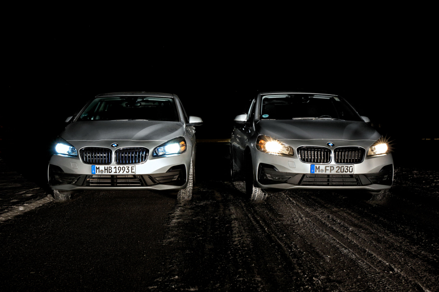 Da bi preskusili, kako deluje LED svetilka za naknadno vgradnjo - in kako preprosto ali težko jo je vgraditi -, smo si sposodili avto BMW serije 2 active tourer, pri katerem smo namesto serijskih halogenskih žarnic vgradili Osramovi LED svetilki. Za primerjavo smo temu avtu ob bok postavili BMW serije 2 grand tourer s halogenskima žarometoma.