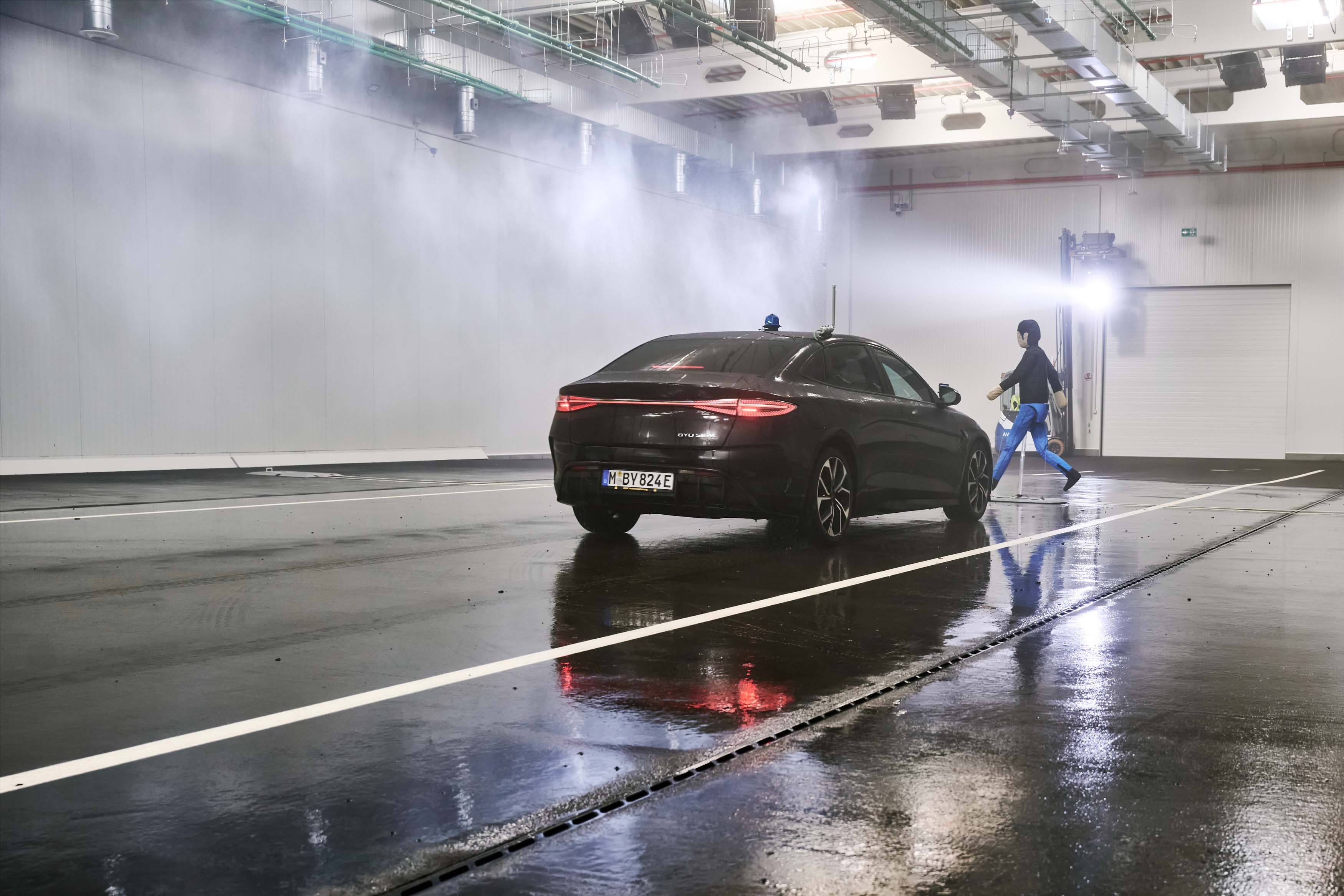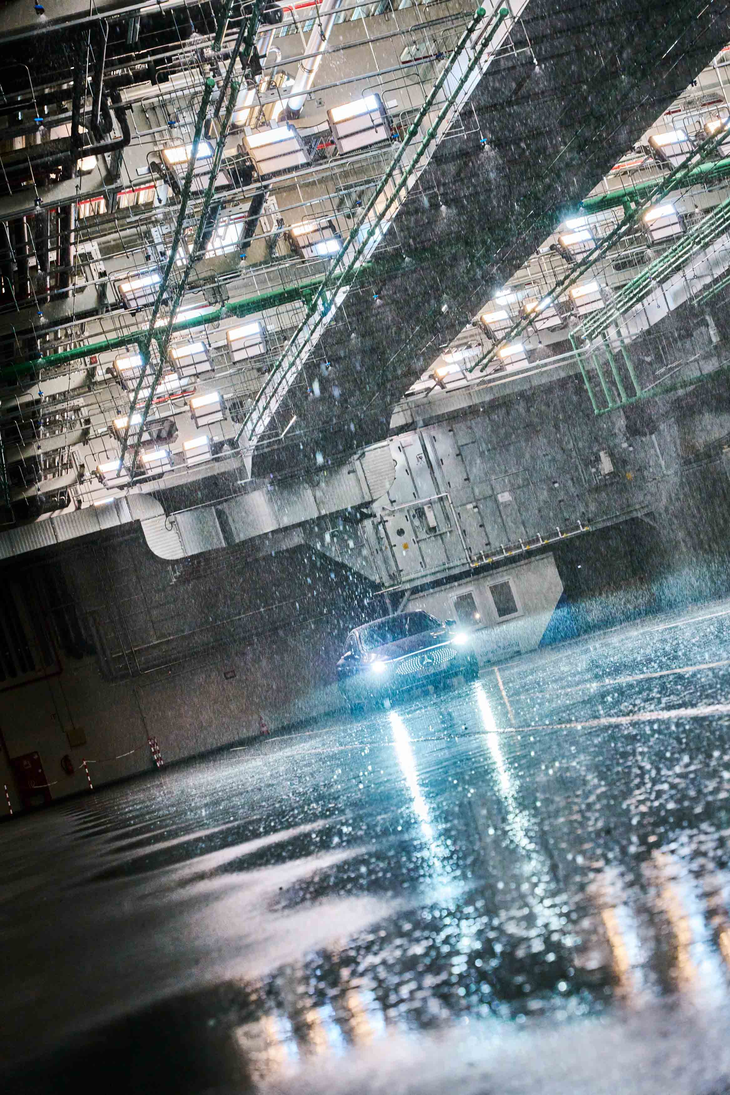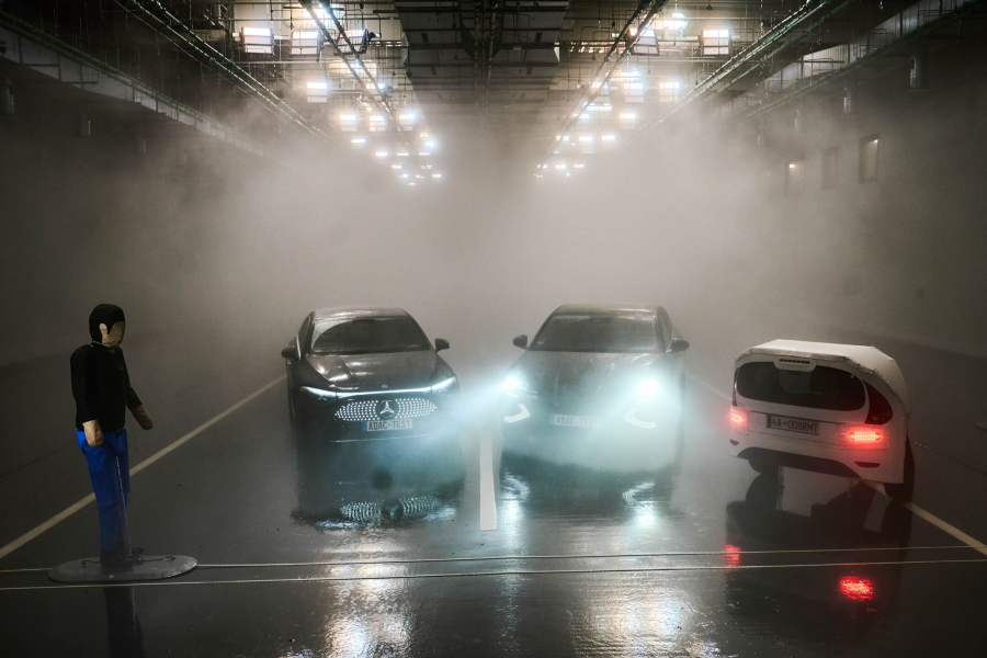 Posebna vremenska dvorana v nemškem Rodingu na površini približno 1600 kvadratnih metrov omogoča realistične in ponovljive vremenske razmere za testiranje tipala v dežju, megli in spremenljivih svetlobnih razmerah. Vozna površina je asfaltna, z definirano odbojnostjo in oznakami. V polju za dež 560 šob ustvarja naravno porazdelitev velikosti kapljic pri nastavljivih stopnjah padavin od 19 do 115 mm/h. Za meglo je na voljo 173 visokotlačnih šob; vidljivost je mogoče zmanjšati na približno 7 m. Osvetlitev dvorane sestavlja 60 LED-svetlobnih točk, dodatno pa je na voljo ksenonsko “virtualno sonce” za simulacijo slepeče in nasprotne svetlobe.