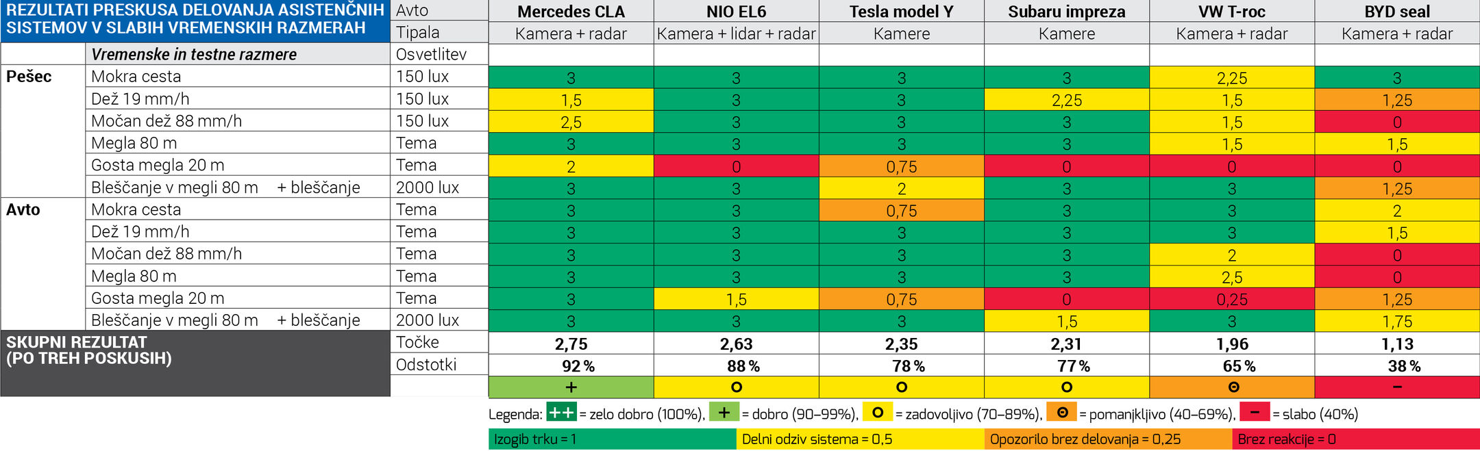Rezultat našega preskusa je pomenljiv – in hkrati poučen: nobeden od preskušenih avtomobilov oziroma noben od preskušenih asistenčnih sistemov se ne obnese brezhibno v vseh scenarijih oziroma vseh vremenskih razmerah.
