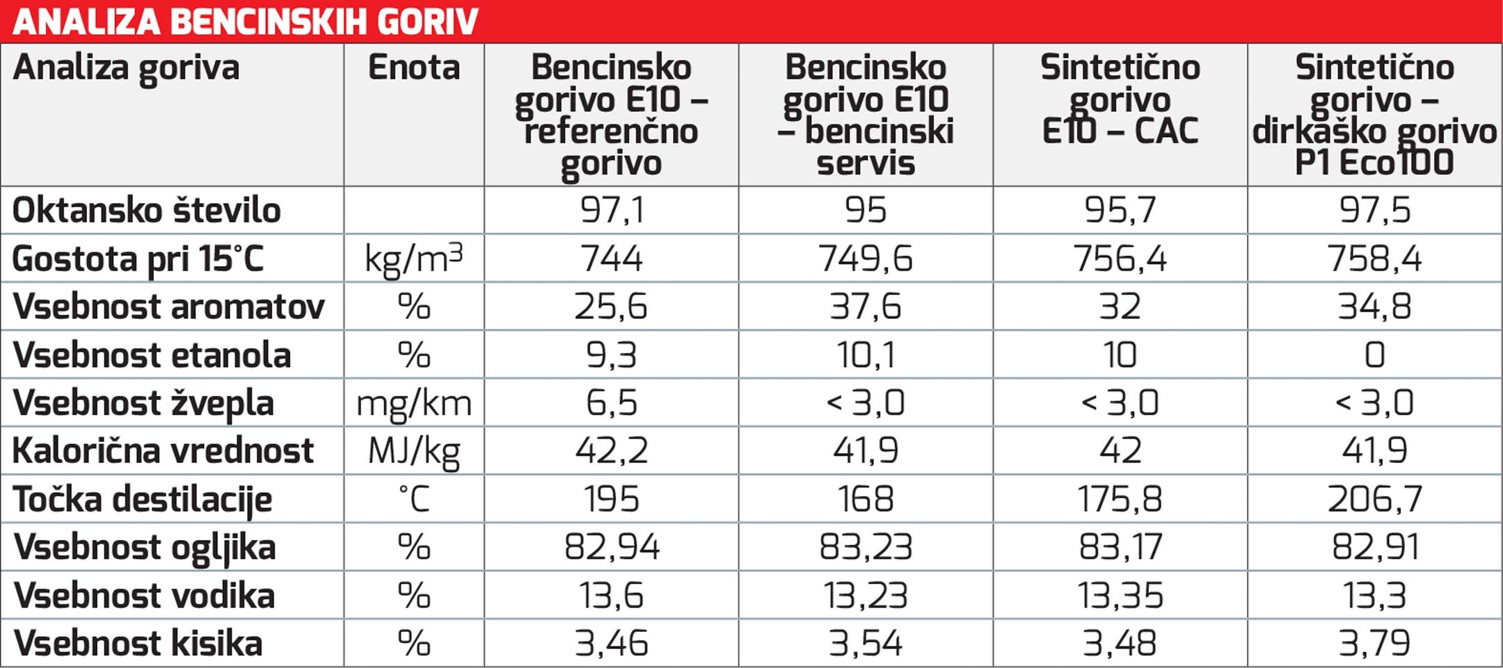 Čeprav gorivo P1 Racing Fuels Eco100 Pro velja za sintetično gorivo, smo pozneje v procesu testiranja ugotovili, da je k sintetičnemu bencinu primešan tudi bencin biološkega izvora, ki ob pomoči trajnostno pridobljene električne energije nastane s predelavo bioloških odpadkov. Natančnega razmerja med sintetičnim in biološkim bencinom nismo mogli ugotoviti, a v obeh primerih velja, da gre za ogljično nevtralno gorivo. Kljub temu smo se odločili, da dirkaško sintetično gorivo na preskusu ločimo od povsem sintetičnega goriva, kar se vidi iz primerjalne tabele; na tem testu smo skušali ugotoviti lastnosti povsem sintetičnega bencina, pridobljenega ob pomoči trajnostno pridobljene električne energije.