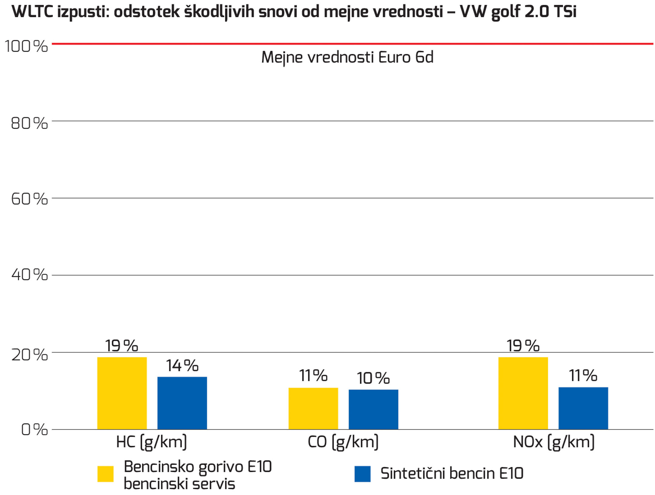 Meritve izpušnih plinov pri testnih avtih so pokazale, da izpusti škodljivih snovi pri alternativnih gorivih niso nič slabši kot pri fosilnih gorivih, večinoma so celo za nekaj odstotkov boljši. Tako smo pri golfu z 2-litrskim bencinskim motorjem namerili za 40 odstotkov manj izpustov dušikovih oksidov (NOx), ostale vrednosti (izpust oglikovodikov (HC), ogljikovega monoksida (CO) in trdnih delcev) pa so na enaki ravni kot pri fosilnih gorivih. Pri fordu fiesti z litrskim trivaljnikom so bile vse vrednosti škodljivih snovi v izpuhu na enaki ravni pri obeh vrstah goriva, podoben rezultat pa smo namerili tudi pri golfu z 1,4-litrskim bencinskim motorjem.