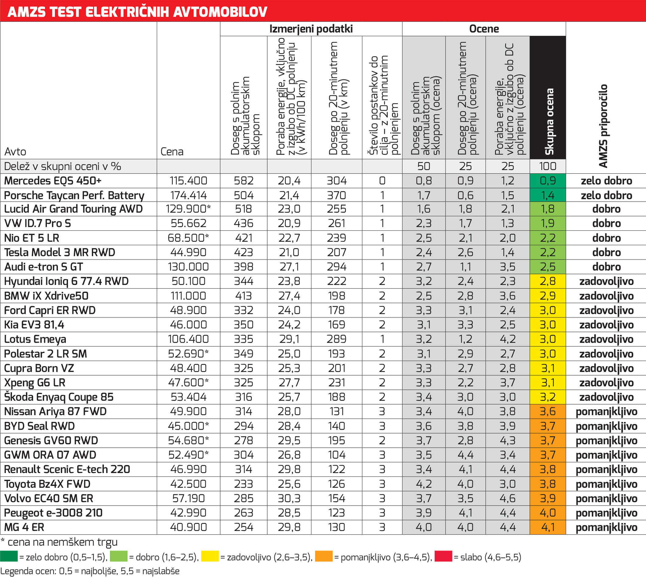 Na drugo mesto se je uvrstil Porschejev taycan, ki je poleg mercedesa edini dobil skupno oceno zelo dobro, na tretje mesto pa se je uvrstila električna limuzina air grand touring AWD ameriškega izdelovalca Lucid. Medtem ko ima Lucidov air velik doseg (približno 518 km) zaradi drugega najzmogljivejšega akumulatorskega sklopa (112 kWh), si je porsche taycan drugo mesto med preskušenimi avti zagotovil z majhno porabo energije in z odlično zmogljivostjo hitrega polnjenja, kar je zasluga 800-voltne električne arhitekture.