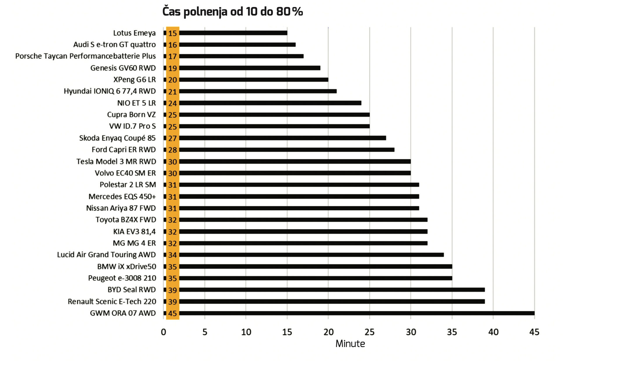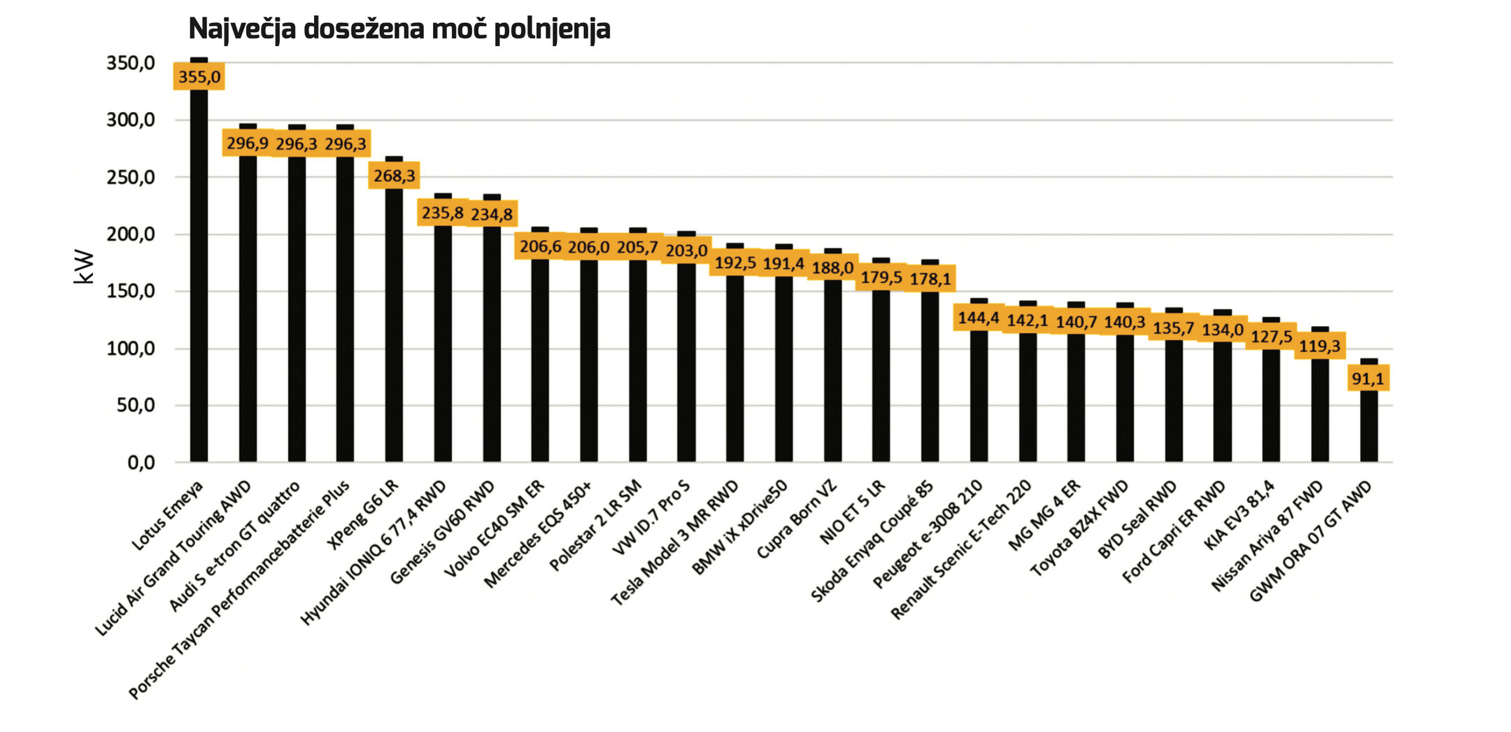 Če je imel avto možnost pregretja akumulatorskega sklopa oziroma priprave na hitro polnjenje, smo jo uporabili. Pri Lotusovi emeyi smo opravili dodatno polnjenje na zunanji polnilnici z močjo 400 kW, saj avto omogoča takšno moč polnjenja.