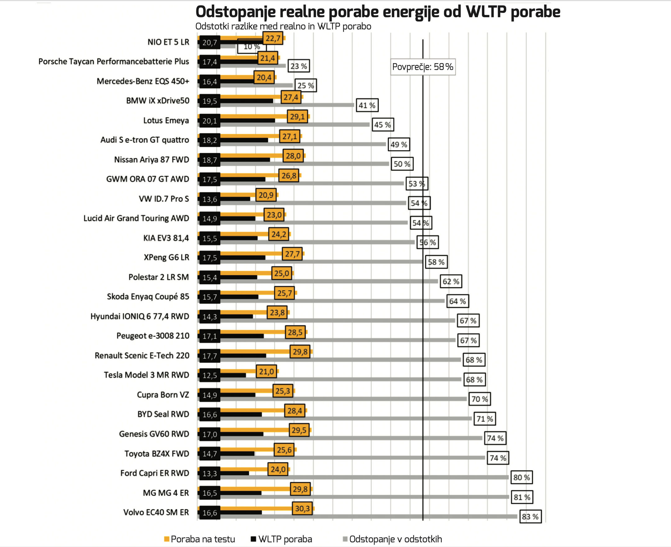 Povprečno odstopanje med dejansko porabo na našem testu in WLTP meritvami vseh 25 avtomobilov je skoraj 60-odstotno, kar je zelo veliko. Približno toliko na primer odstopa dejanska poraba pri Hyundaijevem ioniqu 6, ki sicer velja za dokaj učinkovit avto, a očitno mu nizke temperature ne prijajo. Na drugem koncu spektra je BMW-jev velik cestni terenec iX, ki ima kljub svoji velikosti očitno učinkovit pogonski sistem in zato njegova dejanska poraba od obljubljene odstopa za 41 odstotkov.