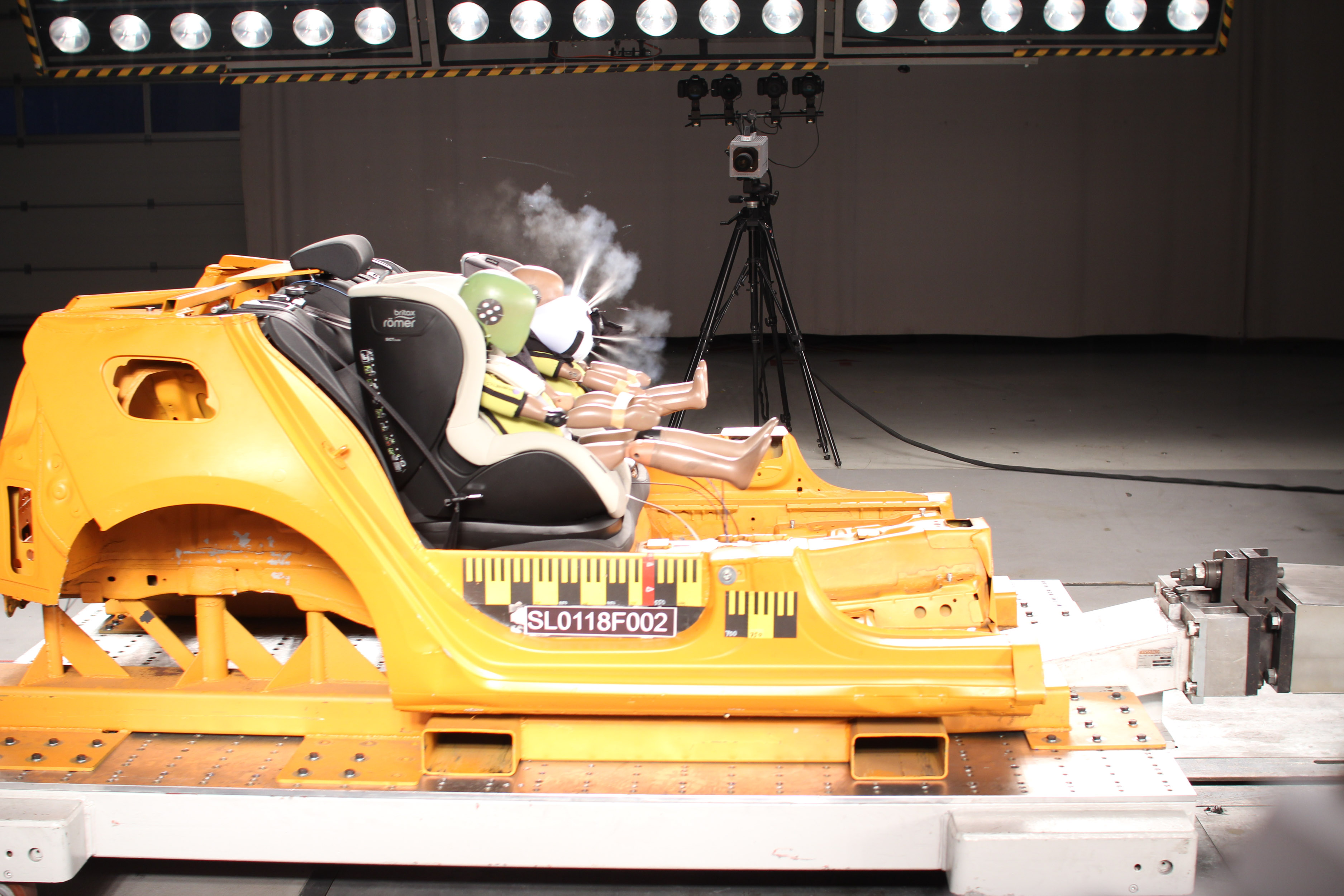 Med trkom varnostna meha prestrežeta gibanje otrokove glave naprej, s tem pa zmanjšata obremenitve vratu. Primerjava obremenitev vratu novega sedeža v primerjavi z enakim starejšim brez varnostnega meha, je pokazala od 25- do 50-odstotno zmanjšanje obremenitve, pospešek otrokove glave pa je za 15 odstotkov manjši kot pri predhodniku. Pri obeh sedežih smo namerili malce večje obremenitve lutke kot pri sedežih, kjer otrok sedi obrnjen v nasprotno smer vožnje, a za običajna sedeža sta oba dobila dobro oceno za zaščito pri čelnem trku.
