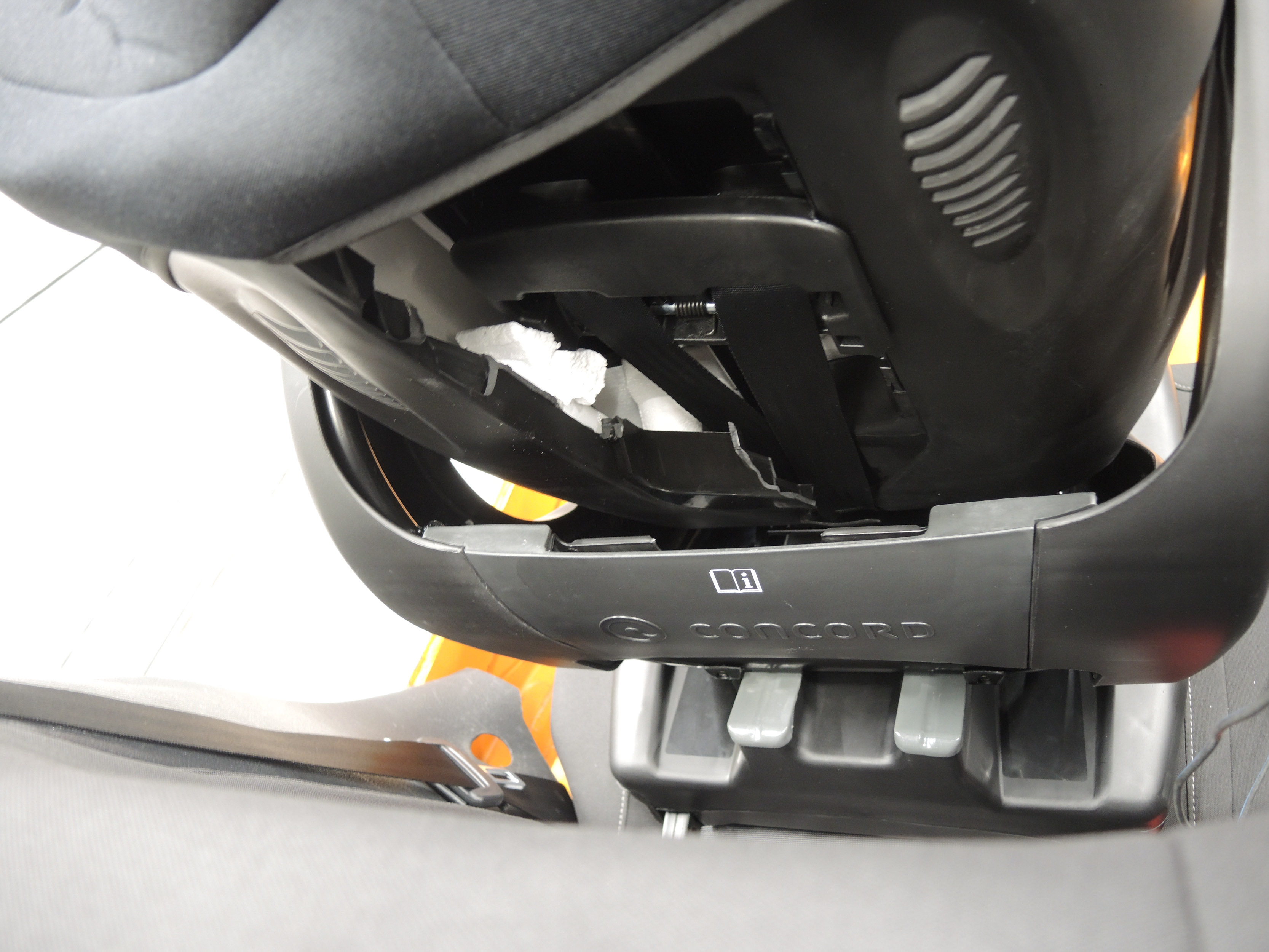 | Sedež concord ultimax i-sIze je zelo podoben Cybexovemu sedežu, lahko ga obračamo, pri namestitvi v nasprotno smer vožnje pa smo opazili nekaj težav z rokovanjem oziroma pripenjanjem v osnovo. A večjo težavo smo ugotovili pri preskusnem trku, saj se je pri čelnem trku odtrgalo naslonjalo – tudi ob ponovitvi testa. Na enem testu pri obrnjenosti nazaj se je sedež odtrgal iz zadnjega dela osnove. Sedež je imel nekaj težav tudi pri bočnem trku, zato menimo, da gre za napako v zasnovi. Nakup tega sedeža odsvetujemo. |