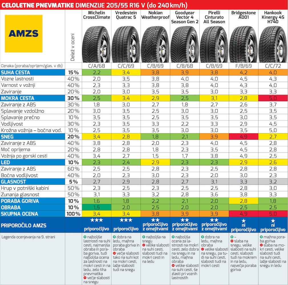 Ste že zamenjali poletna oblačila za toplejša, da se boste dobro počutili tudi v hladnejših dneh? Ste prilagodili tudi obutev: poletni sandali niso primerni za jesenske, kaj šele za zimske dni. Enako kot velja za obleko in obutev, velja tudi za pnevmatike. Letne so primerne za vožnjo spomladi, poleti in jeseni, ko na cestah začno prevladovati zimske vozne razmere, pod katerimi razumevamo tako nizke temperature kot stanje vozišča, je treba letne pnevmatike zamenjati za zimske. Tudi pri pnevmatikah je pač tako, da so tako letne kot zimske pnevmatike prilagojene voznim razmeram in le primerne pnevmatike avtomobilu zagotavljajo varno in zanesljivo vožnjo. To vedno znova dokazujejo tudi naši testi pnevmatik, saj smo že velikokrat nazorno dokazali, zakaj ni primerno uporabljati zimskih pnevmatik poleti in zakaj ne letnih pnevmatik pozimi. Ker pa menjava pnevmatik dvakrat na leto pač zahteva nekaj časa, seveda pa tudi ni zastonj, bi se marsikdo rad izognil tej menjavi. To so zaznali tudi izdelovalci pnevmatik in nekateri ponujajo tudi celoletne pnevmatike kot sprejemljiv kompromis uporabi specializiranih, torej letnih in zimskih, pnevmatik. Ali so izdelovalci res našli čarobno formulo in naredili korak naprej pri izdelavi celoletnih pnevmatik, pojasnjujemo z našim tokratnim testom sedmih celoletnih pnevmatik. Seveda pa smo tudi tokrat preverili lastnosti zimskih pnevmatik – na našem tokratnem preskusu jih je bilo 28 v dveh dimenzijah. Rezultati testa tako celoletnih kot zimskih pnevmatik so zelo zanimivi.