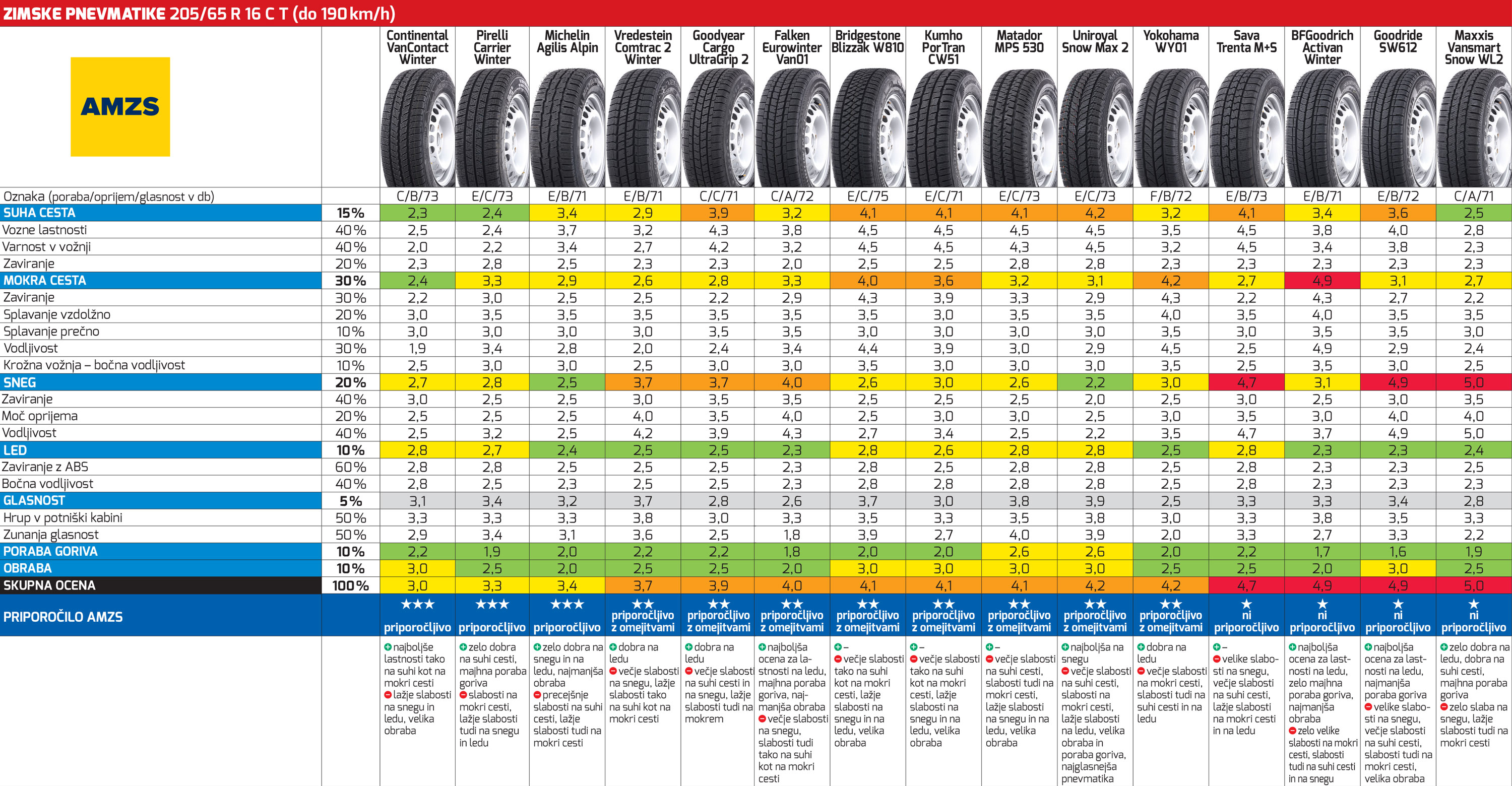 Kako težko je zasnovati in izdelati pnevmatiko, ki bi po vseh merilih dosegla odlično oceno, (znova) dokazuje tudi letošnji test zimskih pnevmatik. Letos smo temeljito preskusili 16 pnevmatik v dimenziji 185/65 R15 T in 15 pnevmatik v dimenziji 205/65 R16C T; prve so namenjene širokemu naboru osebnih avtomobilov, druge pa dostavnikom. Nobena preskušena pnevmatika ni dobila najboljše ocene: pri avtomobilskih pnevmatikah so le tri pnevmatike dobile oceno zelo priporočljivo, pri pnevmatikah za dostavnike pa nobena - kot pri testu letnih pnevmatik se je tudi tokrat izkazalo, da se dostavniki vozijo z zimskimi pnevmatikami vprašljive kakovosti. Kaj smo še odkrili?