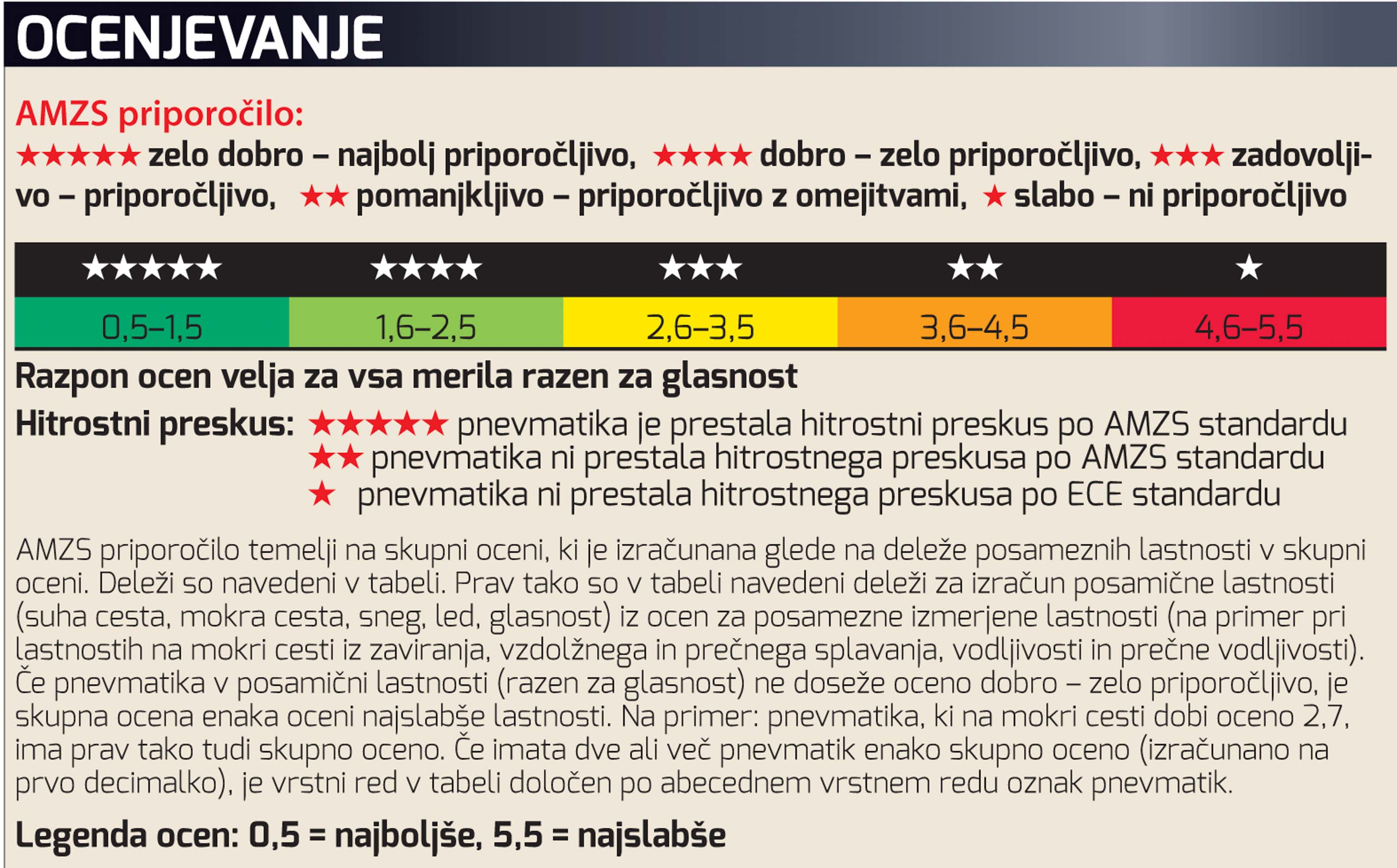 Da celoletne pnevmatike na snegu niso tako dobre kot zimske, na vročem asfaltu pa ne tako dobre kot letne, bralci Motorevije, ki spremljate naše teste, dobro veste. A vendarle tudi celoletne pnevmatike z zakonskega vidika veljajo za zimske, kar pomeni, da morajo izpolnjevati dokaj stroga merila, če izdelovalci želijo na bočnico vtisniti simbol snežinke v triglavi gori, ki na nekaterih trgih velja za oznako za pravo zimsko pnevmatiko - pri nas je za takšno klasifikacijo še vedno dovolj le oznaka M+S. Za pridobitev simbola za zimsko pnevmatiko mora celoletna pnevmatika prestati enake teste zavorne poti in oprijema na sneženi podlagi kot zimska pnevmatika.
