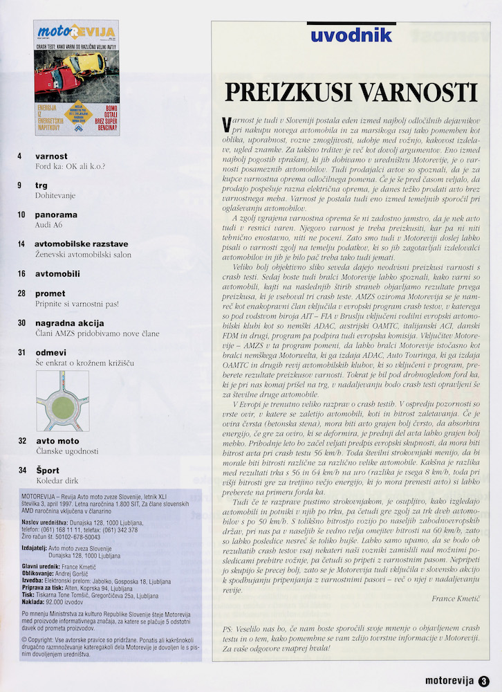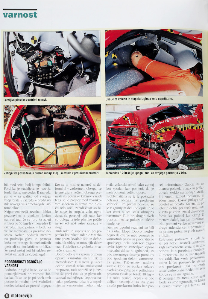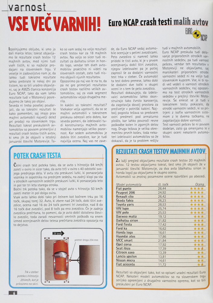 V Motoreviji junij – julij 1998 je bilo v uvodniku Primerjava varnosti zapisano: “Veseli smo, da lahko posredujemo ocene o varnosti kar 12 avtomobilov v nižjem srednjem razredu. Tistih avtomobilov, po katerih je tudi na našem trgu veliko povpraševanja: tako evropskih kot japonskih in korejskih avtov. Zasluge za to ima vključitev AMZS – v okviru mednarodnih organizacij AIT in FIA – v program Euro NCAP, ki združuje razne institucije. Na naslednjih straneh objavljamo podrobne rezultate za vseh 12 avtov. Da bi bralcem ponudili primerjavo s crash testi drugih avtomobilov, ki smo jih v Motoreviji že objavili, objavljamo tudi posebno tabelo s številčnimi ocenami od 1 (najboljše) do 5 (najslabše), ki so jo po rezultatih Euro NCAP naredili pri nemškem ADAC.” Ob uvodniku je bil objavljen tudi logotip Euro NCAP.