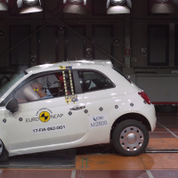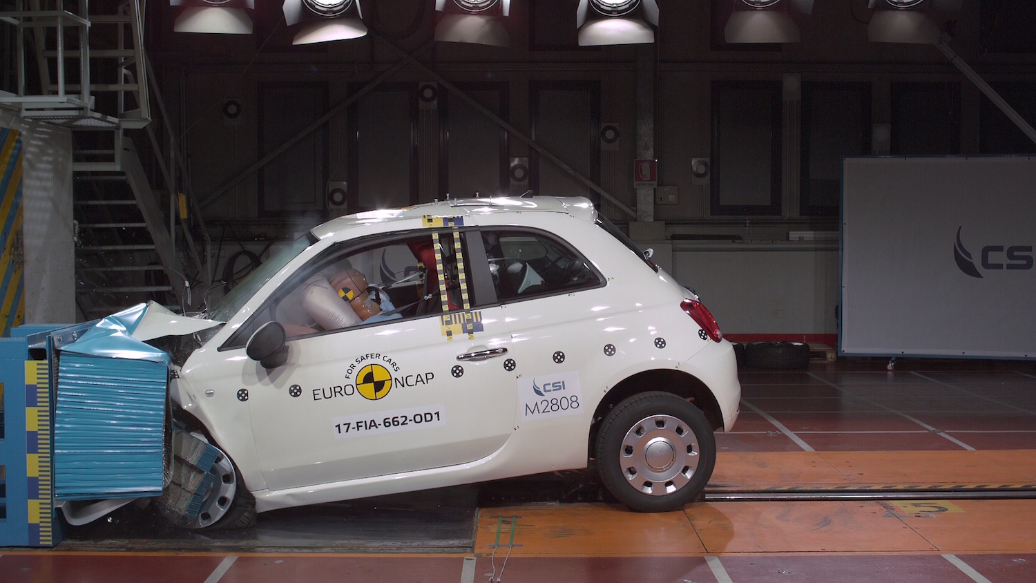 Potniška kabina fiata 500 je pri trku z delom prednjega avta v oviro, ki se deformira, ostala stabilna. Tako voznik kot sovoznik sta bila dobro zaščitena, prav tako ni bilo poškodb stegnenice in kolen. Drugače je bilo pri čelnem trku s celo širino avta v čvrsto oviro, saj je prišlo do kritičnih prekomernih obremenitev voznikove glave. Enako se je zgodilo tudi s sopotnikom na zadnjem sedežu, saj je tudi pri njem prišlo do kritičnih obremenitev glave, pa tudi prsnega koša zaradi velikih obremenitev, ki jih je povzročil ramenski del varnostnega pasu. Nič bolje se ni izkazal trebušni del varnostnega pasu, saj je sopotnik zdrsnil pod varnostnim pasom, kar je obremenilo trebuh. Dobro pa se je fiat 500 izkazal pri bočnem trku, pa tudi pri trku v steber.