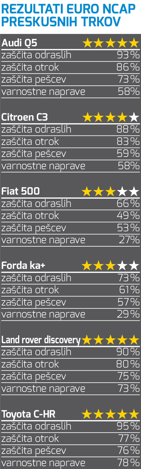 Konzorcij Euro NCAP je preskusil še šest avtomobilov različnih velikosti. Trije – novi audi Q5, land rover discovery in toyota C-HR – so dobili najvišjo oceno pet zvezdic, eden – novi citroen C3 – je dobil štiri zvezdice, dva majhna avtomobila – fiat 500 in ford ka+ – pa sta dobila po tri zvezdice.