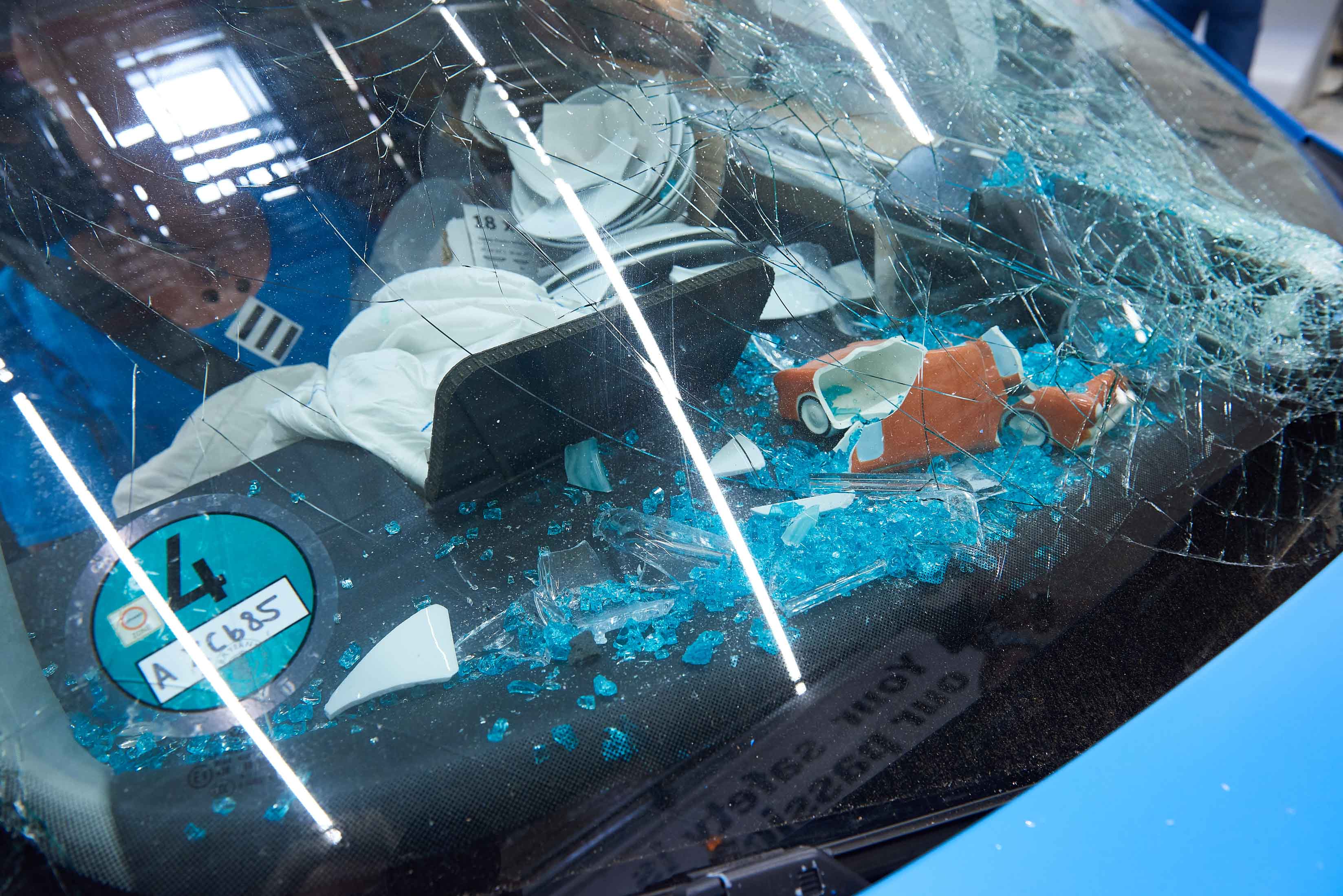 Litoželezna ponev je na lutki voznika povzročila obremenitev in poškodbo, ki bi bila lahko usodna. Avtomobil je bil močno poškodovan tudi znotraj kabine.