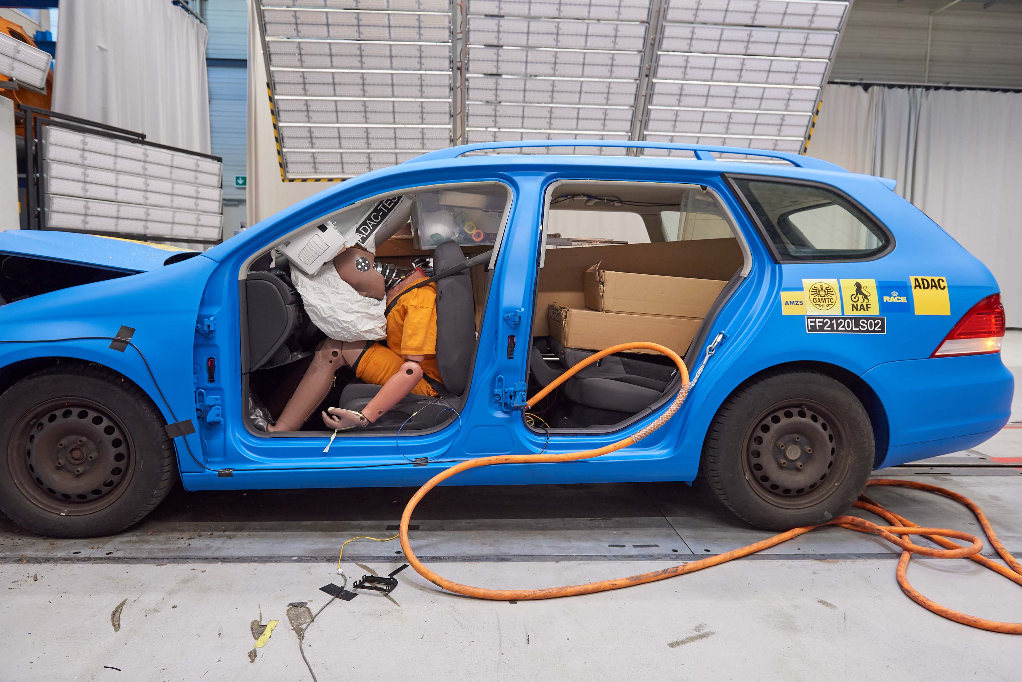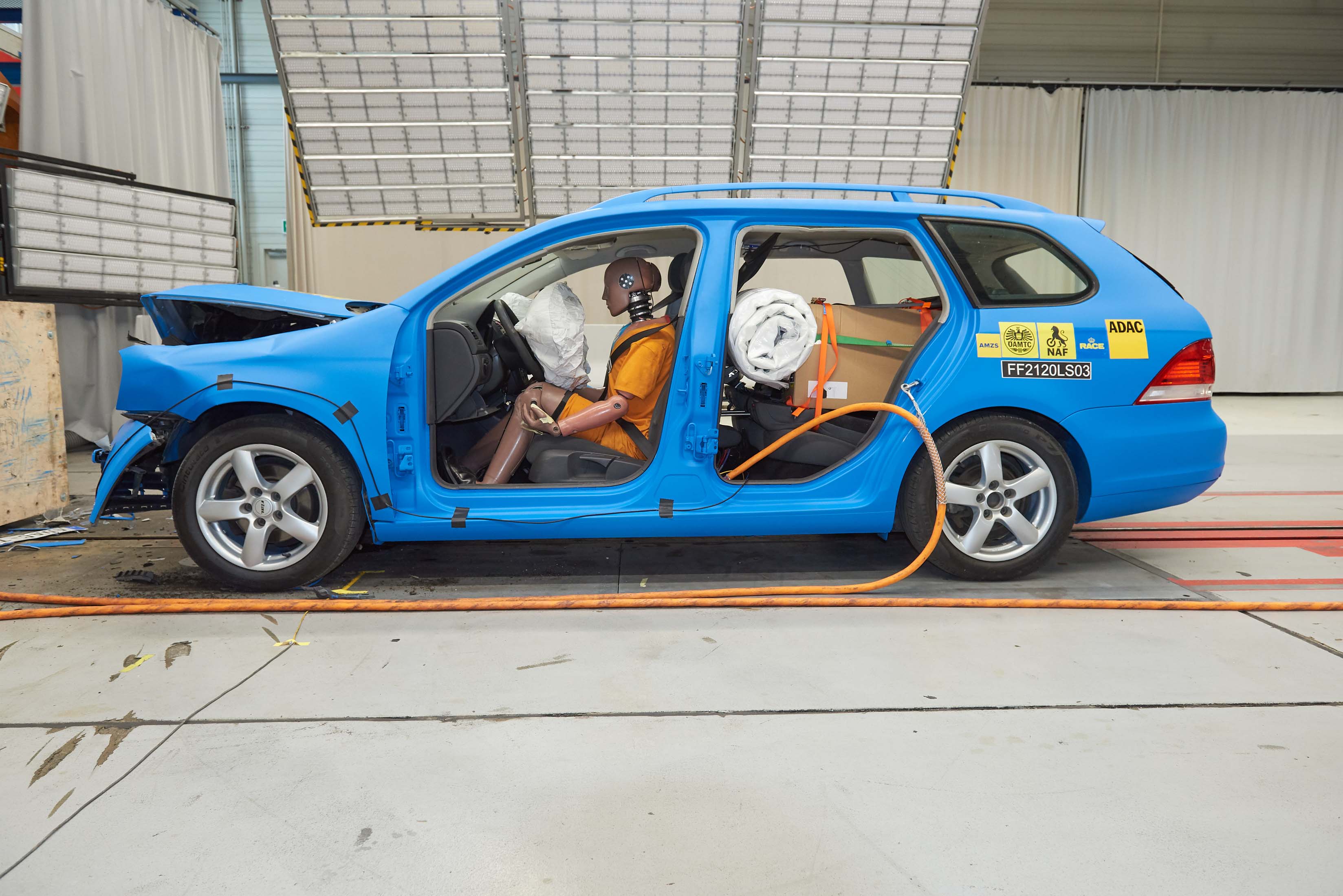 Tokrat varnostnega trka z naloženim tovorom nismo izvedli na saneh z vnaprej določenim pojemkom hidravlične zavore. Za test smo izbrali dva identična serijsko izdelana srednje velika družinska karavana z veliko prostora za prtljago. Izbrali smo dva golfa pete generacije in v enega pravilno z elementi za pritrjevanje ter v drugega nepravilno brez ustreznega pritrjevanja naložili 145 kilogramov pohištvenih paketov znamke Ikea in druge drobne opreme za dom. Celotna masa avtomobila je pri obeh varnostnih trkih skupaj s tovorom, dvema preskusnima lutkama (2 x 80 kg) in opremo za meritve ter snemanje, znašala 1570 kg. Oba golfa smo s hitrostjo 45 km/h čelno, s celotno površino prednjega dela zaleteli v togo oviro - steno. Tak trk povzroči nekoliko manjšo deformacijo karoserijskih struktur, ki razpršijo sproščeno kinetično energijo, a hkrati povzroči močnejši pojemek. Tovrstna nesreča je sicer v vsakdanjem prometu malo verjetna, a za prikaz nevarnosti pri prevozu tovora smo dosegli zelo velik pojemek - 48 g pri nepravilno naloženem tovoru in 45 g pri pravilno naloženem in pritrjenem tovoru.
