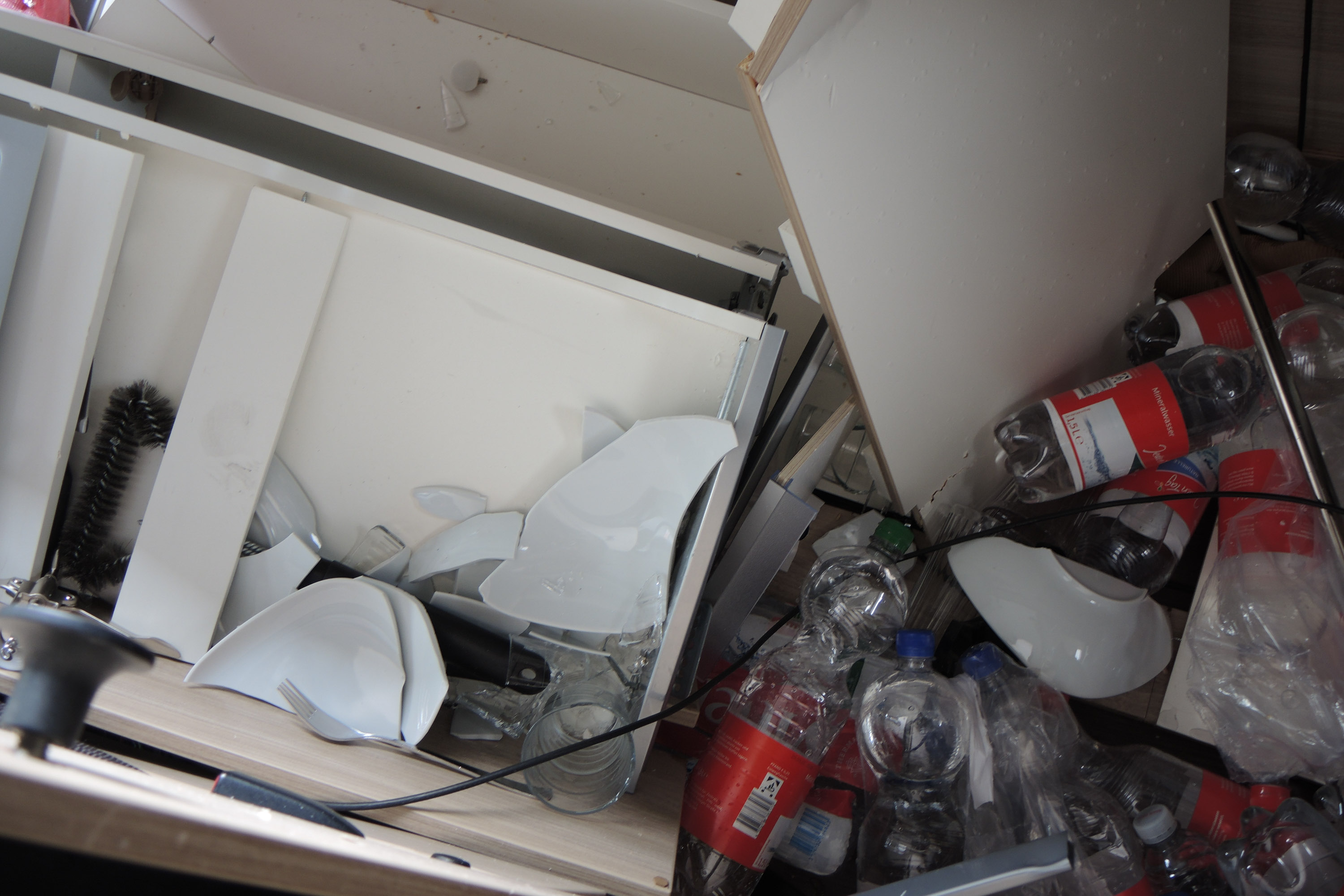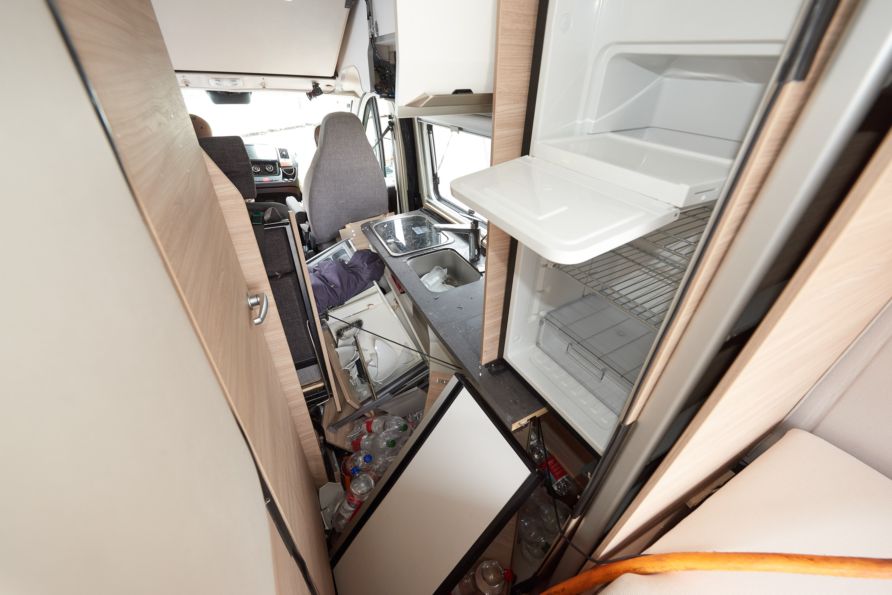 Bivalna nadgradnja je razmeroma dobro vzdržala obremenitve ob trku. Obe dvojni postelji - zadaj in v povišani podstrehi -, kopalnica, prečno nameščena boksa pod zadnjo posteljo in pritrjen tovor v prtljažniku niso predstavljali nobene nevarnosti za potnike v avtodomu. Zgledno je svojo nalogo opravil tudi varnostni sistem plinske napeljave za kuhanje in ogrevanje, saj je ob trku varnostni ventil prekinil oskrbo s plinom in tako zmanjšal nevarnost požara. Najbolj poškodovani so bili kuhinjski elementi, ki so med seboj povezani le z lesnimi vijaki. Sila trka je odtrgala kuhinjske predalčnike pod pultom. Posoda in živila so poletela vse do naslonjala voznikovega sedeža, polomljeno kuhinjsko pohištvo pa je še dodatno blokiralo poškodovana drsna vrata. Tako kot ostali elementi bivalne opreme bi tudi kuhinja morala biti močneje pritrjena v karoserijo.