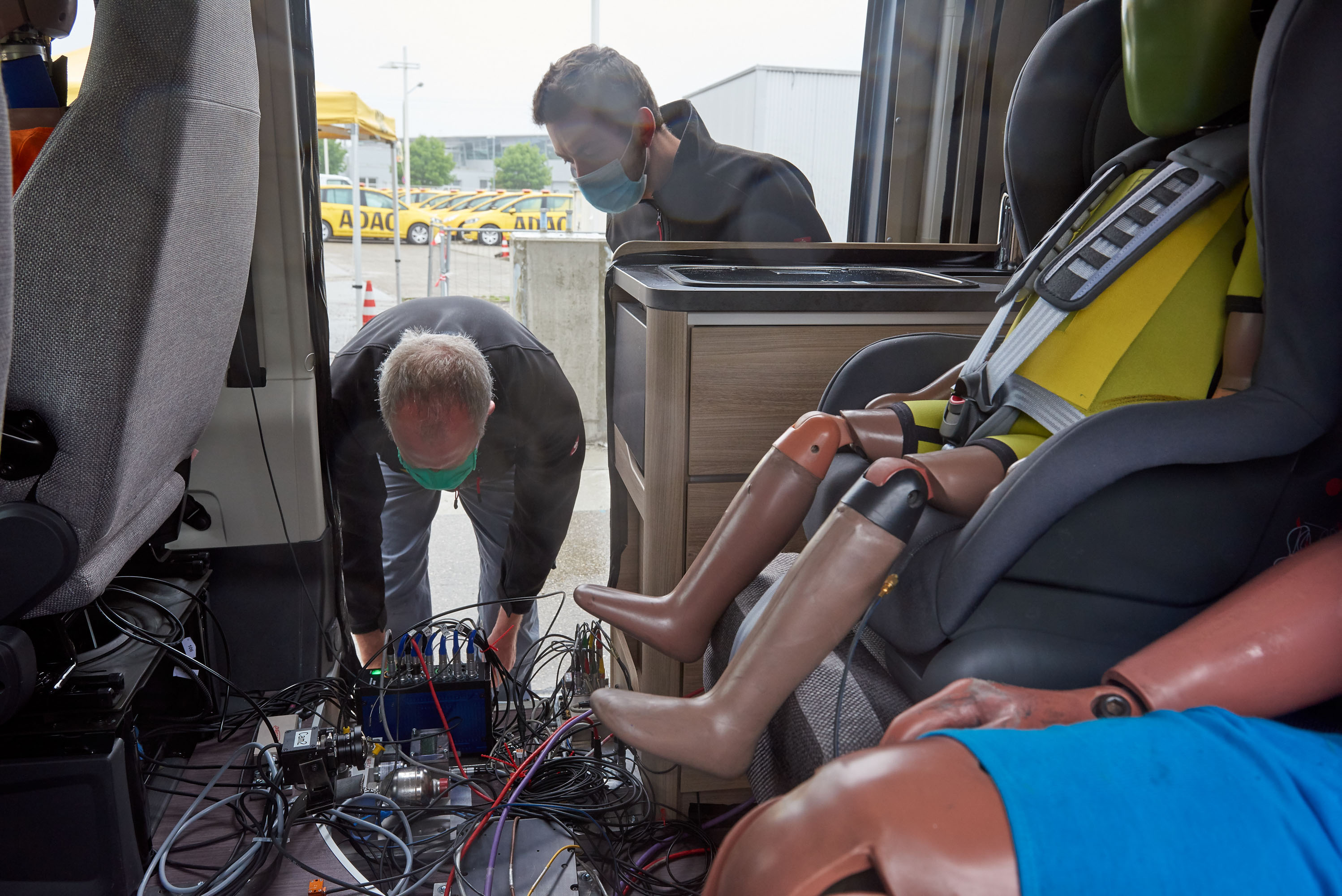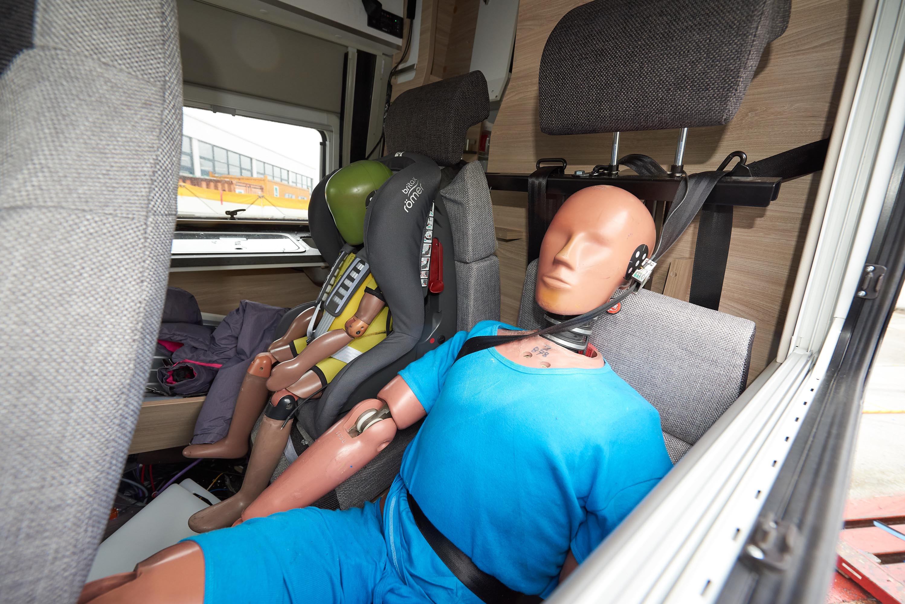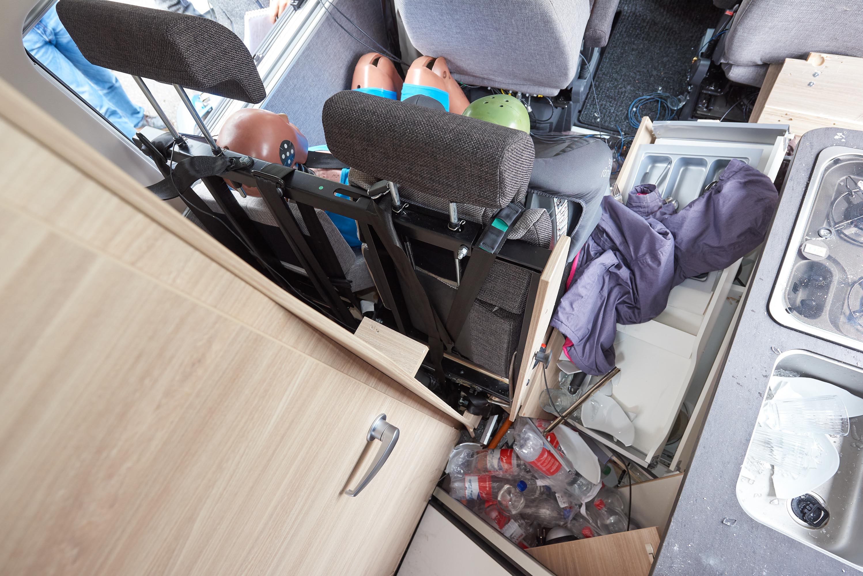 Pri bivalni opremi avtodoma se je kot najšibkejši člen izkazala lesena konstrukcija sedežne skupine za prevoz potnikov. Ta se je zaradi sile trka pod težo potnikov sesula. Zaradi zrušitve nosilne konstrukcije sedala sta obe lutki po nesreči obstali pod drugačnim kotom. Obe lutki sta pri odboju zgrešili naslonjali za glavo in udarili v kovinski okvir. To predstavlja veliko tveganje za hude poškodbe glave. Pri odraslem potniku je prišlo tudi do nevarne potopitve telesa in celo do potencialnega tveganja, da bi se varnostni pas zarezal v predel trebuha in povzročil hude poškodbe z močno krvavitvijo.
