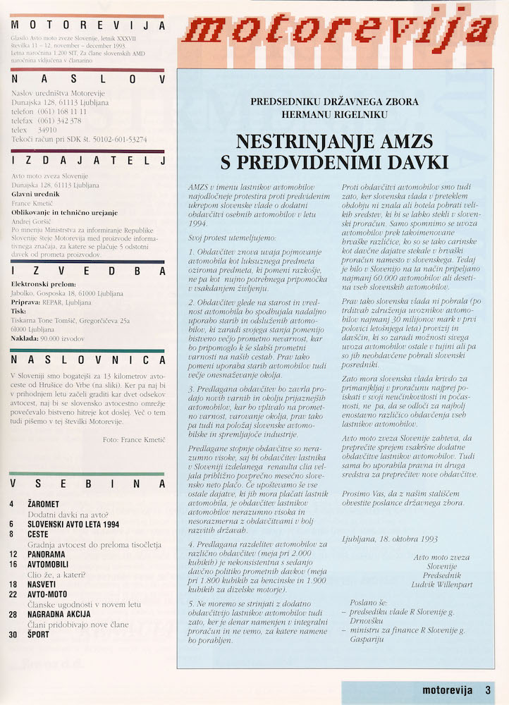 AMZS v imenu lastnikov avtomobilov najodločneje protestira proti predvidenim ukrepom slovenske vlade o dodatni obdavčitvi osebnih avtomobilov v letu 1994. AMZS zahteva, da preprečite sprejem vsakršne dodatne obdavčitve lastnikov avtomobilov. Tudi sama bo uporabila pravna in druga sredstva za preprečitev nove obdavčitve. Predsednik AMZS Ludvik Willenpart. (november – december 1993)