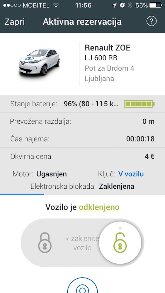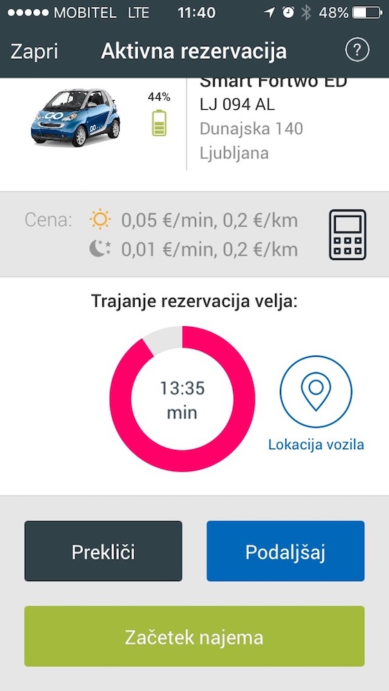 Ko torej izberemo avto, ki nam je najbližje, ga prek mobilne aplikacije rezerviramo – predvsem zato, da ga nam na poti do avta ne bi odpeljal kak drug uporabnik. Rezervacija velja le 15 minut – dolgoročne rezervacije, na primer za naslednji dan ali teden, niso možne. S tem so pri Avantcarju učinkovito omejili uporabo njihovih avtomobilov na kratkotrajne, impulzne vožnje, ki jih uporabnik ne more načrtovati. Ko rabiš avto, se pač začneš ozirati po razpoložljivem avtu, ga rezerviraš in tudi hitro odpelješ.