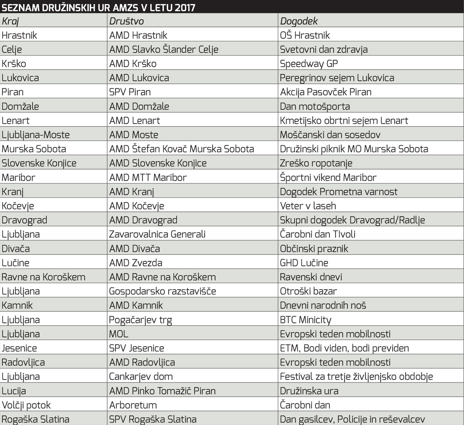 Tudi letos je bila ekipa, ki pripravlja in vodi Družinsko uro AMZS, zelo dejavna. Do sredine oktobra so v sodelovanju z lokalnimi avto-moto društvi in klubi ter na povabilo šol, občinskih svetov za preventivo in vzgojo v cestnem prometu, občin, podjetij in drugih organizatorjev pripravili 29 prireditev po vsej Sloveniji (natančen seznam objavljamo v preglednici).
