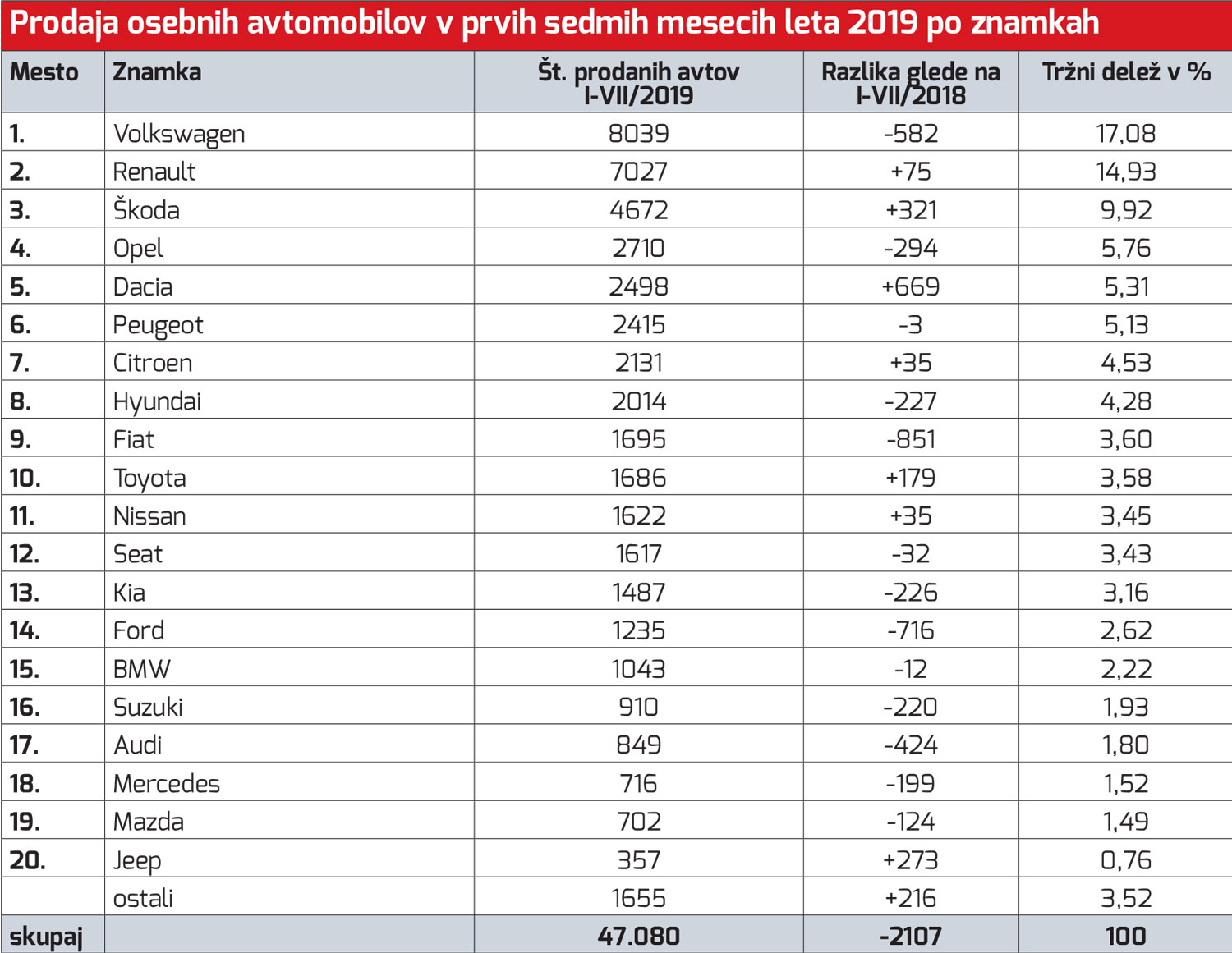 Vrstni red med znamkami najbolje prodajanih avtov se ni veliko spremenil: še naprej je vodilni Volkswagen pred Renaultom, na tretjem mestu je Škoda, ki je še največ pridobila v prvih sedmih mesecih. Občutno je nazadoval Ford. Podrobnejši rezultati so vidni v tabeli.