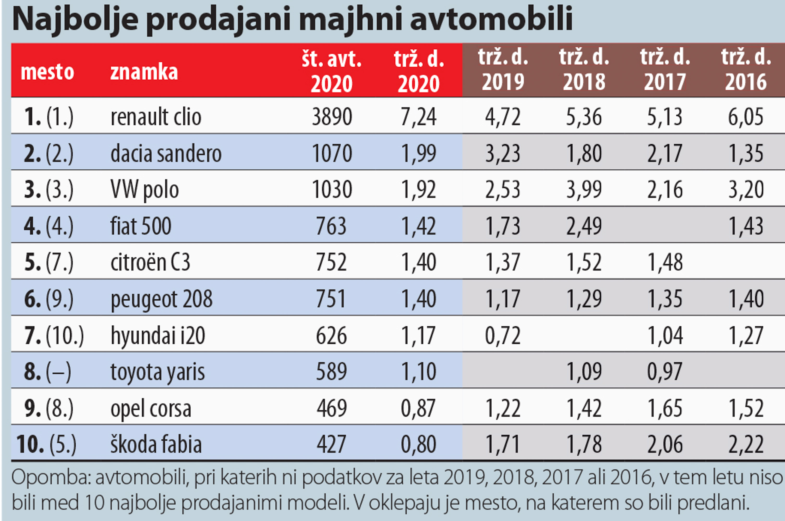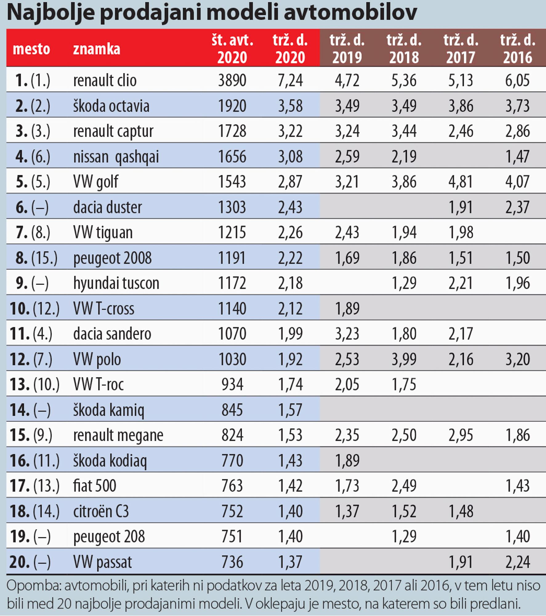 Renault clio je bil tudi v letu 2020 najbolje prodajan model osebnega avtomobila na slovenskem trgu. Avto, ki je dobil tudi priznanje Slovenski avto leta 2020, je dosegel izjemen uspeh na trgu, saj je bila njegova prodaja več kot še enkrat tolikšna kot prvega zasledovalca - to je bila tudi lani škoda octavia. Cliov tržni delež je znašal več kot 7 odstotkov in je porasel za 2,5 odstotne točke. Cliov uspeh je dopolnil njegov tehnični bratranec captur, ki je tako kot leta 2019 na tretjem mestu. Prvo peterico zaokrožujeta nissan qashqai in VW golf, ki je leta 2020 doživel menjavo generacije. Na naslednjih petih mestih so cestni terenci ali križanci: dacia duster, VW tiguan, peugeot 2008, hyundai tucson in VW T-cross, kar ob že omenjenih renaultu capturju in nissanu qashqaiju dokazuje priljubljenost tovrstnih avtov med kupci.