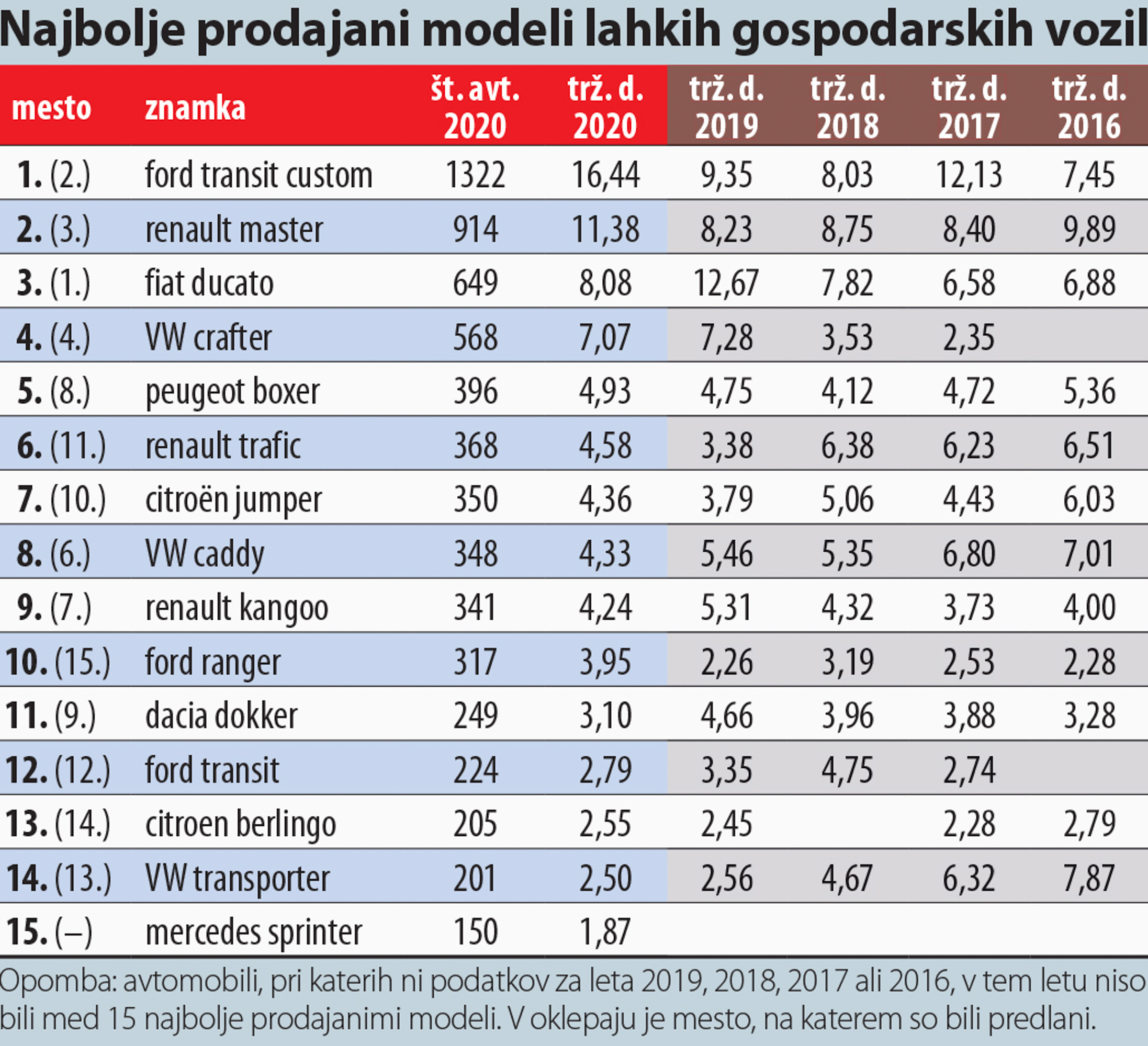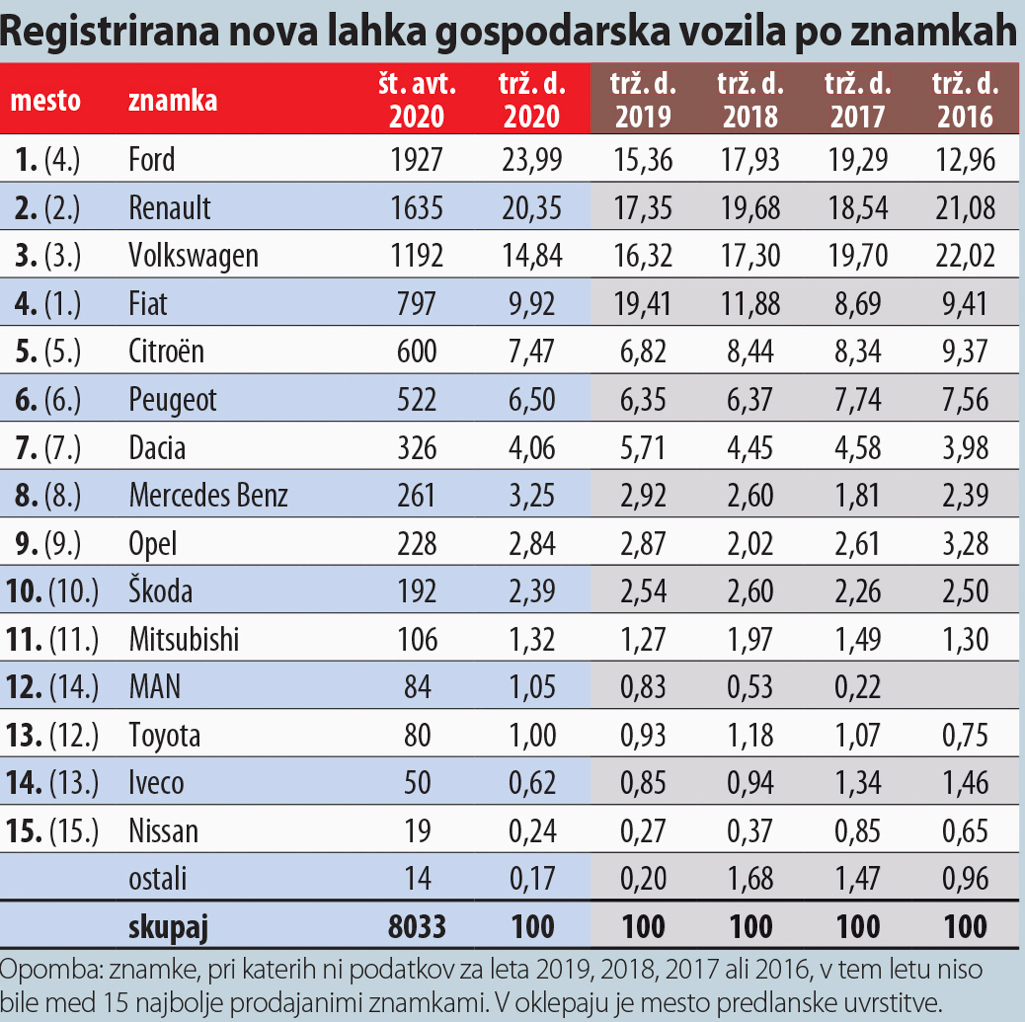 Do upada prodaje, še celo večjega kot pri osebnih avtih, je prišlo tudi pri lahkih gospodarskih vozilih. Vodilni prodajalec na trgu je postal Ford, ki je imel dobro odstotno točko manj kot četrtino trga. Renault je ostal na drugem mestu, a je, tako kot Ford, tudi povečal svoj tržni delež za 3 odstotne točke. Tretji je ostal Volkswagen, na četrto mesto pa je padel leta 2019 vodilni Fiat, ki je imel lani manj kot desetino trga. Na naslednjih mestih ni bilo večjih premikov.