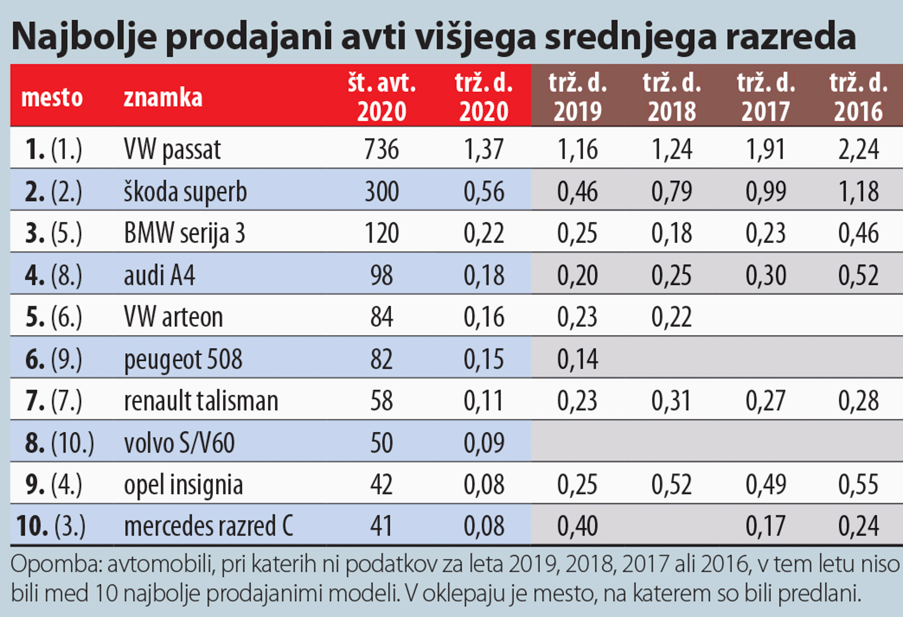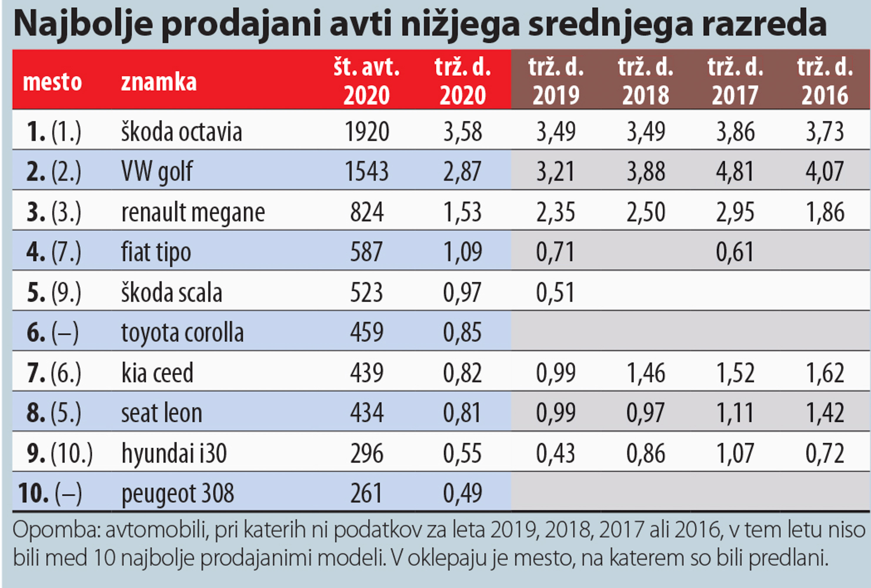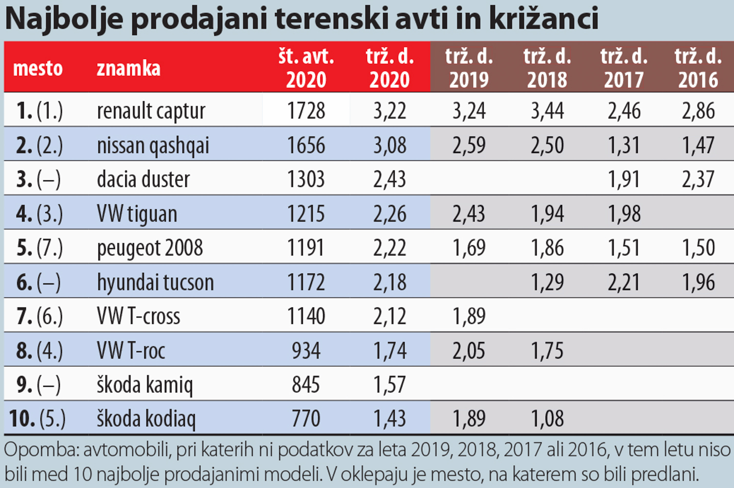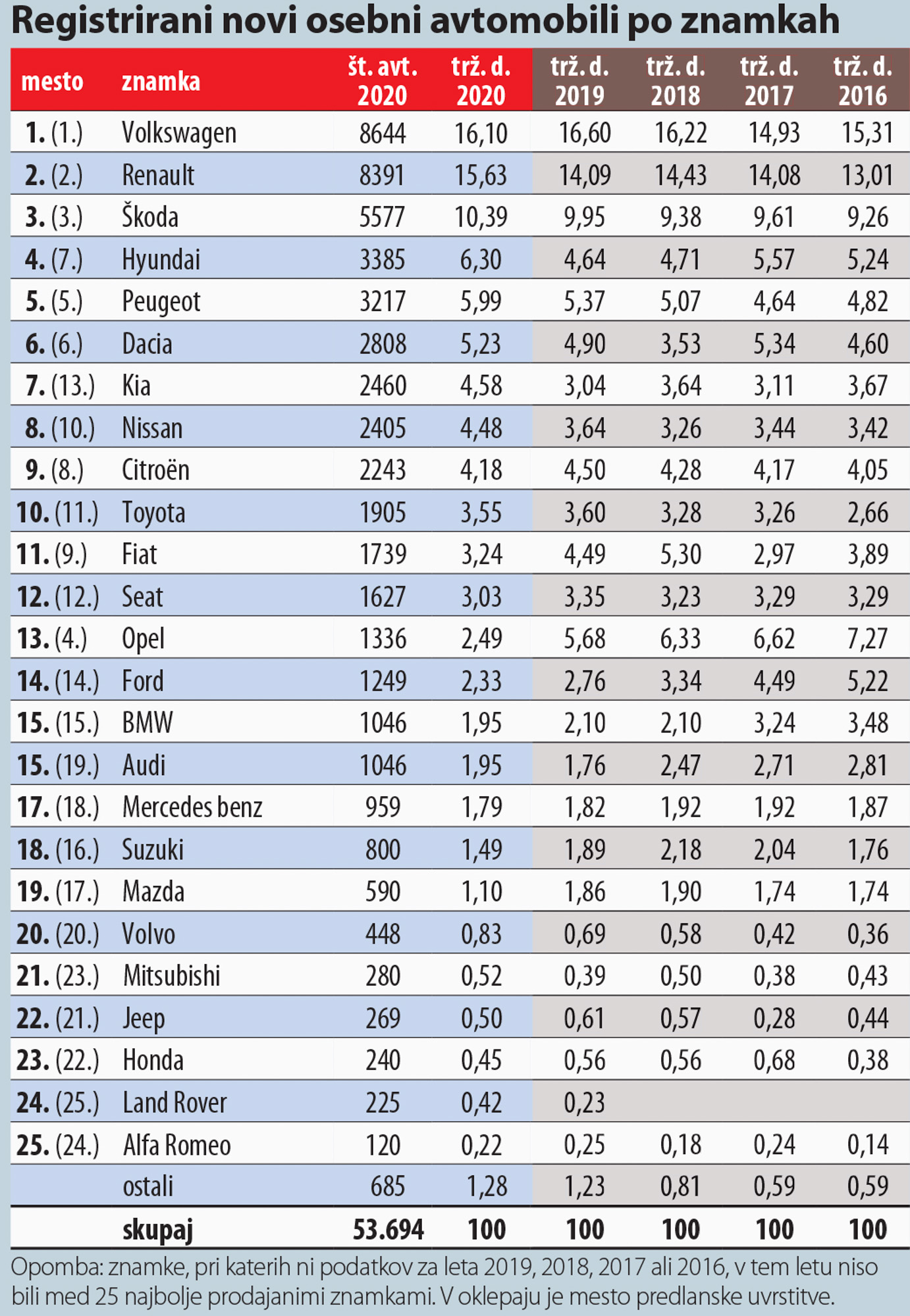Hyundai se je s široko paleto modelov povzpel na četrto mesto, njegov uspeh je dopolnila sestrska Kia, ki je napredovala na sedmo mesto in je bila edina pomembnejša znamka, ki je leta 2020 prodala več avtomobilov kot v letu 2019 - njen prirastek je bil 232 avtov. Peugeot je ostal peti, Dacia šesta. V deseterici so še Nissan, Citroen in Toyota. Največji padec je doživel Opel, ki je bil leta 2019 še četrti, tokrat pa je zdrsnil na 13. mesto. Nemška znamka je že nekaj časa v lasti koncerna PSA, kar je vplivalo na paleto modelov, na slovenskem trgu pa je prišlo tudi do organizacijskih sprememb pri prodaji - zdaj za prodajo oplov skrbi slovenska hčerinska družba madžarskega podjetja Wallis, ki sicer pri nas skrbi tudi za prodajo avtomobilov znamk Range Rover in Jaguar.