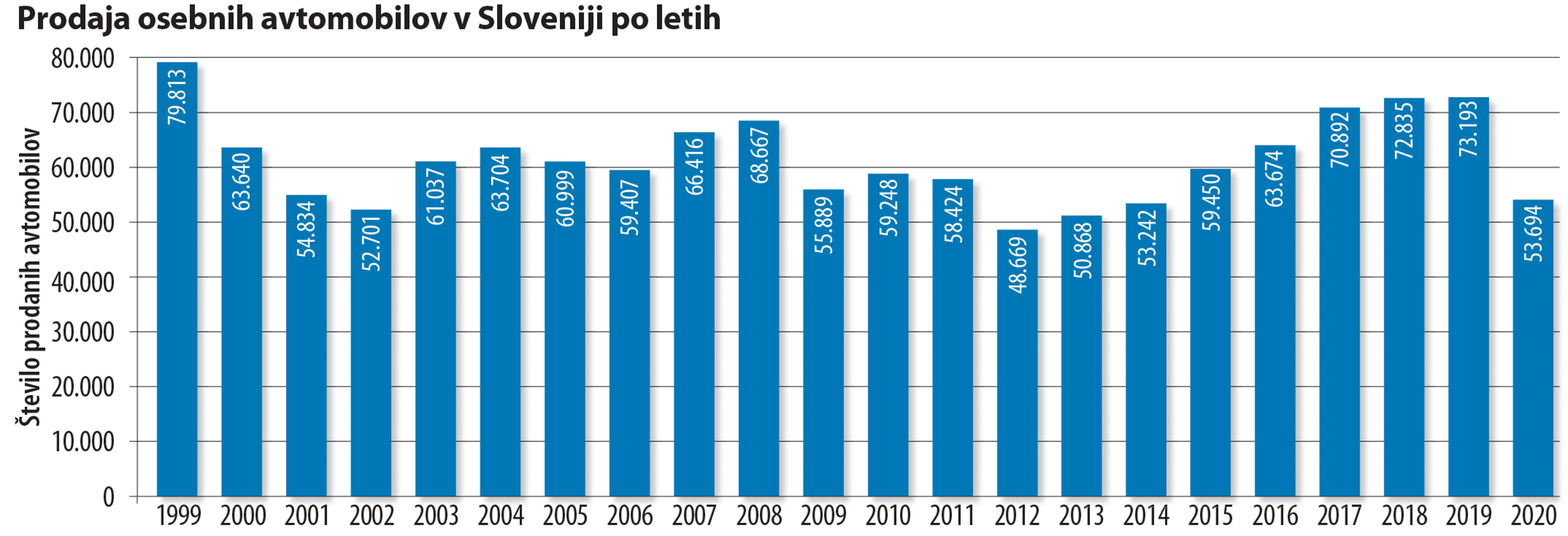 Čeprav se zdi upad prodaje izjemno velik, pa pogled v zgodovino prodaje avtomobilov na slovenskem trgu pokaže, da stanje vendarle ni tako dramatično, kot se morda zdi. Številke so resda precej nižje, kot smo jih bili vajeni v zadnjih letih, vendar je bilo v tem stoletju kar nekaj let, ko je bila prodaja še nižja kot v letu 2020. Leta 2002 je bilo na primer prodanih 52.701 osebnih avtomobilov, prodaja je bila nižja tudi v letih 2012, 2013 in 2014. Leta 2012 je bilo namreč prodanih le 48.669 osebnih avtomobilov, leta 2013 50.868, leta 2014 pa 53.242 osebnih avtomobilov. Ob tem ne gre spregledati, da je slovenski avtomobilski trg zasičen in da gre pri prodaji predvsem za zamenjavo obstoječega voznega parka, ne pa za absolutno povečevanje števila vozil.