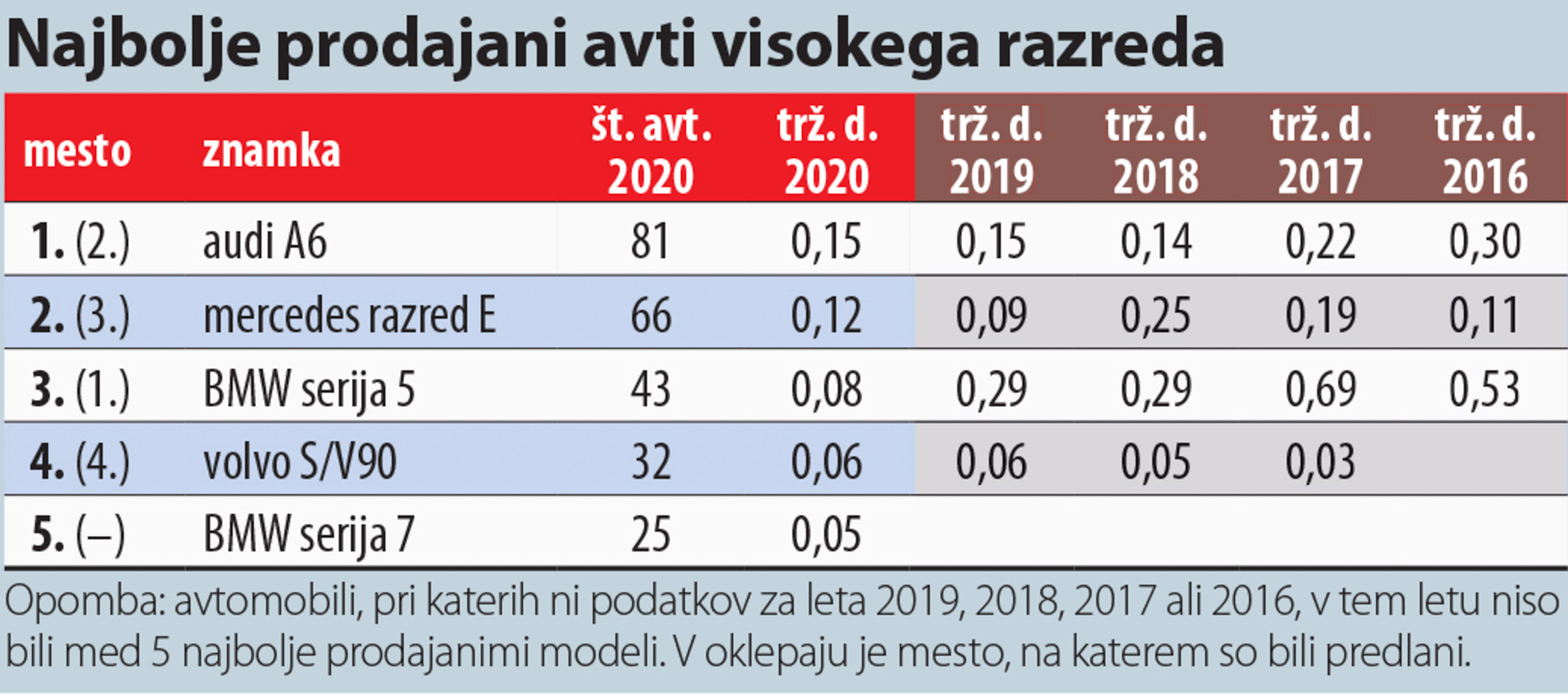 Med prestižnimi znamkami je prišlo do mrtvega teka med Audijem in BMW-jem, saj sta prodala enako število avtov, za manj kot sto avtov pa je zaostal Mercedes.