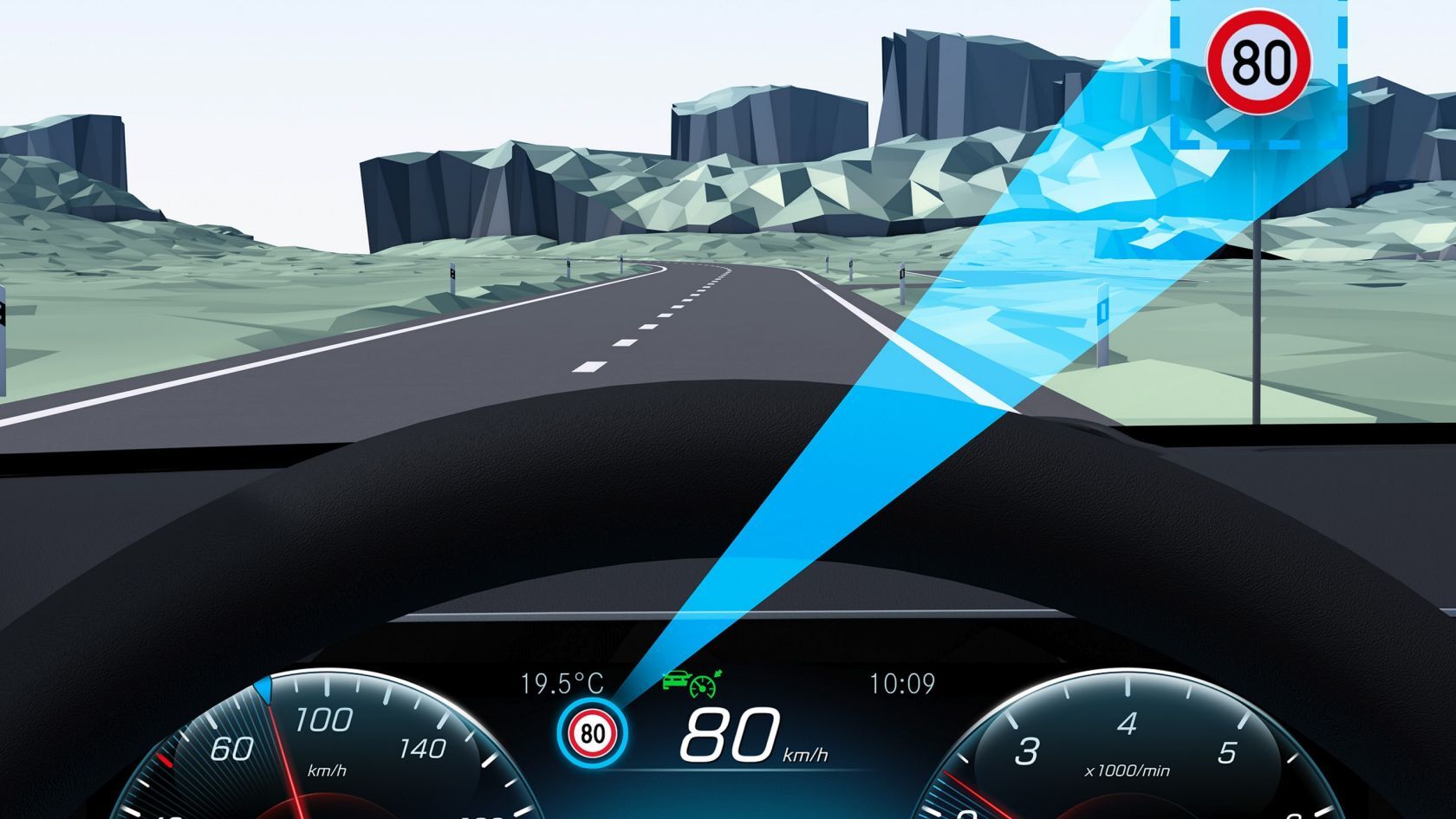 | Sistem ob pomoči kamer med vožnjo snema okolico pred avtom in na armaturni plošči prikaže posnete prometne znake z omejitvami hitrosti (in nekatere ostale). A tehnologija prepoznavanja znakov – tudi, če deluje v kombinaciji z navigacijskim sistemom, ki ima v spominu hitrostne omejitve na cesti, po kateri se vozimo – še ni dovolj zanesljiva, da bi vselej pravilno prepoznala ali posnela znak. |