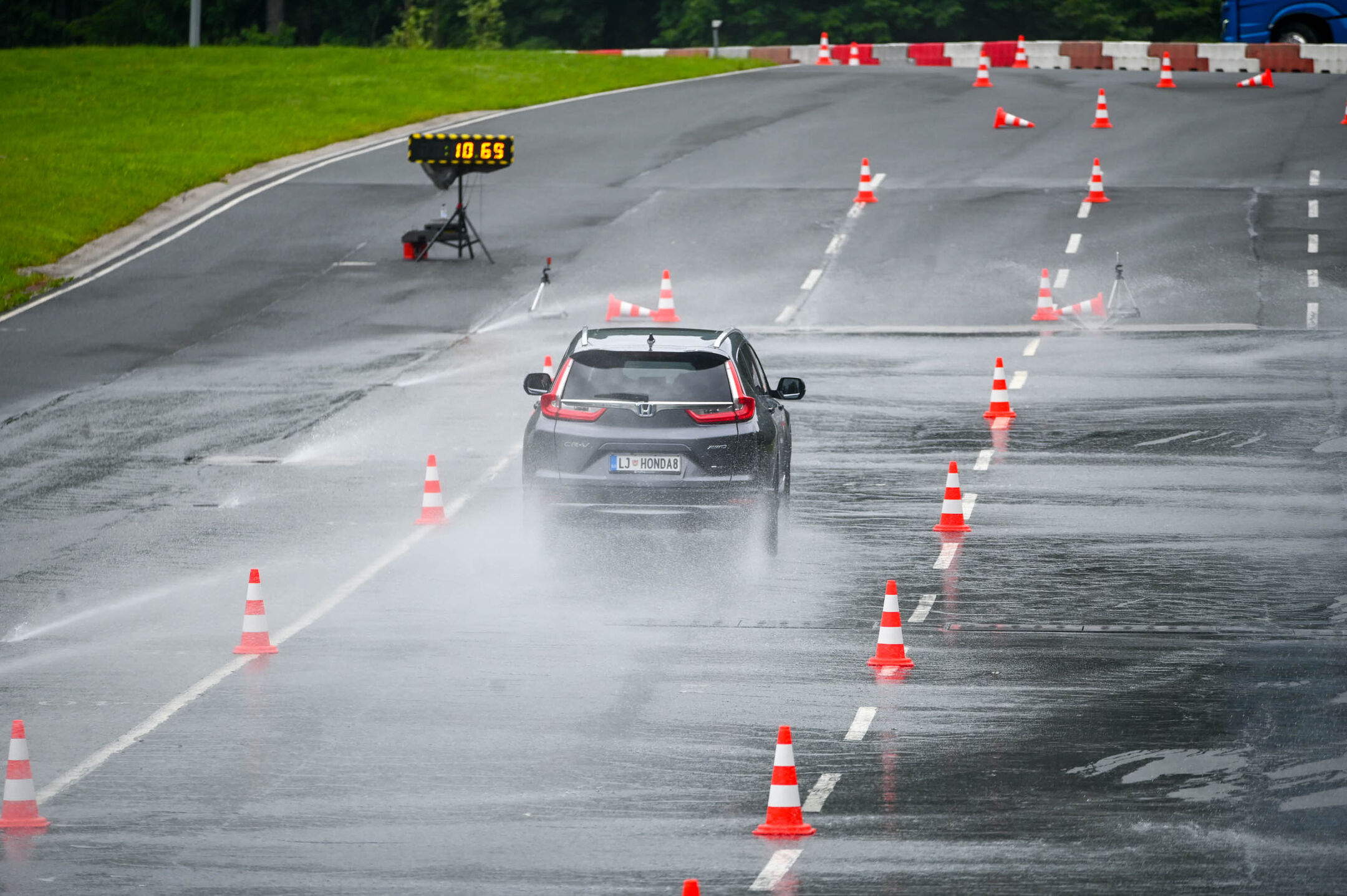 Zelo zanimiv preskus, v katerem se boste prepričali, kako avto s svojimi očmi - radarskimi tipali, kamero in drugimi tipali - zmore preprečiti nalet v drugo vozilo, ki ga predstavlja najsodobnejša naletna tarča. Tu boste lahko zaviranje v sili v nadzorovanem okolju prepustili umetni inteligenci. V drugem delu boste lahko preizkusili še temeljna sistema aktivne varnosti - ABS zavore in ESC sistem nadzora stabilnosti.