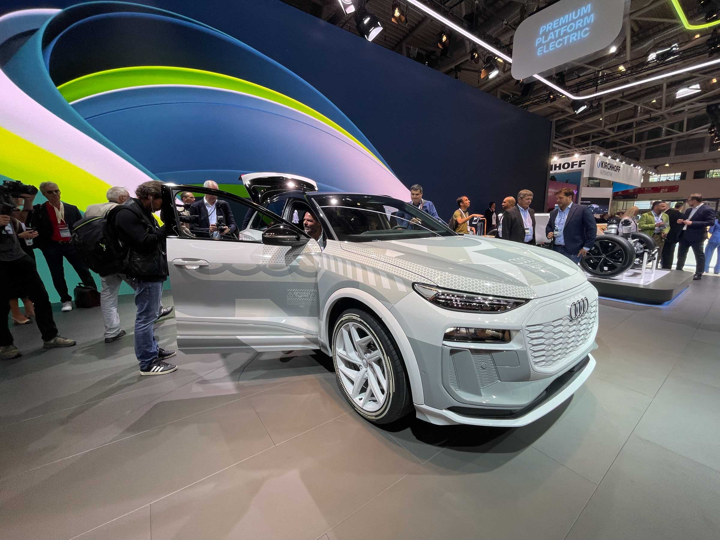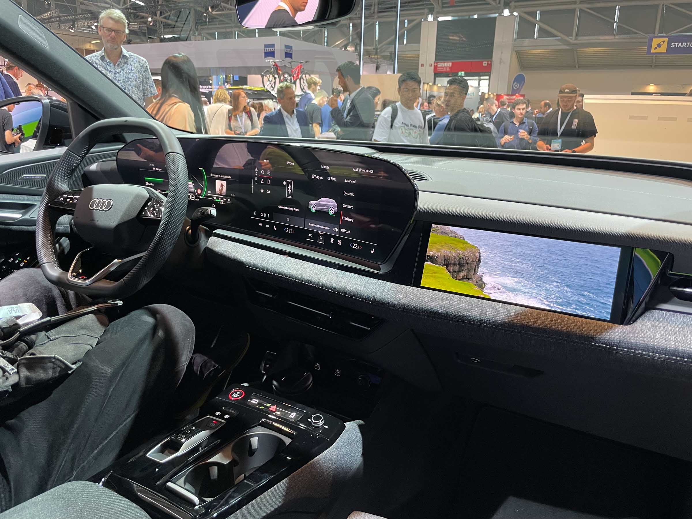 Na sosednjem Audijevem razstavnem prostoru smo videli prihajajoči Q6 e-tron v kamuflažni preobleki, ki pa je v notranjosti razkril novo zasnovo in obliko armaturne plošče - s panoramskim zaslonom, dodatnim zaslonom za sovoznika in atraktivno grafiko merilnikov. Da ta spominja na armaturno ploščo Porschejevega taycana, ni nič slabega, je pa Audi s tem potrdil, da je njegova prihodnost le še električna in digitalna.