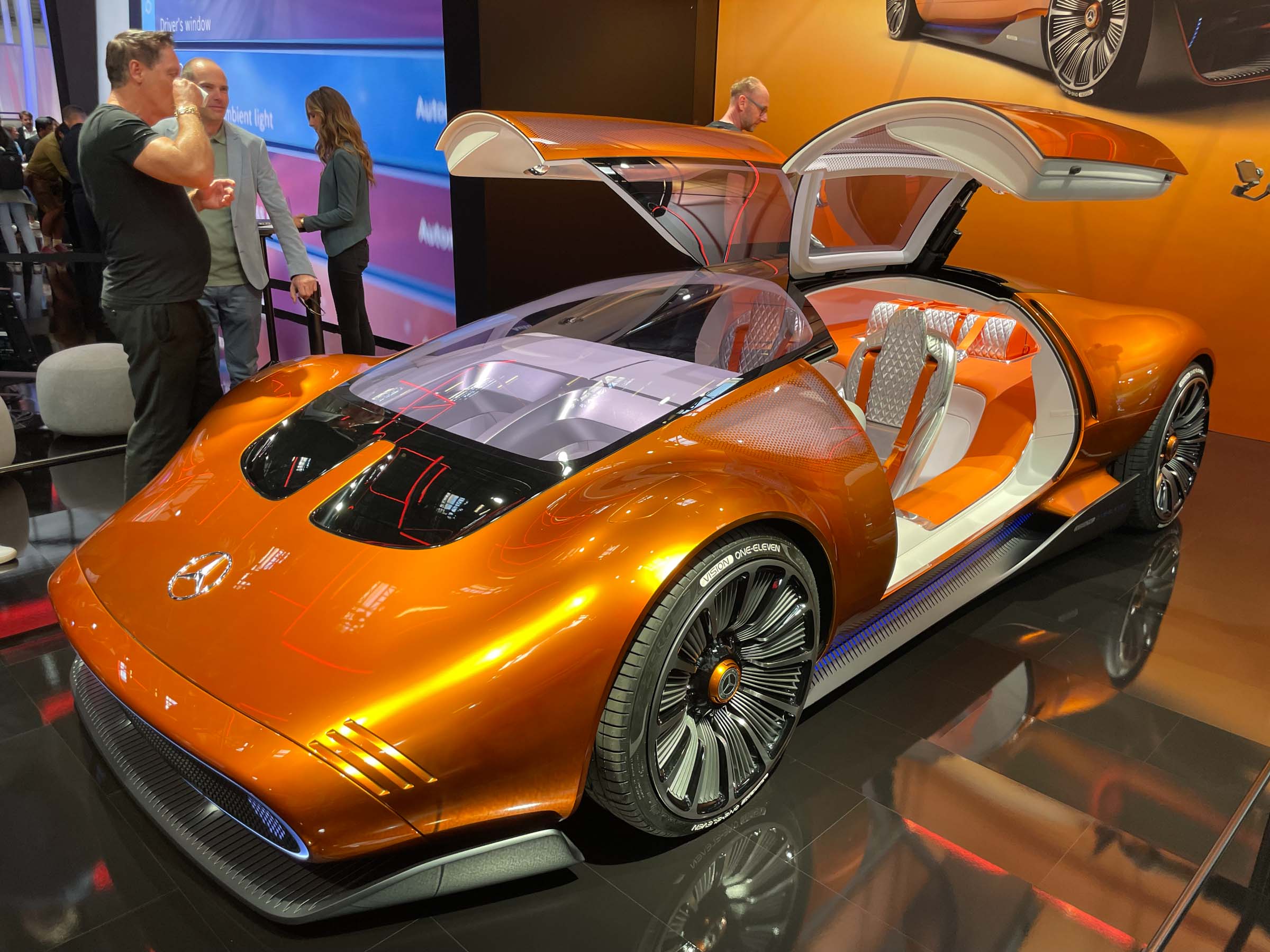 Mercedes je svoje novosti predstavil ločeno: na sejmišču je pozornost plenil prototip vision one eleven, superšportnik po vzoru na legendarni C111, na zunanjem razstavišču pa je bil v ospredju prototip nove kompaktne električne limuzine CLA, ki opozarja na novi Mercedesov oblikovalski jezik. Gre za zelo všečen električni avto z 800-voltno arhitekturo, 750- kilometrskim dosegom, porabo energije 12 kWh/100 km, dvostopenjskim menjalnikom in močjo 238 KM.