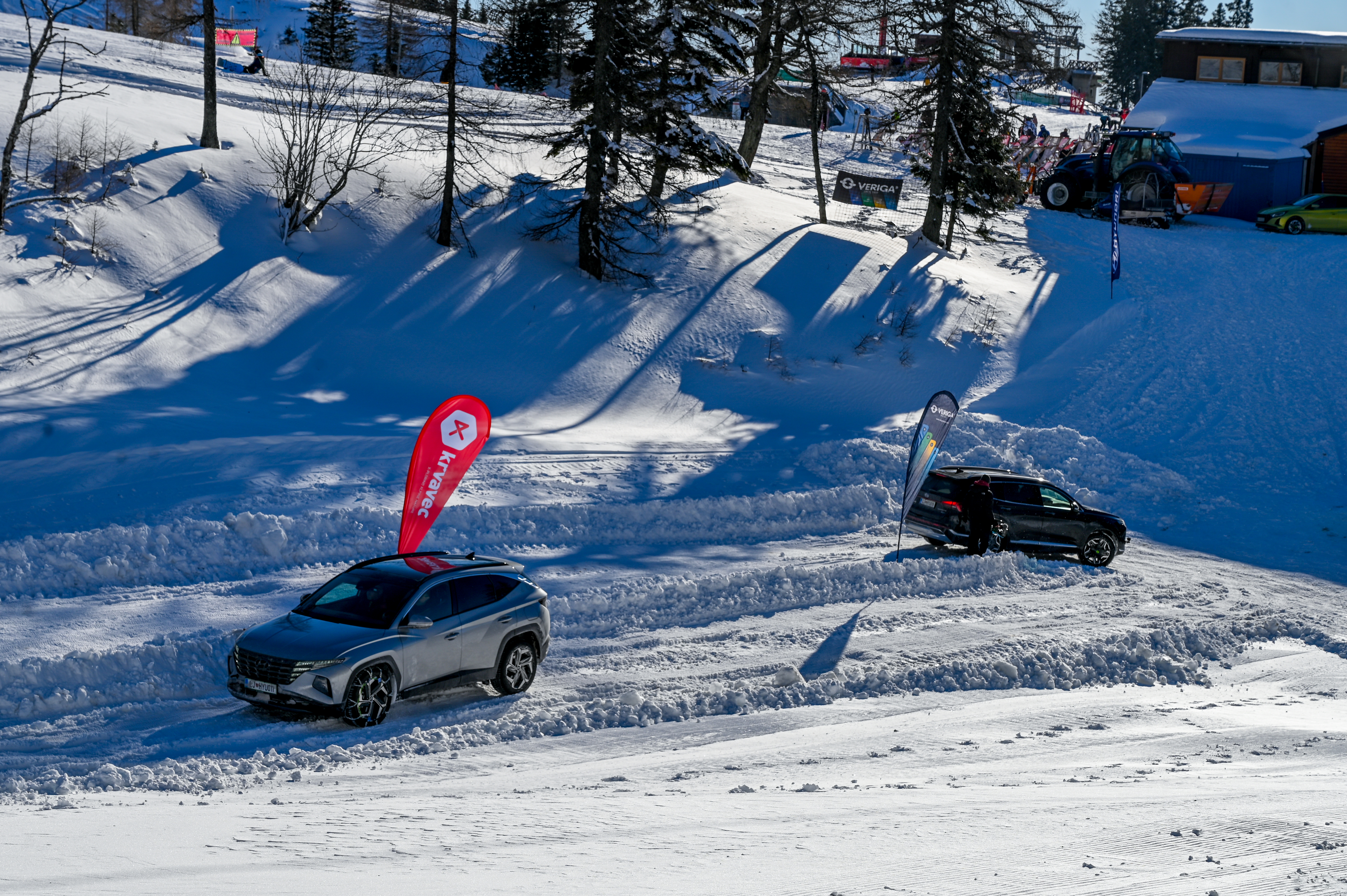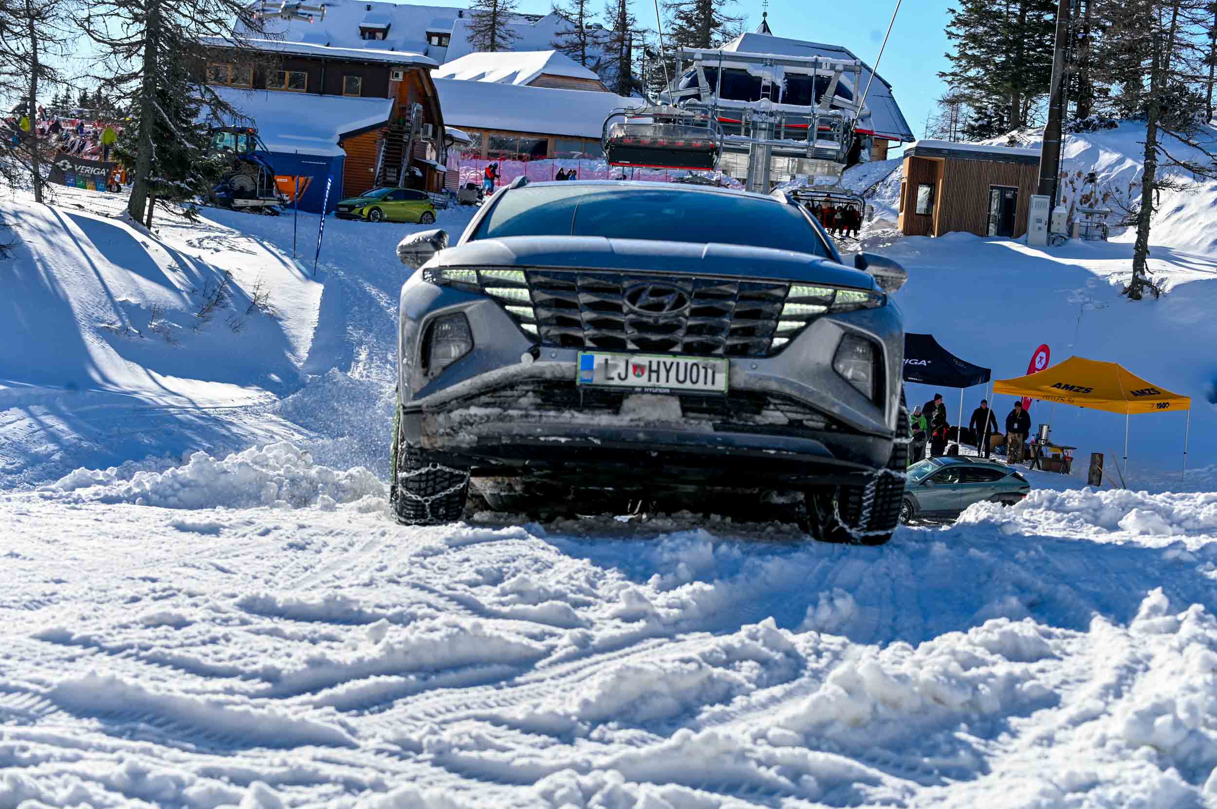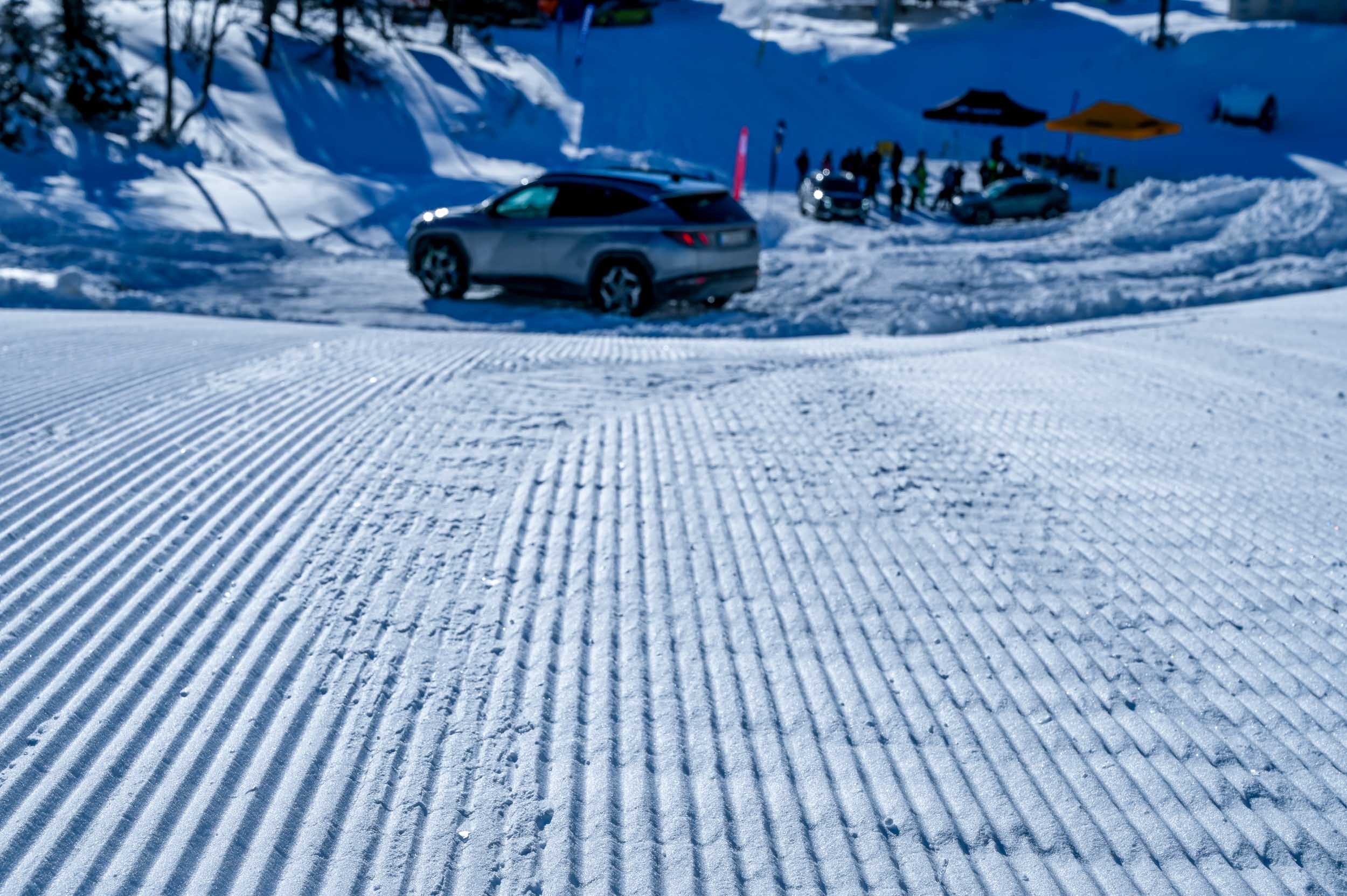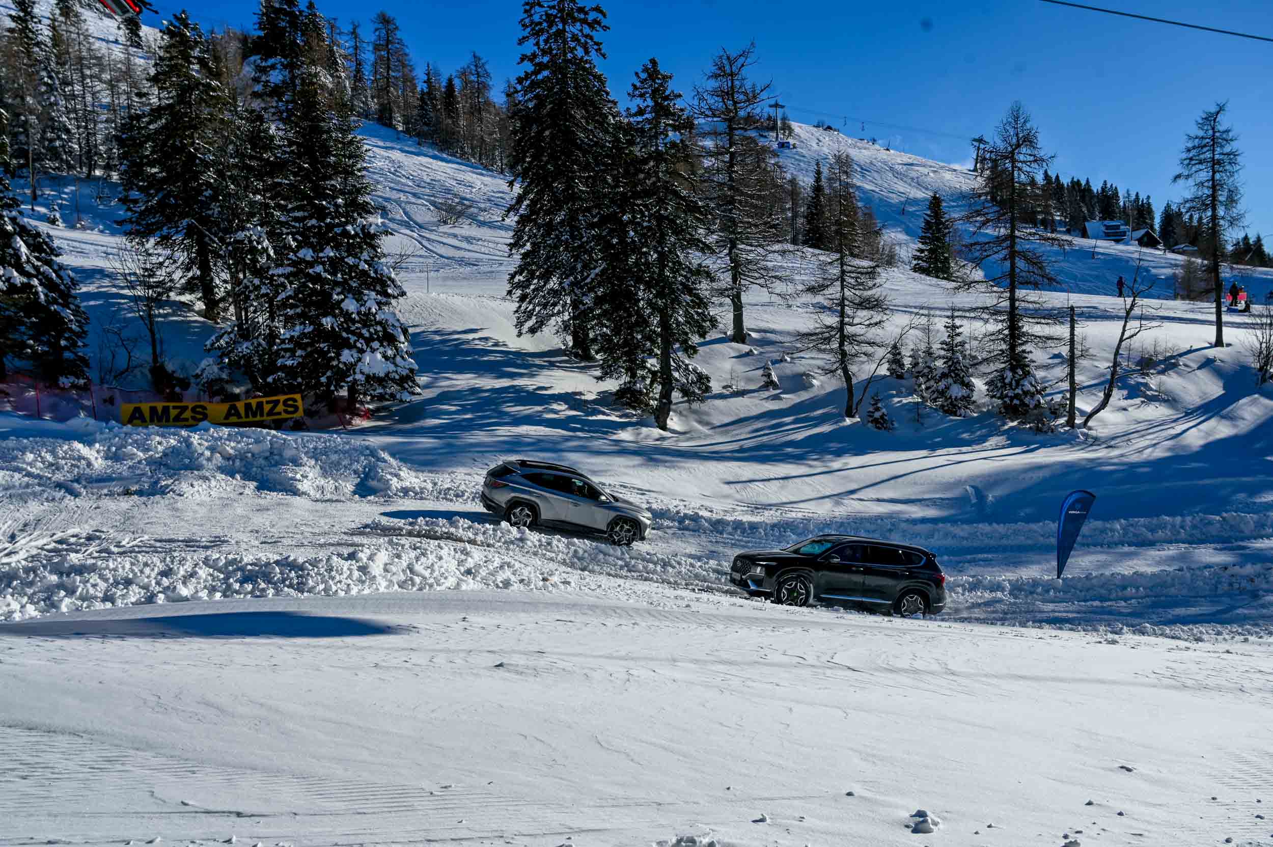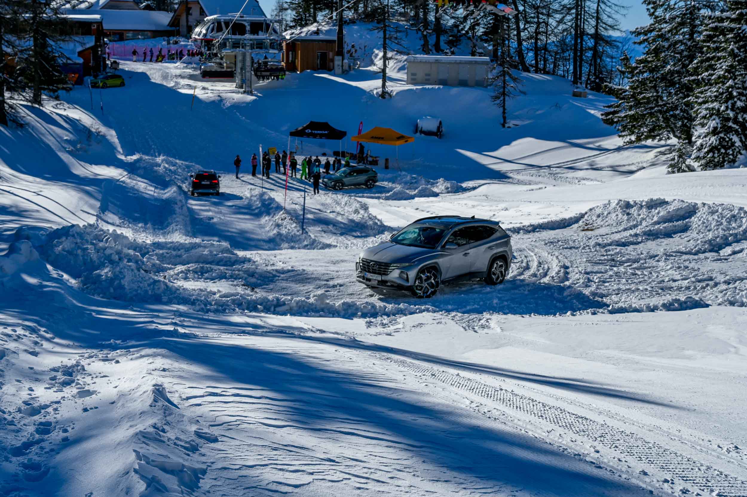 A silovit vdor zime sredi januarja nam je postregel najprej s precejšnjo snežno odejo, že naslednji dan pa tudi s polarnimi temperaturami, kar je seveda ustvarilo odlične zimske razmere, a tudi kar nekaj dodatnega dela, da smo lahko zasneženo kotanjo pod spodnjo postajo nove šestsedežnice Zvoh na Krvavcu uredili tako, da smo vanjo lahko pripeljali avtomobile. Sneg je seveda nujna sestavina zimskega vozniškega doživetja, a če ga je preveč, se po njem ne da voziti z avti - tudi če gre za Hyuindaijeva cestna terenca santa-fe in tucson s štirikolesnim pogonom, večjo oddaljenostjo od tal in dobrimi zimskimi pnevmatikami na kolesih. K sreči pripravljalci smučišča na Krvavcu ne znajo poskrbeti le za steptana smučišča, pač pa tudi za dovolj utrjen vozniški poligon.
