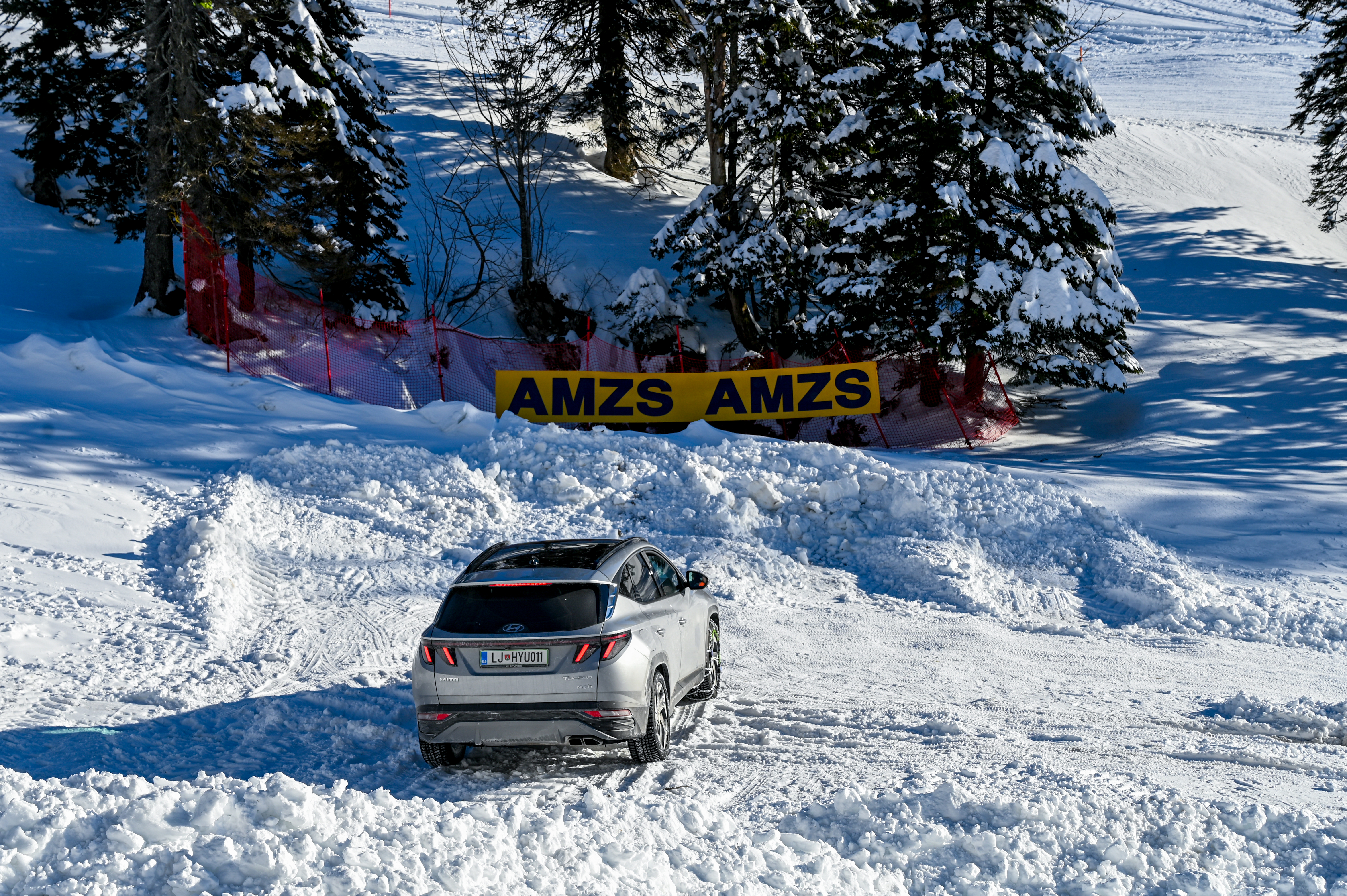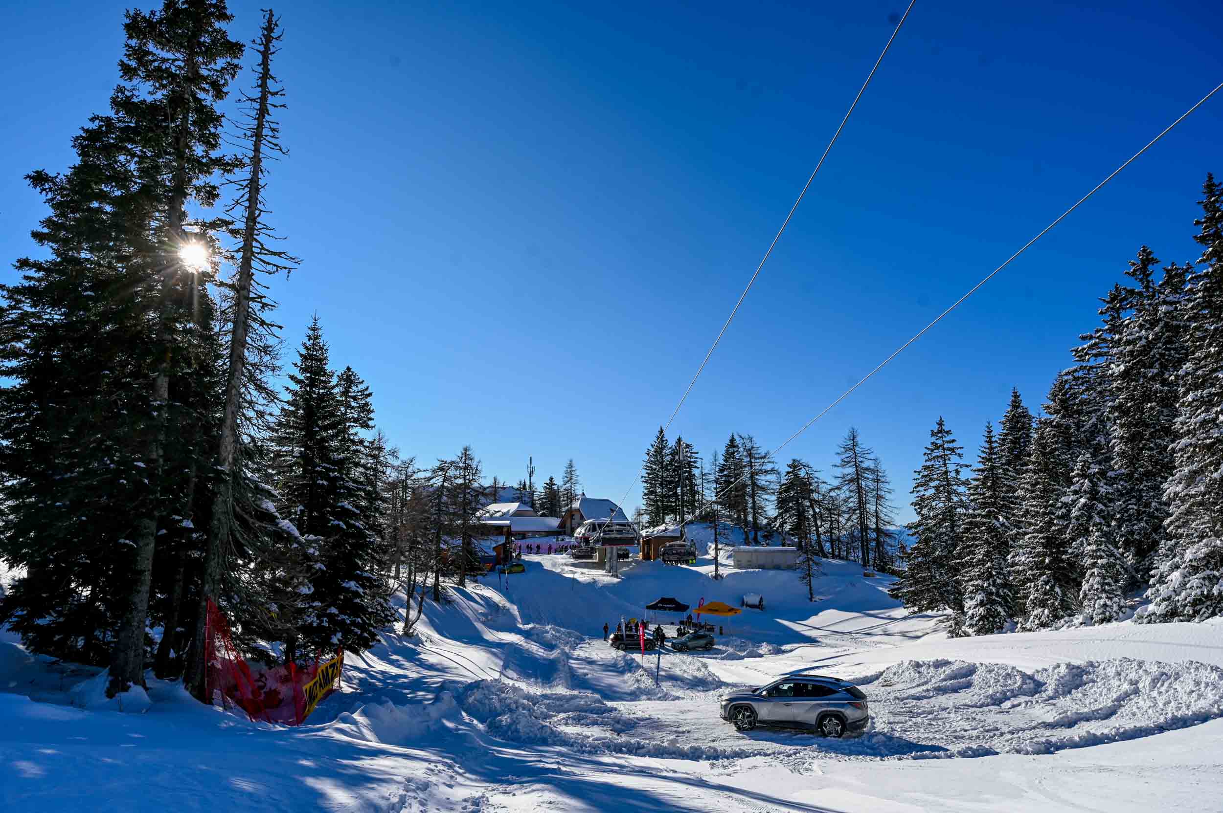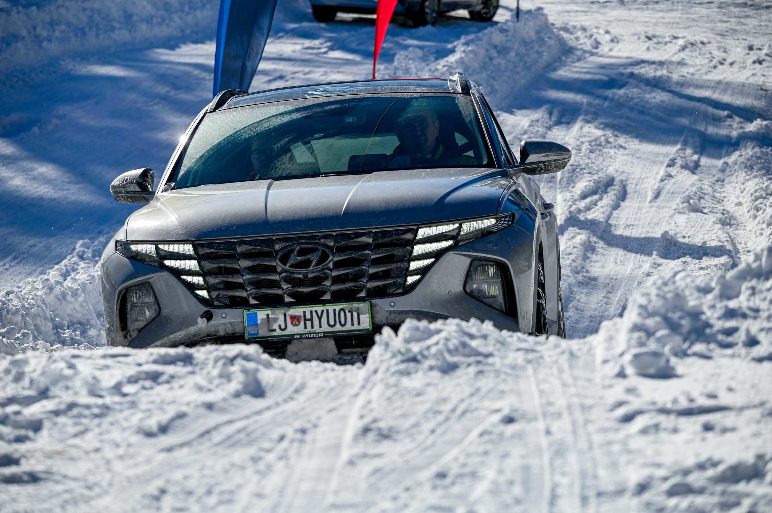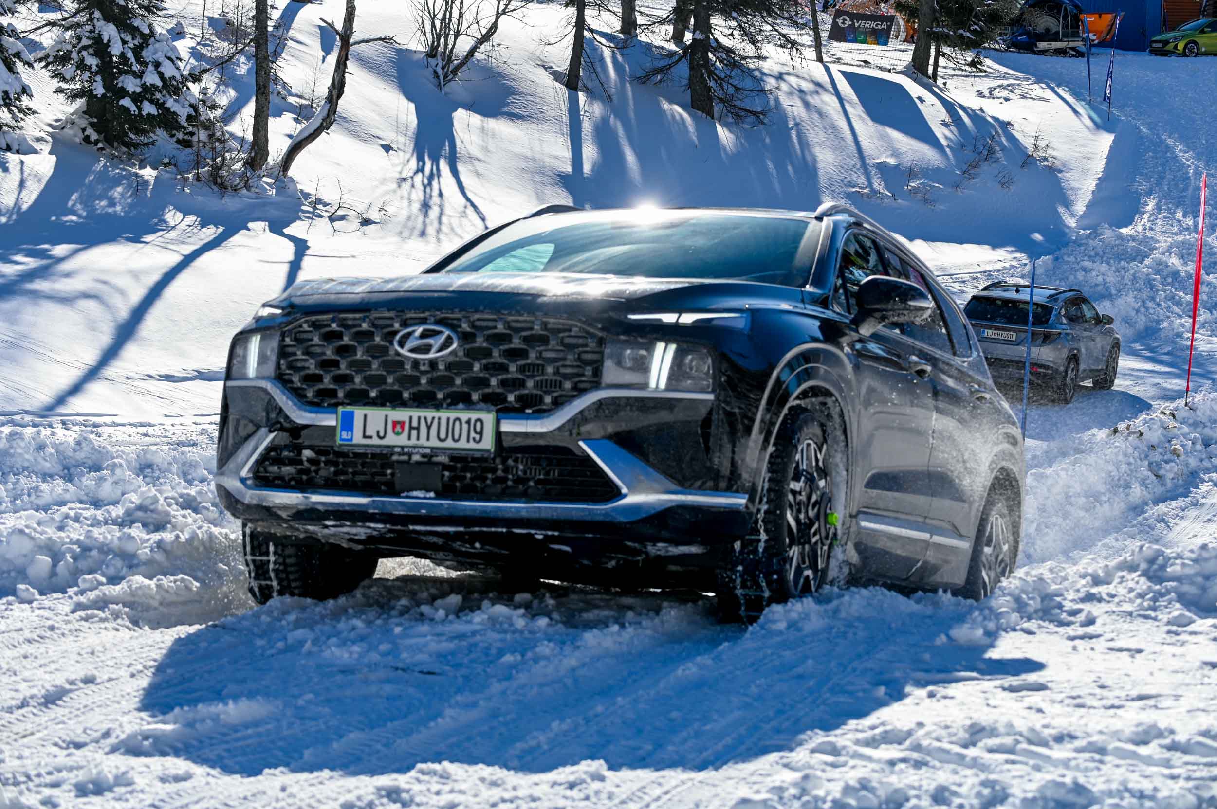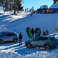 A silovit vdor zime sredi januarja nam je postregel najprej s precejšnjo snežno odejo, že naslednji dan pa tudi s polarnimi temperaturami, kar je seveda ustvarilo odlične zimske razmere, a tudi kar nekaj dodatnega dela, da smo lahko zasneženo kotanjo pod spodnjo postajo nove šestsedežnice Zvoh na Krvavcu uredili tako, da smo vanjo lahko pripeljali avtomobile. Sneg je seveda nujna sestavina zimskega vozniškega doživetja, a če ga je preveč, se po njem ne da voziti z avti - tudi če gre za Hyuindaijeva cestna terenca santa-fe in tucson s štirikolesnim pogonom, večjo oddaljenostjo od tal in dobrimi zimskimi pnevmatikami na kolesih. K sreči pripravljalci smučišča na Krvavcu ne znajo poskrbeti le za steptana smučišča, pač pa tudi za dovolj utrjen vozniški poligon.