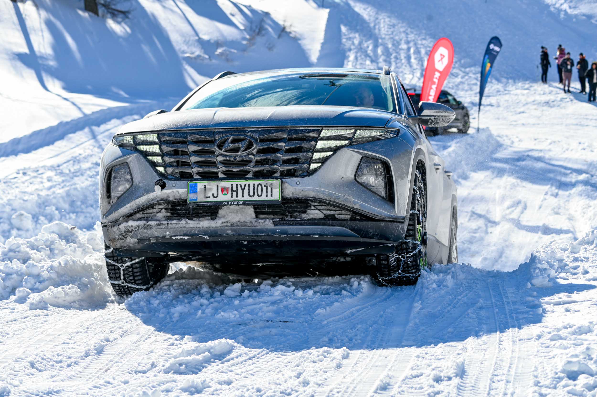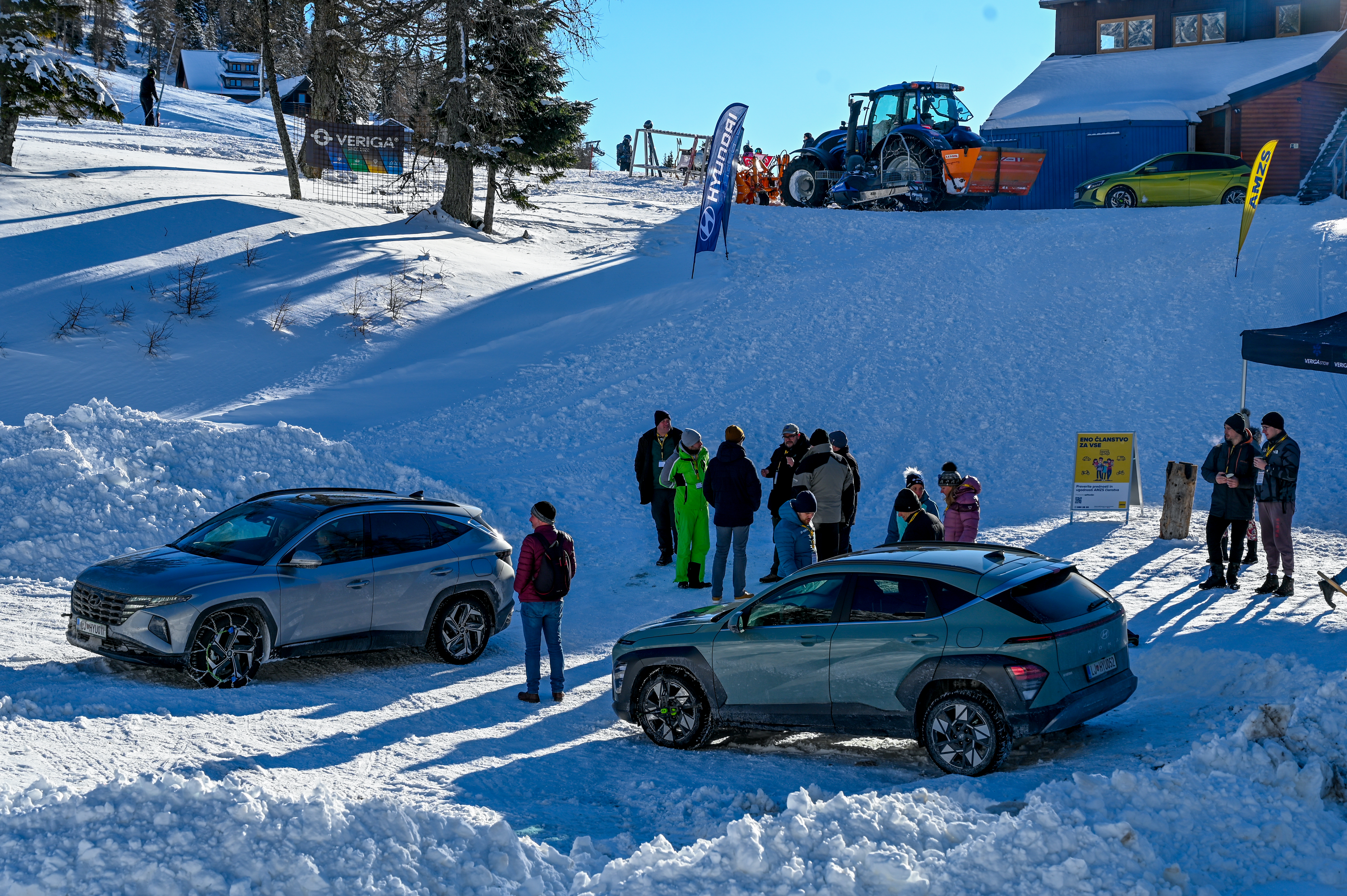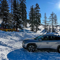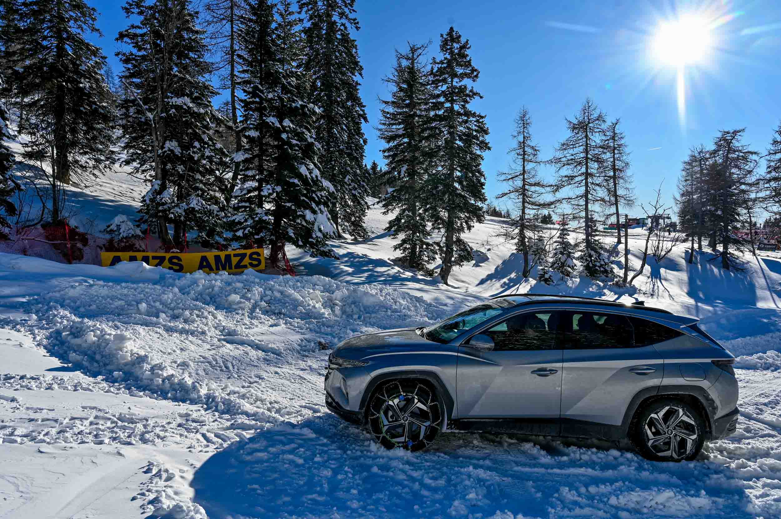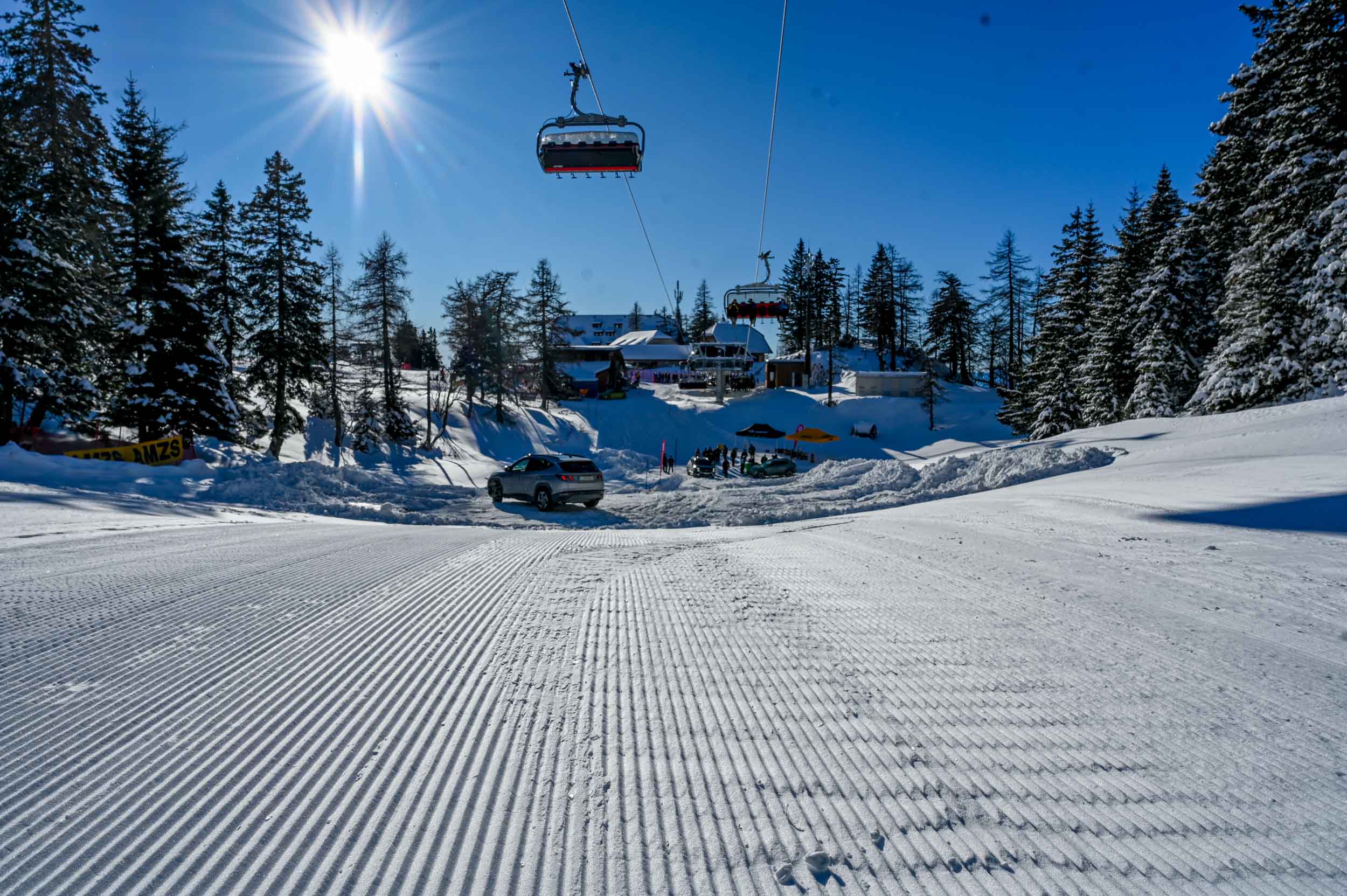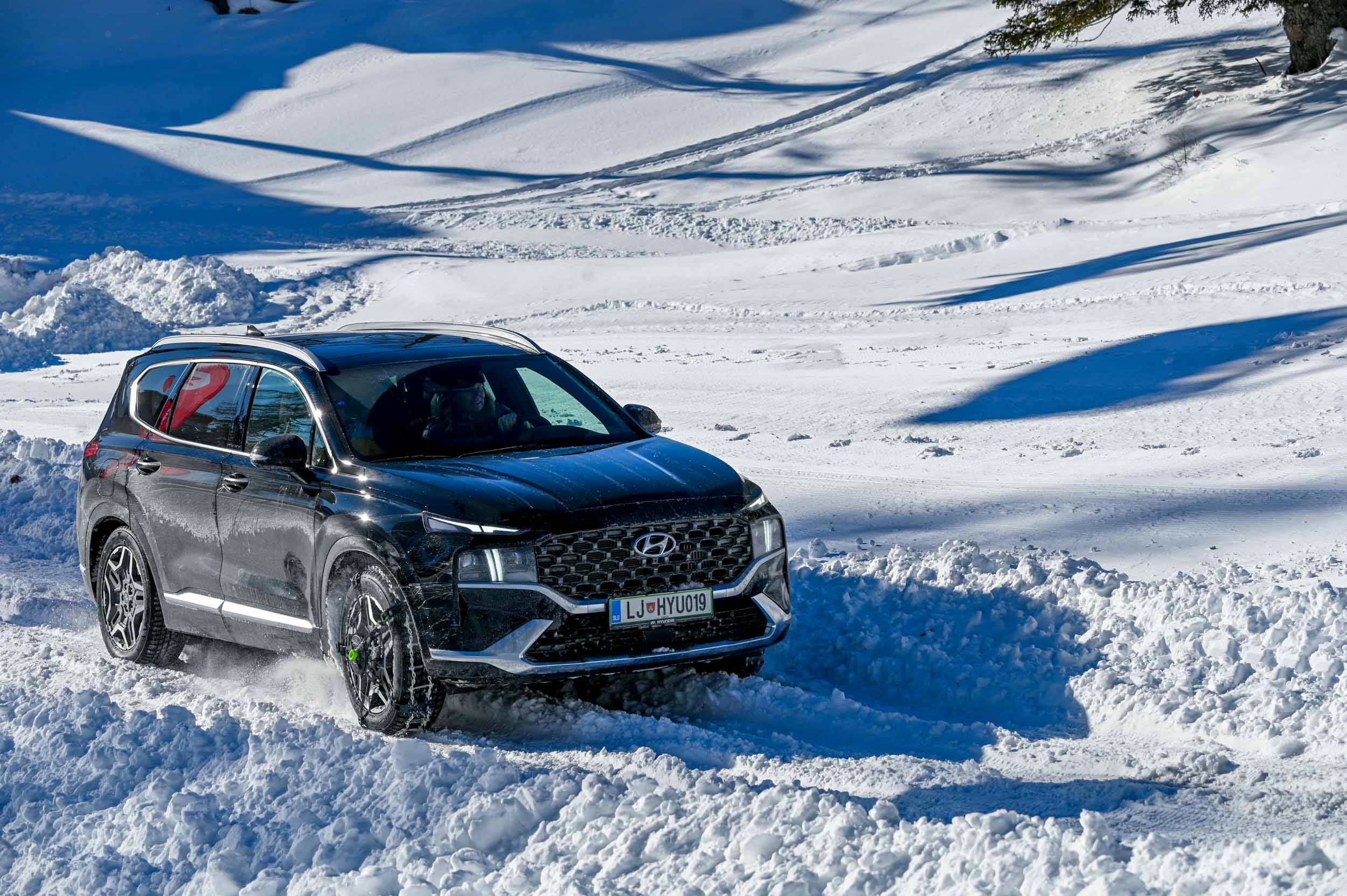 A silovit vdor zime sredi januarja nam je postregel najprej s precejšnjo snežno odejo, že naslednji dan pa tudi s polarnimi temperaturami, kar je seveda ustvarilo odlične zimske razmere, a tudi kar nekaj dodatnega dela, da smo lahko zasneženo kotanjo pod spodnjo postajo nove šestsedežnice Zvoh na Krvavcu uredili tako, da smo vanjo lahko pripeljali avtomobile. Sneg je seveda nujna sestavina zimskega vozniškega doživetja, a če ga je preveč, se po njem ne da voziti z avti - tudi če gre za Hyuindaijeva cestna terenca santa-fe in tucson s štirikolesnim pogonom, večjo oddaljenostjo od tal in dobrimi zimskimi pnevmatikami na kolesih. K sreči pripravljalci smučišča na Krvavcu ne znajo poskrbeti le za steptana smučišča, pač pa tudi za dovolj utrjen vozniški poligon.
