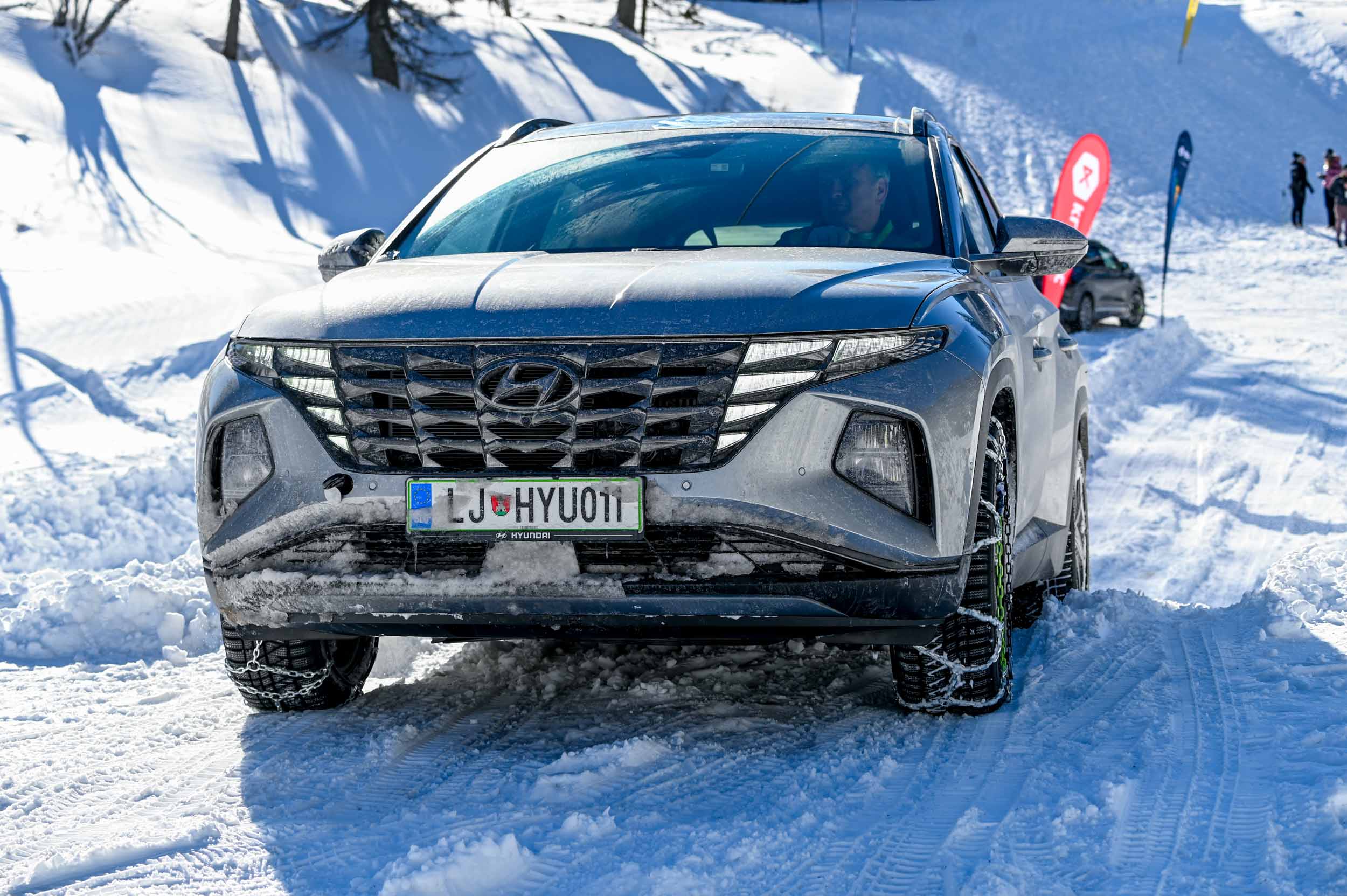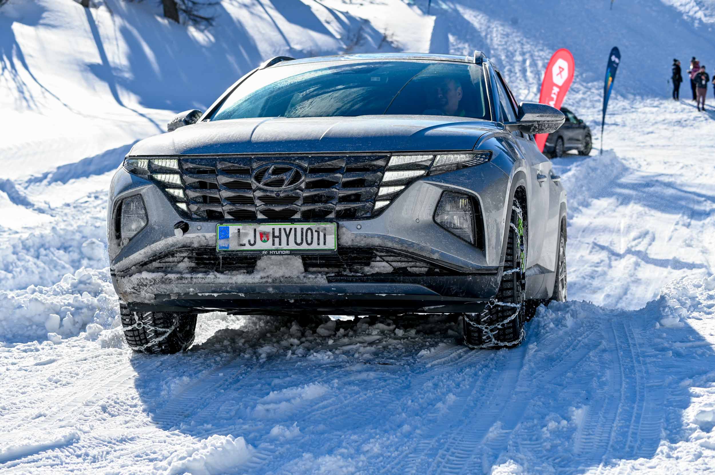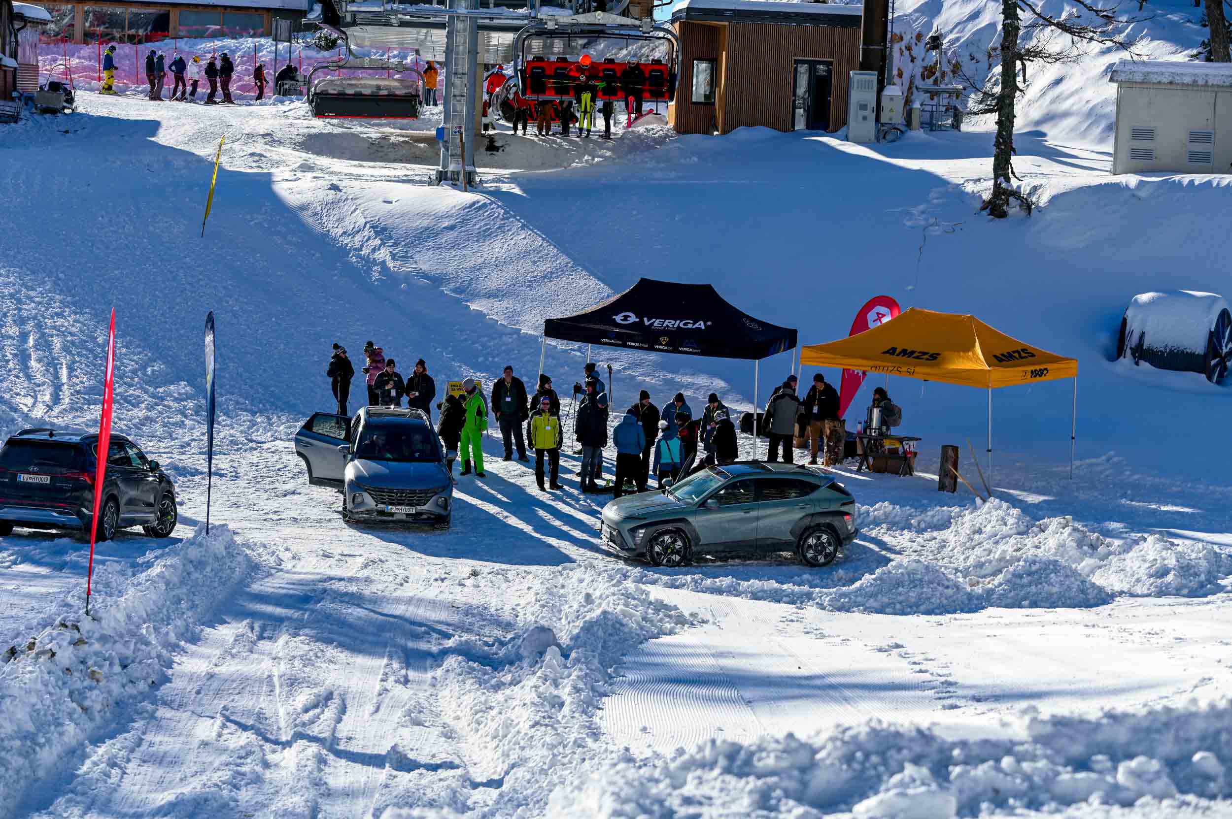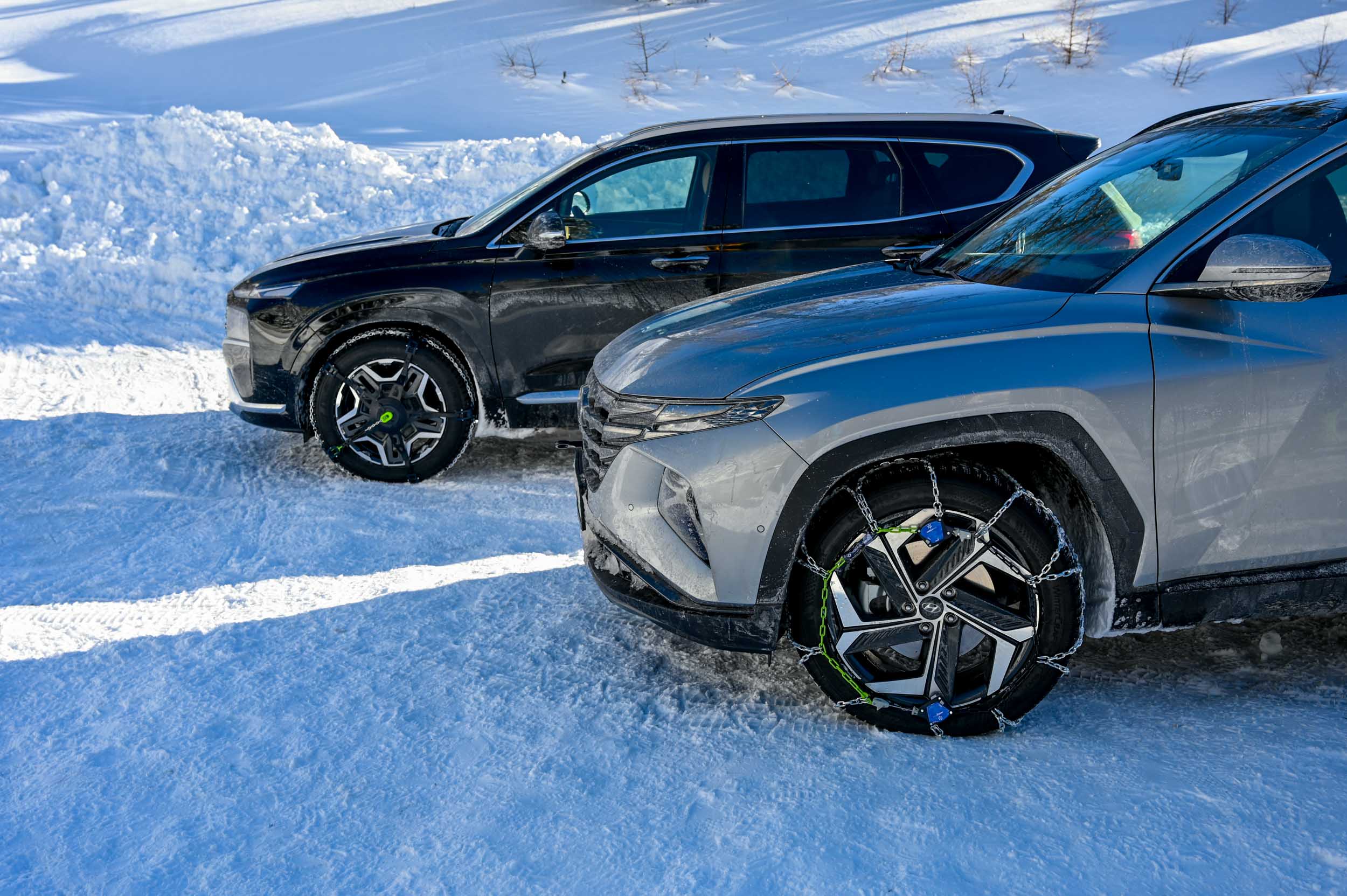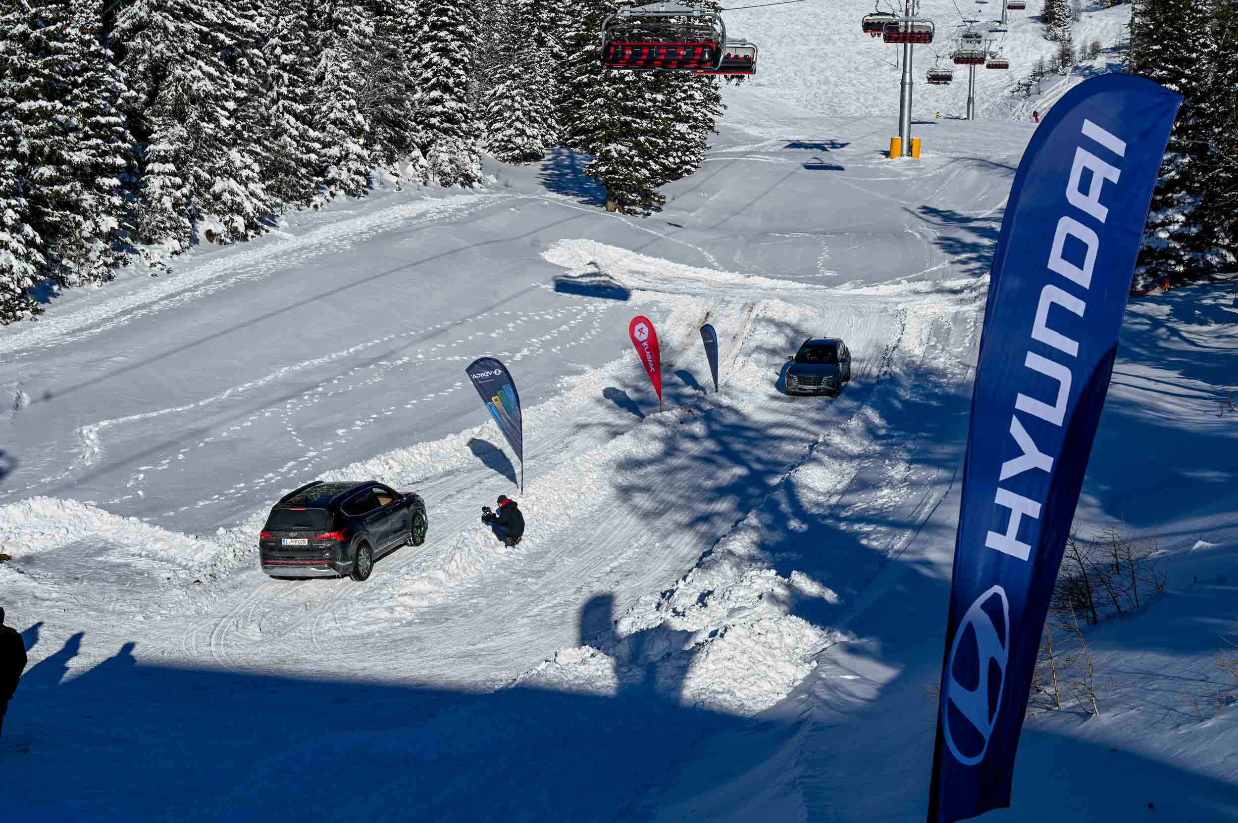 A silovit vdor zime sredi januarja nam je postregel najprej s precejšnjo snežno odejo, že naslednji dan pa tudi s polarnimi temperaturami, kar je seveda ustvarilo odlične zimske razmere, a tudi kar nekaj dodatnega dela, da smo lahko zasneženo kotanjo pod spodnjo postajo nove šestsedežnice Zvoh na Krvavcu uredili tako, da smo vanjo lahko pripeljali avtomobile. Sneg je seveda nujna sestavina zimskega vozniškega doživetja, a če ga je preveč, se po njem ne da voziti z avti - tudi če gre za Hyuindaijeva cestna terenca santa-fe in tucson s štirikolesnim pogonom, večjo oddaljenostjo od tal in dobrimi zimskimi pnevmatikami na kolesih. K sreči pripravljalci smučišča na Krvavcu ne znajo poskrbeti le za steptana smučišča, pač pa tudi za dovolj utrjen vozniški poligon.
