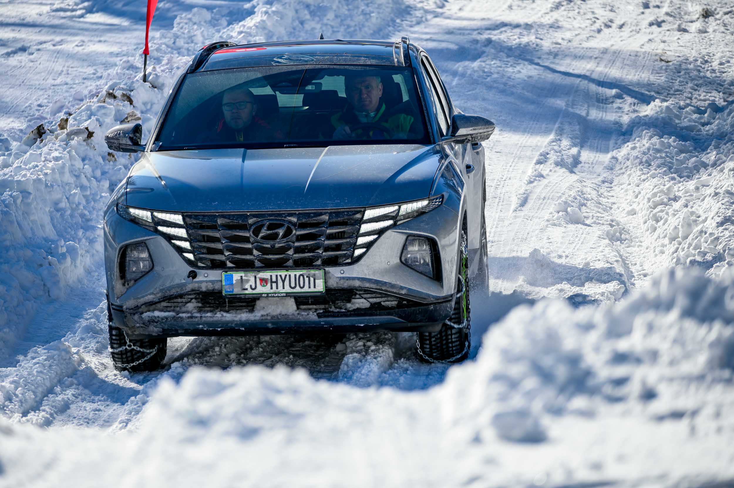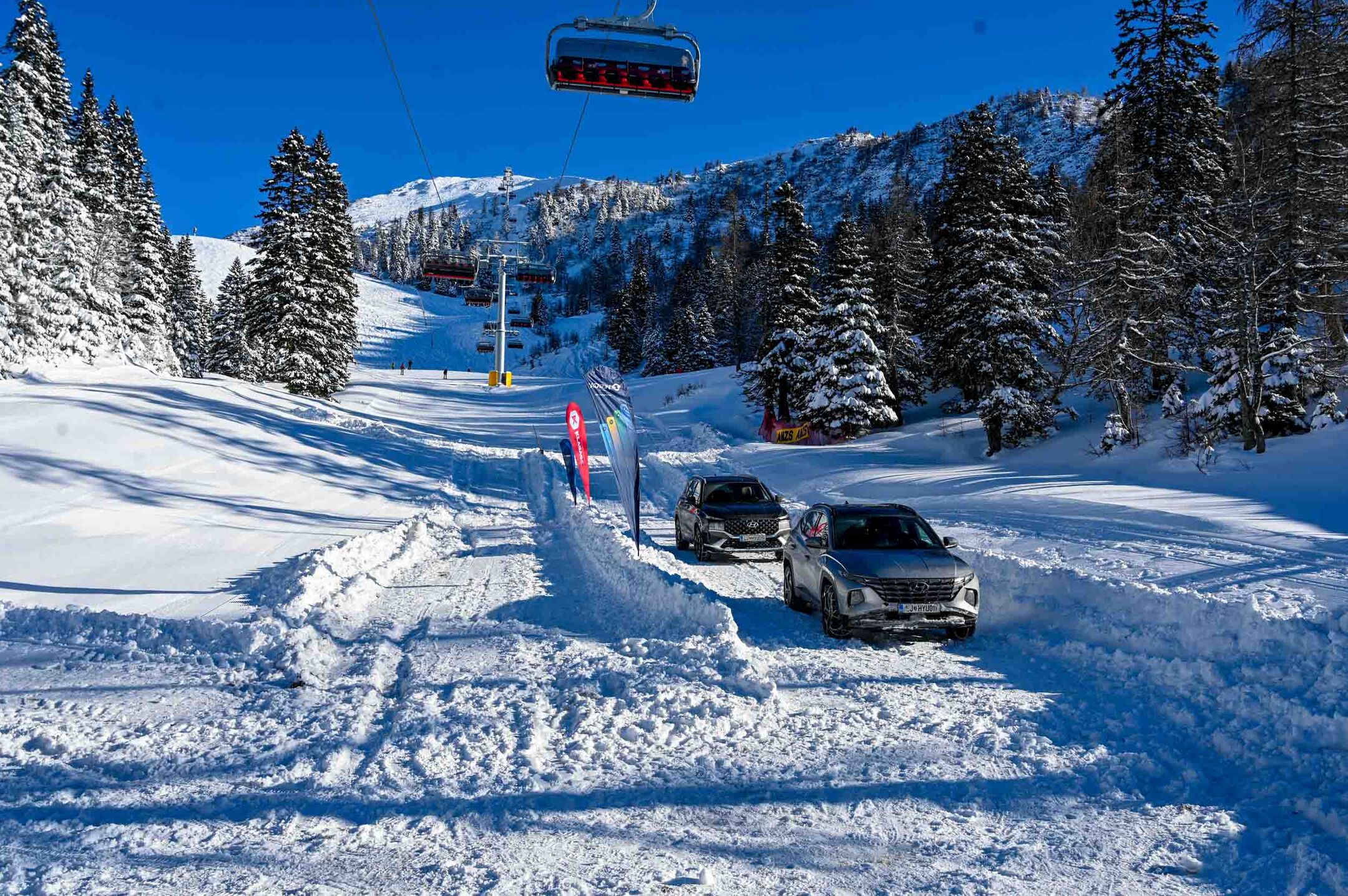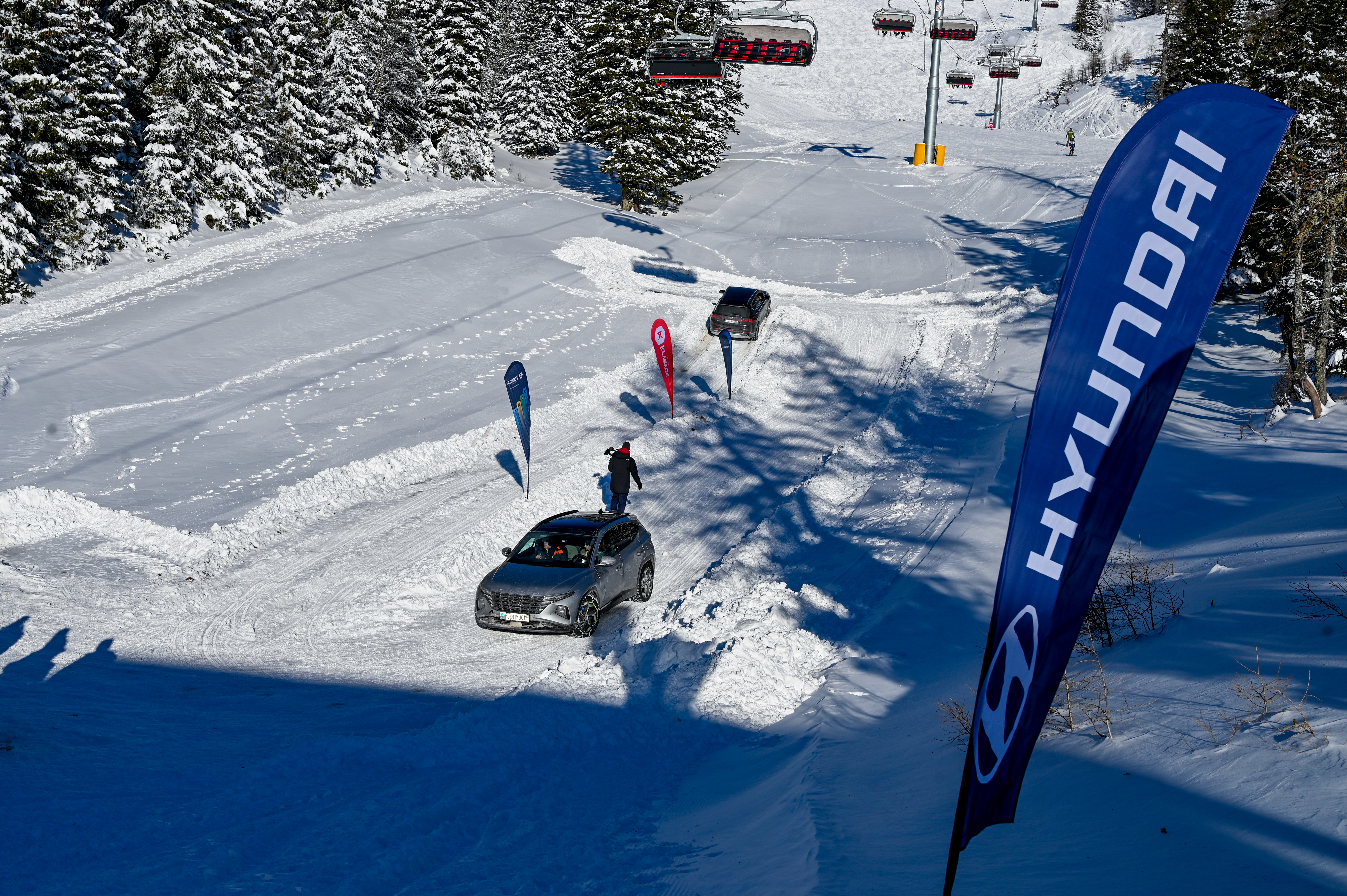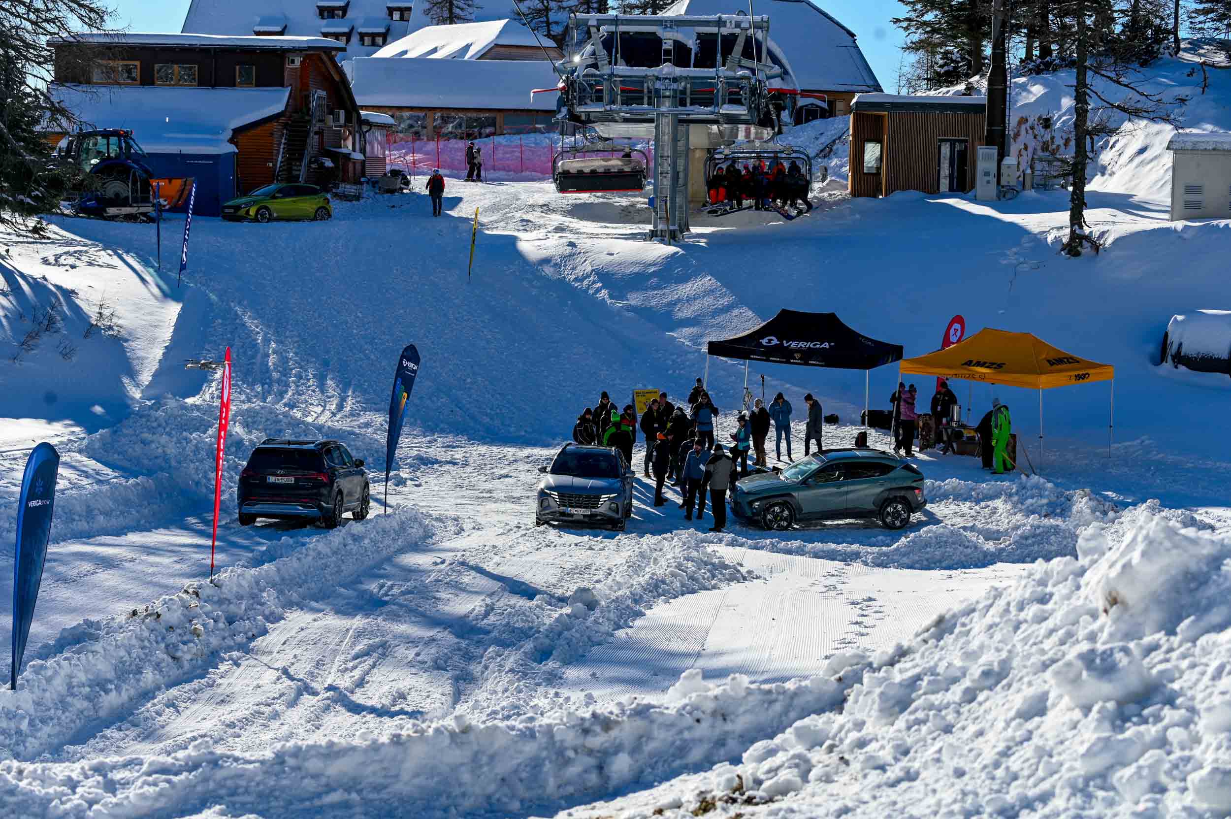 A silovit vdor zime sredi januarja nam je postregel najprej s precejšnjo snežno odejo, že naslednji dan pa tudi s polarnimi temperaturami, kar je seveda ustvarilo odlične zimske razmere, a tudi kar nekaj dodatnega dela, da smo lahko zasneženo kotanjo pod spodnjo postajo nove šestsedežnice Zvoh na Krvavcu uredili tako, da smo vanjo lahko pripeljali avtomobile. Sneg je seveda nujna sestavina zimskega vozniškega doživetja, a če ga je preveč, se po njem ne da voziti z avti - tudi če gre za Hyuindaijeva cestna terenca santa-fe in tucson s štirikolesnim pogonom, večjo oddaljenostjo od tal in dobrimi zimskimi pnevmatikami na kolesih. K sreči pripravljalci smučišča na Krvavcu ne znajo poskrbeti le za steptana smučišča, pač pa tudi za dovolj utrjen vozniški poligon.