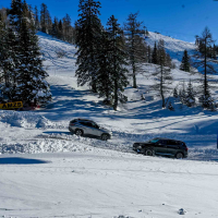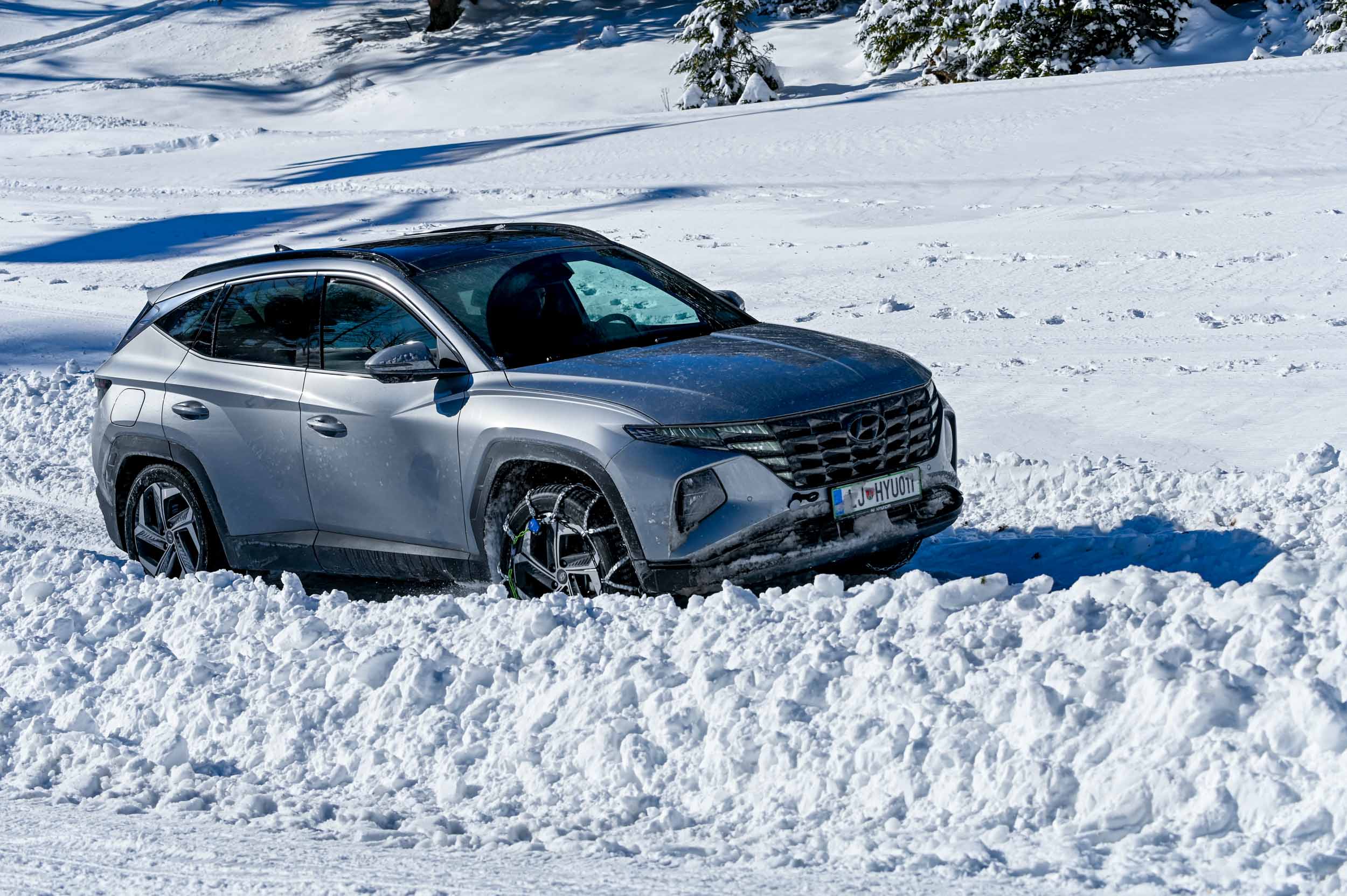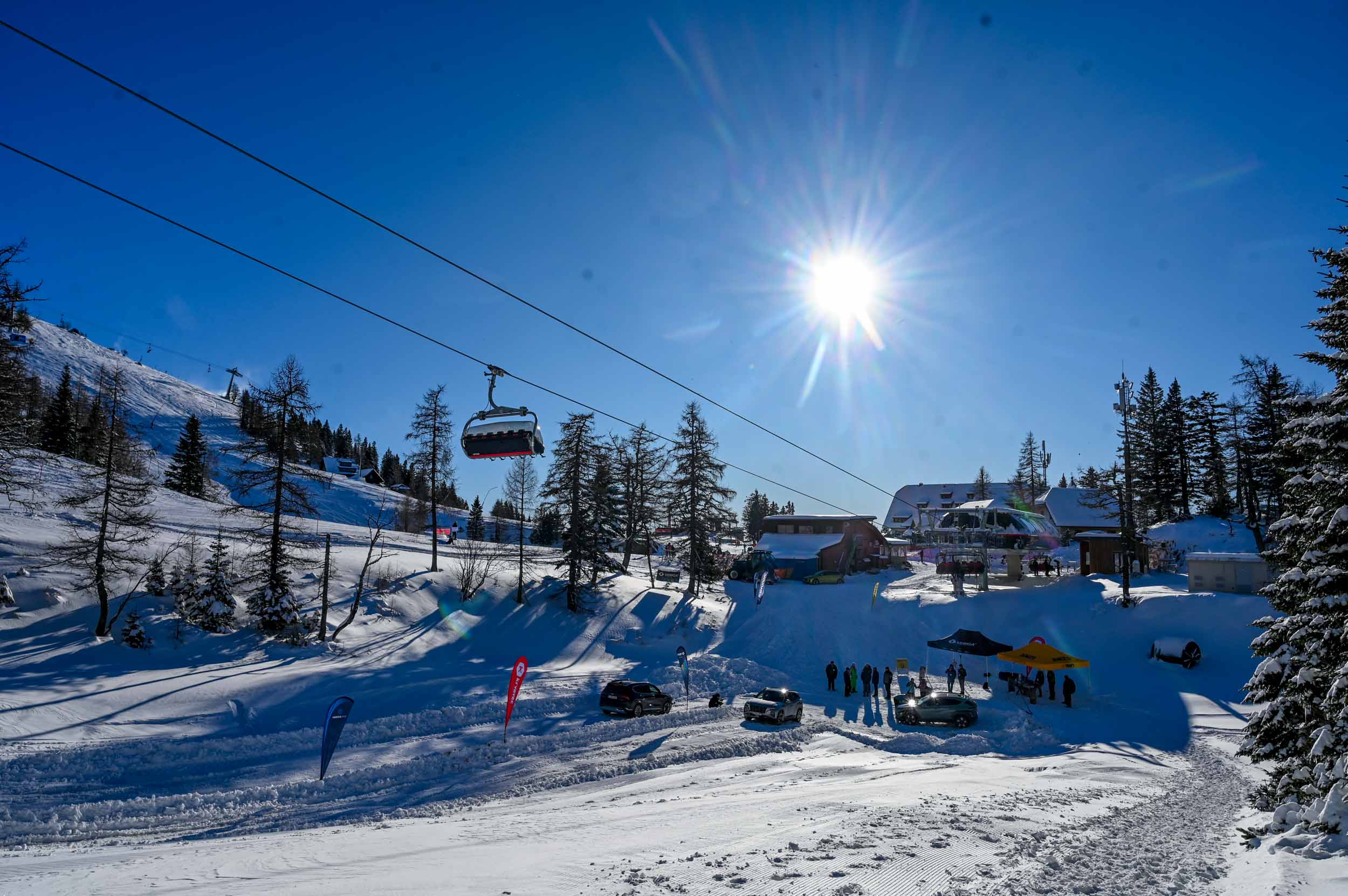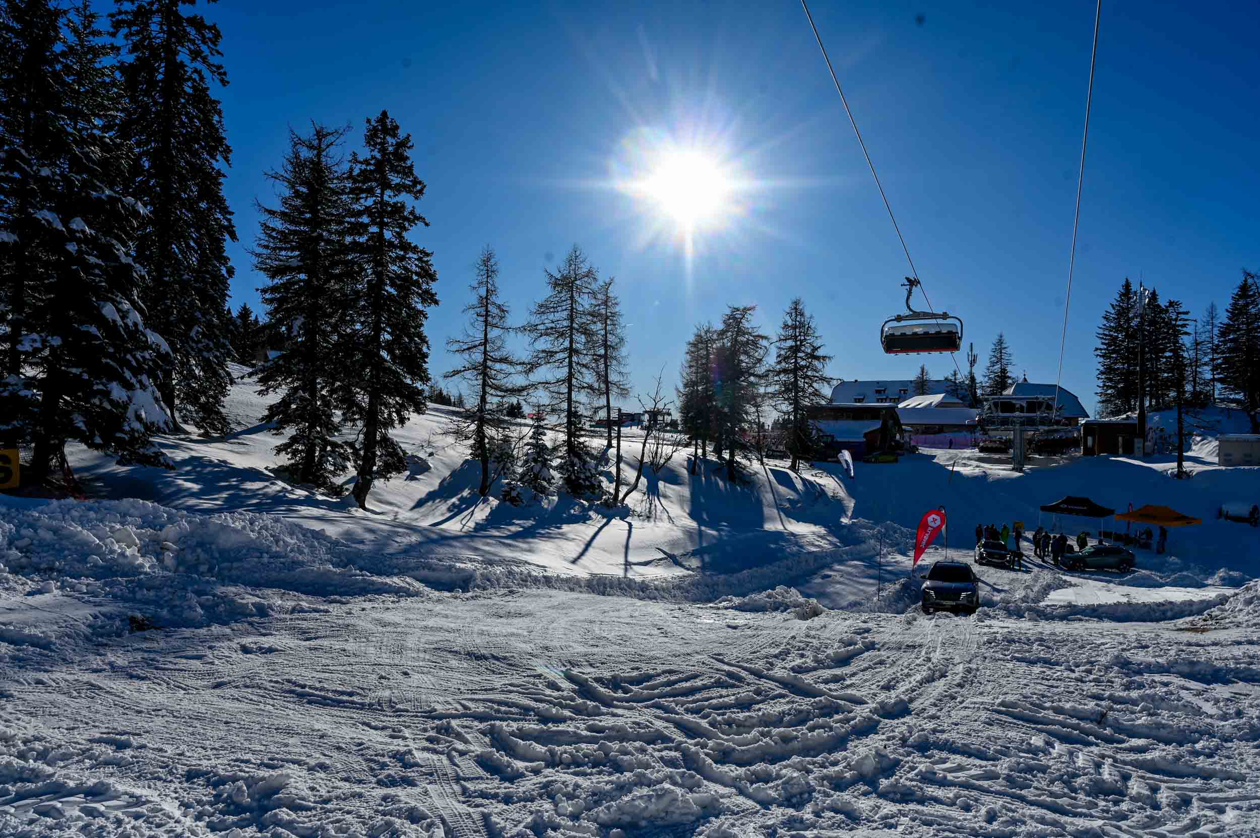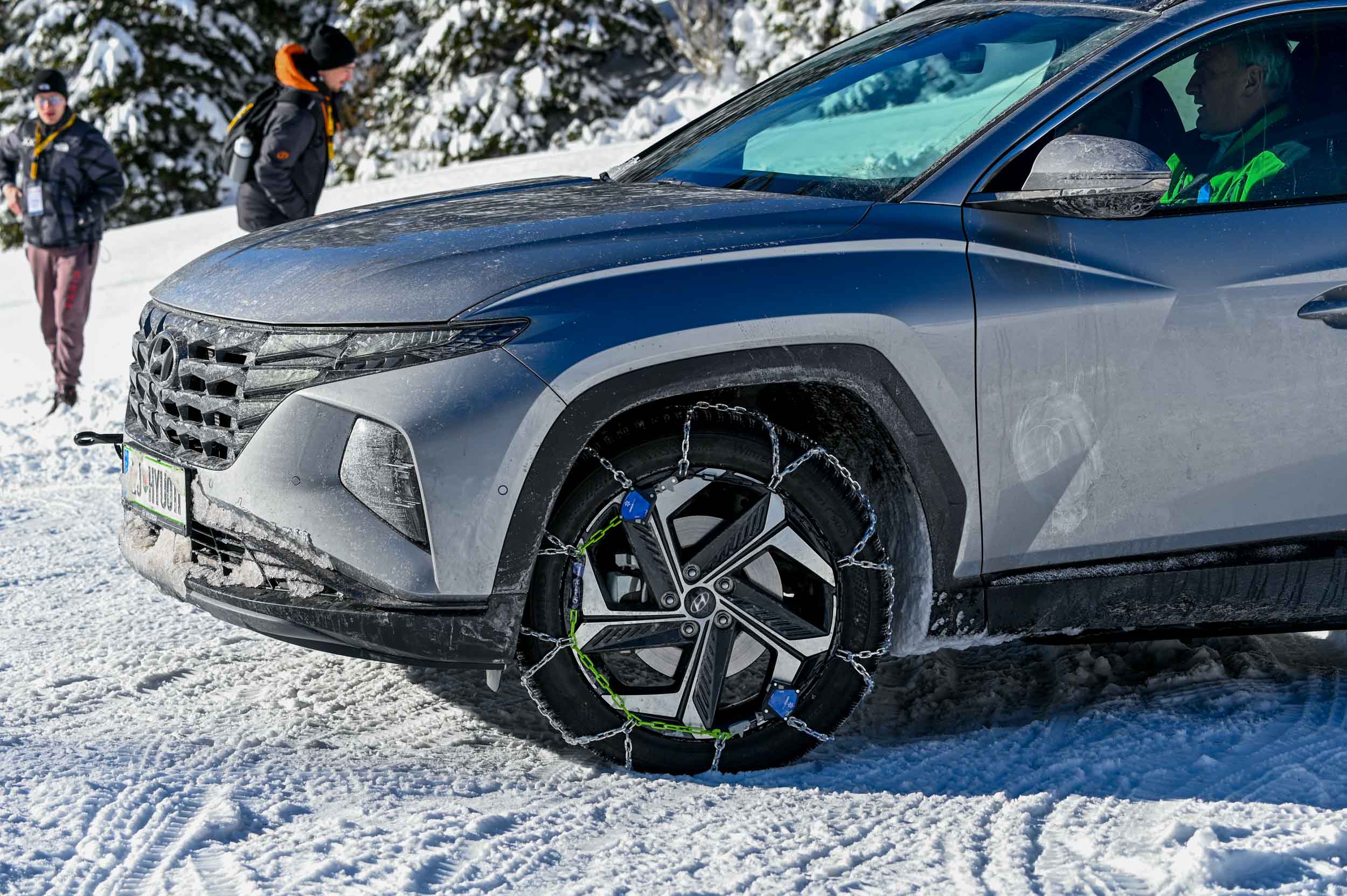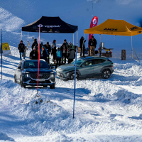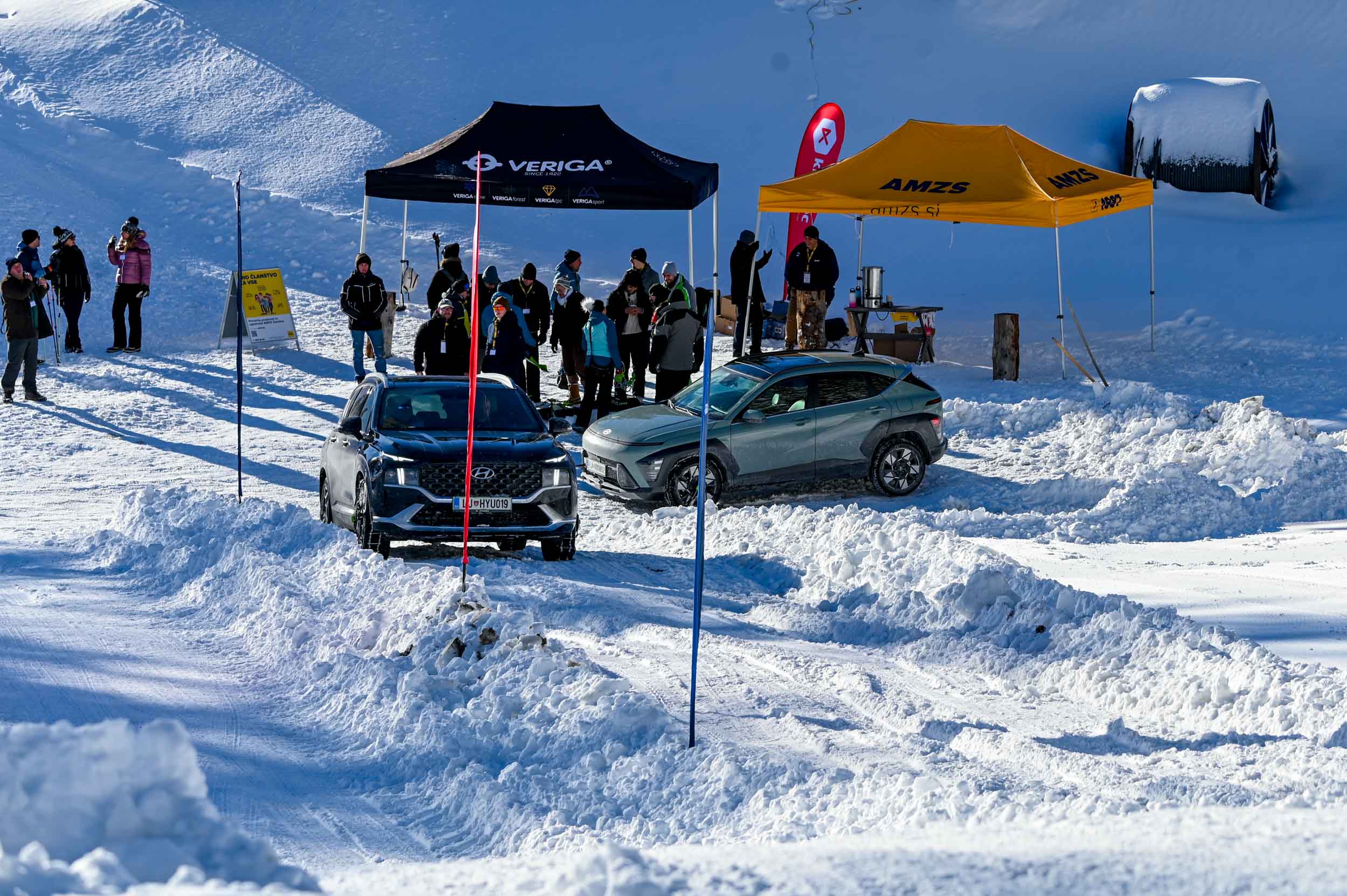 A silovit vdor zime sredi januarja nam je postregel najprej s precejšnjo snežno odejo, že naslednji dan pa tudi s polarnimi temperaturami, kar je seveda ustvarilo odlične zimske razmere, a tudi kar nekaj dodatnega dela, da smo lahko zasneženo kotanjo pod spodnjo postajo nove šestsedežnice Zvoh na Krvavcu uredili tako, da smo vanjo lahko pripeljali avtomobile. Sneg je seveda nujna sestavina zimskega vozniškega doživetja, a če ga je preveč, se po njem ne da voziti z avti - tudi če gre za Hyuindaijeva cestna terenca santa-fe in tucson s štirikolesnim pogonom, večjo oddaljenostjo od tal in dobrimi zimskimi pnevmatikami na kolesih. K sreči pripravljalci smučišča na Krvavcu ne znajo poskrbeti le za steptana smučišča, pač pa tudi za dovolj utrjen vozniški poligon.