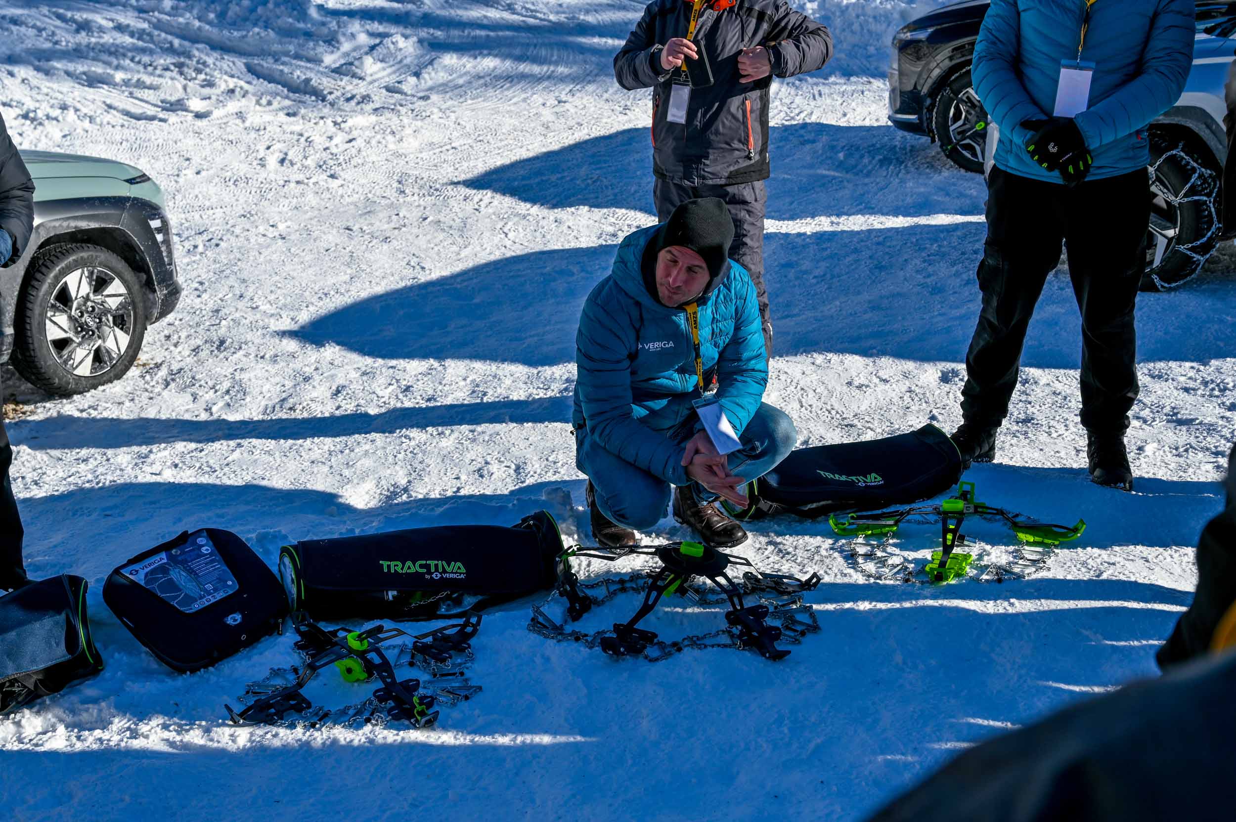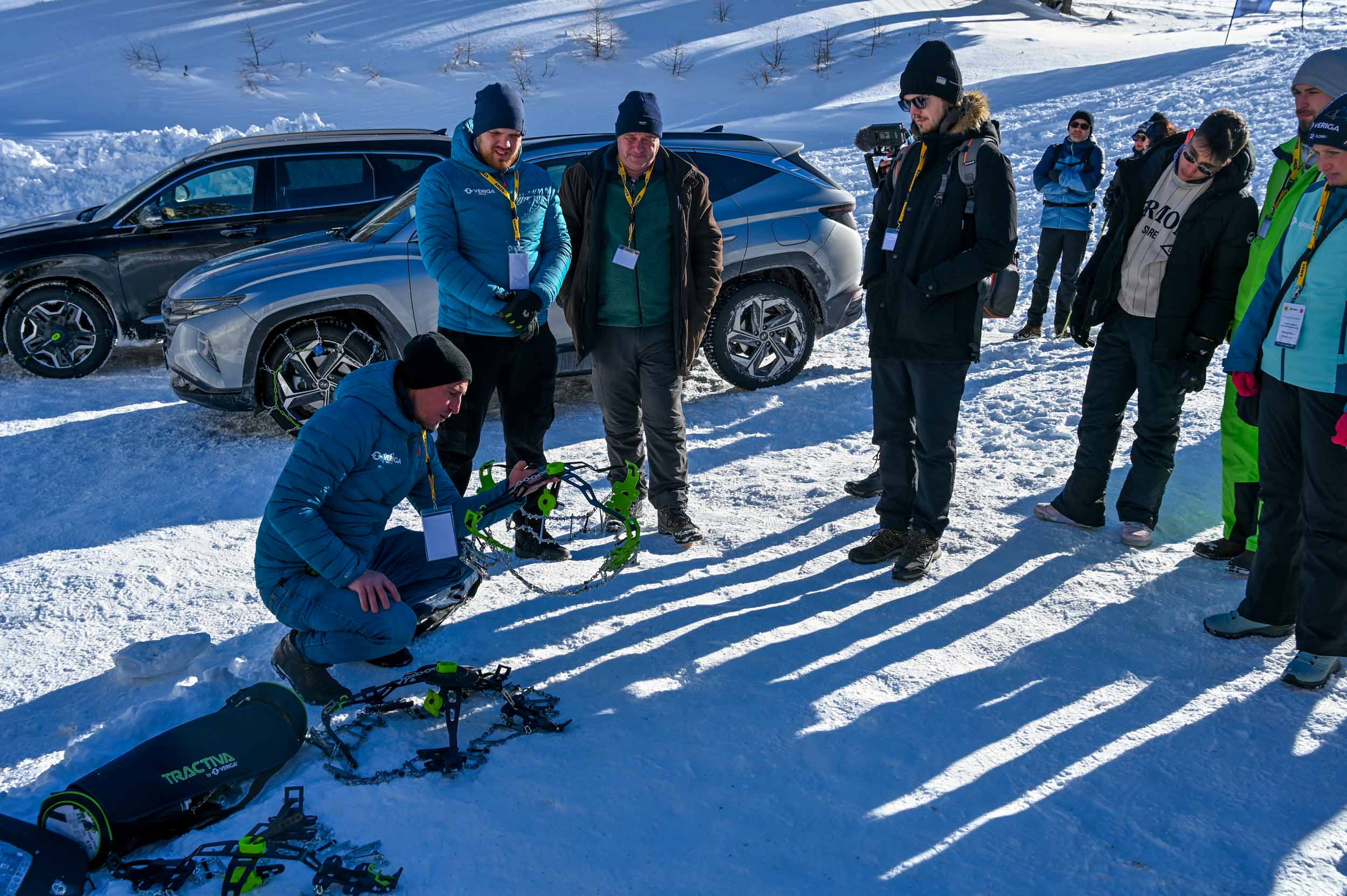 Krvavški vozniški poligon je bil zaradi obilice mehkega snega sicer krajši, kot smo si ga zamislili, a dve utrjeni vozniški površini navzgor proti Zvohu sta bili dovolj dolgi, da so udeleženci tega dogodka temeljito preskusili oprijem Veriginih snežnih verig tractiva, ki so bile glavna zvezda dogodka. Verige tractiva, o katerih smo obširneje pisali v lanski decembrski Motoreviji, so sicer enako učinkovite kot klasične snežne verige, a se od verig, kakšne poznamo že desetletja, razlikujejo po pomembni lastnosti: enostavnosti, praktičnosti in hitrosti nameščanja na kolesa. Zasnovane so namreč po načelu učinka vzmeti in samodejnega zatezanja pri vrtenju kolesa oziroma učinku centrifugalne sile. Enostavno montažo brez poseganja v kolotek in notranjo stran pnevmatike omogočajo nosilne jeklene roke, ki jih uporabnik pritrdi na platišče le z zunanje strani na enega od obstoječih vijakov. Nato mora le še vpeti poseben gumijast samozatezni element, ki poskrbi za ustrezno prilagajanje členov verige tekalni površini pnevmatike oziroma dokončno samodejno namestitev verige po speljevanju.
