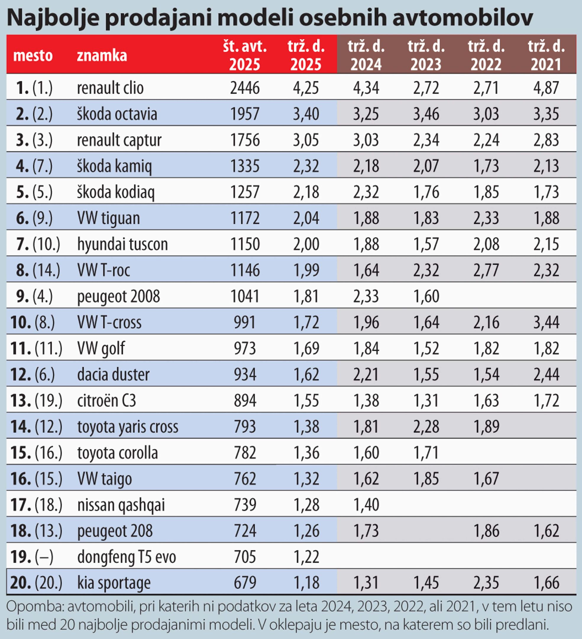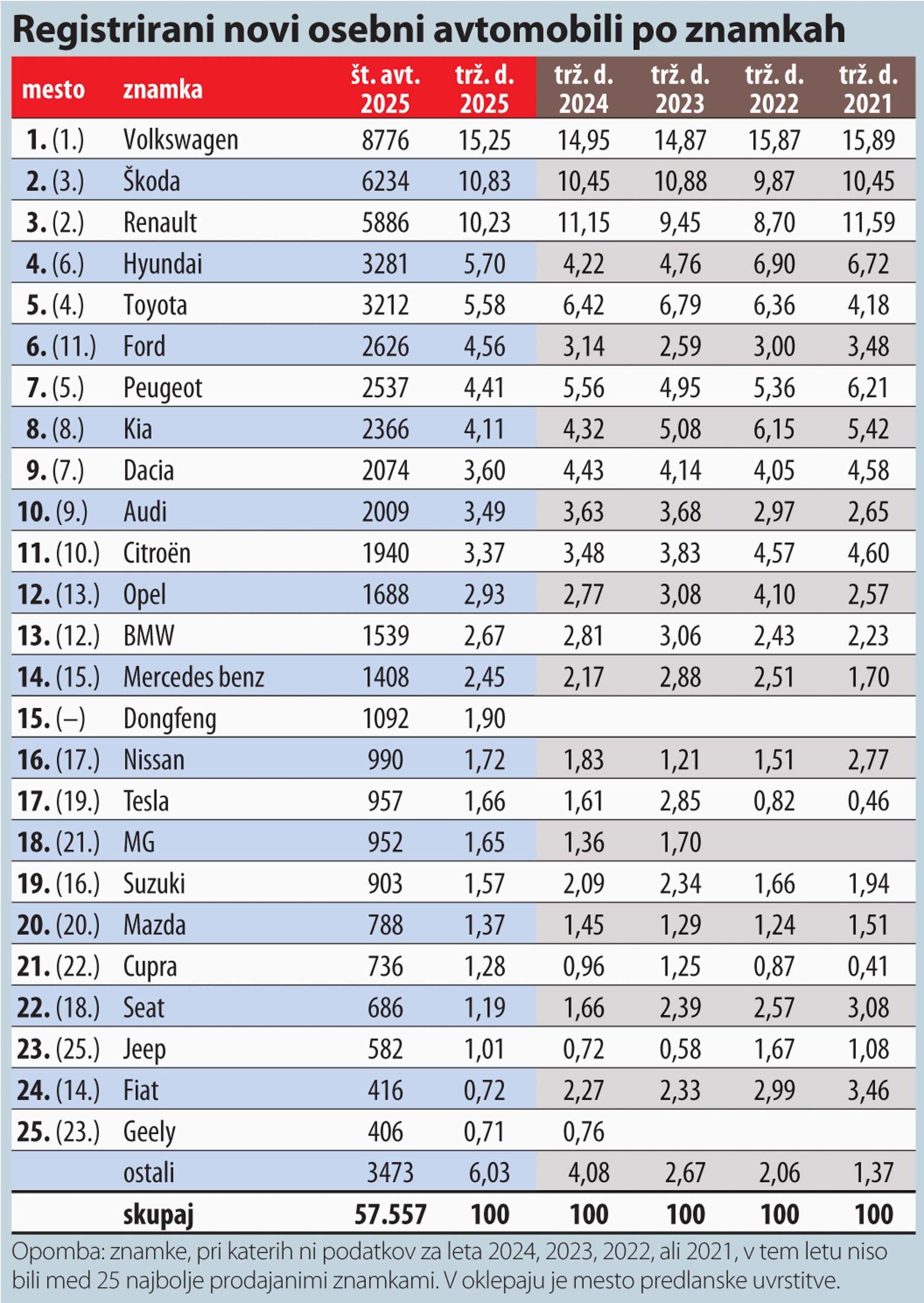 Na lestvici najbolje prodajanih avtomobilov po znamkah je bil tudi v letu 2025 prepričljivo na vrhu Volkswagen, ki je še utrdil svojo položaj, saj je prodal 852 avtov več kot v letu 2024 in svoj tržni delež povečal za 0,3 odstotne točke na 15,25 odstotka. Na drugem mestu je spet prišlo do spremembe. Škoda, ki je morala v letu 2024 drugo mesto prepustiti Renaultu, je lani prehitela francoskega tekmeca, saj je prodala 696 avtov več kot leta 2024. To niti ni presenetljivo, saj ima češka znamka zelo obsežno paleto modelov tako klasično oblikovanih avtov kot cestnih terencev in tudi dveh modelov z električnim pogonom. Renault je lani prodal skoraj enako število avtov kot v letu 2024.
