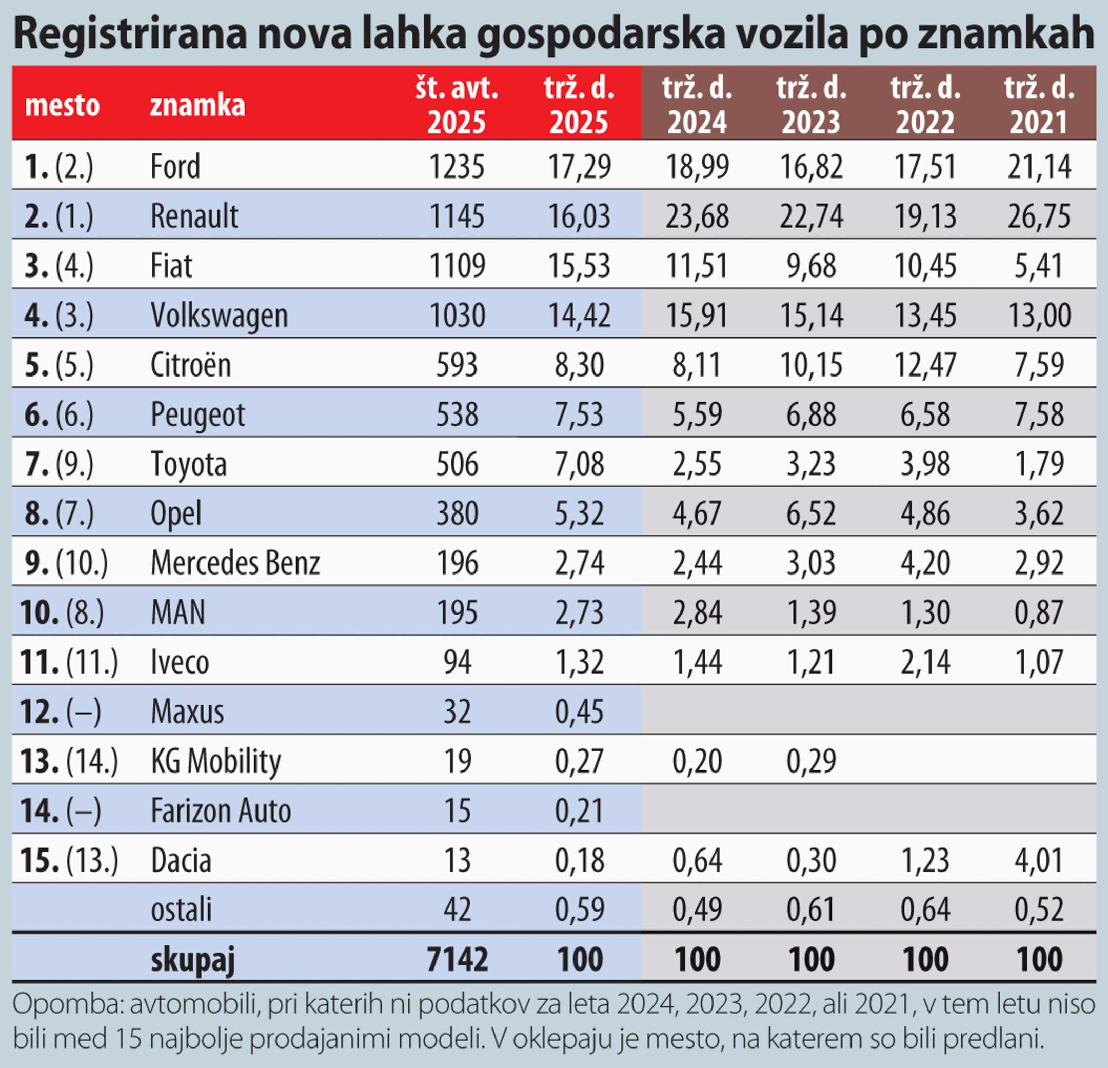 Citroen in Peugeot sta zadržala svoji mesti, na sedmo mesto se je povzpela Toyota, ki je prehitela Opel. Mercedes se je povzpel za mesto na deveto mesto, MAN je zdrsnil za dve mesti na deseto. Enajsto mesto je zadržal Iveco, na 12. mestu je novinec Maxus,n a 13. mestu pa je KG Mobility, kot se sedaj imenuje nekdanji Ssangyong. Na 14. mestu je Dacia, na 15. mestu pa kitajski novinec Farizon Auto.