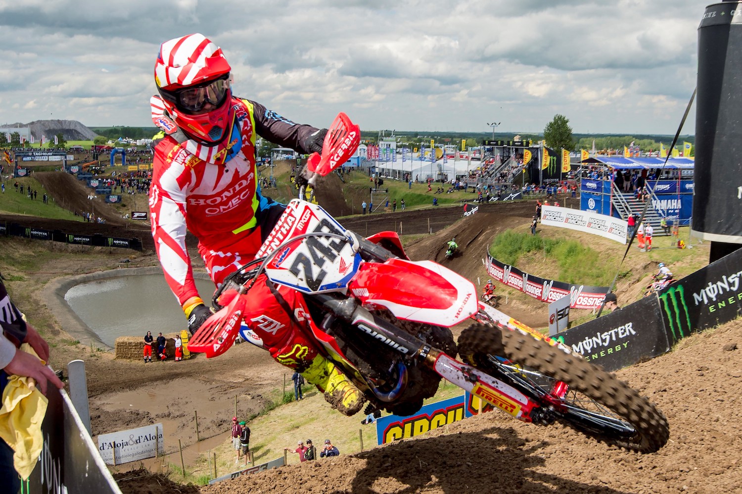 Med dirko v Kegumsu in naslednjo v nemškem Teutschenthalu je bilo dva tedna premora, kar je zelo prav prišlo Timu Gajserju, da je vsaj za silo pozdravil svoje poškodbe. Njegov nastop v Nemčiji je dolgo visel v zraku, a na koncu se je počutil dovolj sposobnega za nastop. Na treningih je bil hiter, prav tako v uvodnih krogih na kvalifikacijski dirk. A potlej mu je za trenutek popustila koncentracija, naredil je napako in spet tako grdo padel. Zdravnik mu je v nedeljo vseeno dovolil nastop na dirki, a videlo se je, da to ni Tim Gajser, kot smo ga poznali na prejšnjih dirkah. Kako bi tudi bil, ko pa je pred vsako vožnjo dobil po dve injekciji proti bolečinam, še zlasti v rami. V prvi vožnji je imel zelo slab štartni položaj in je osvojil 12. mesto. V drugi vožnji je imel boljši štartni položaj, a več kot deseto mesto ni bilo dosegljivo. Cairoli je z drugim in prvim mestom v posamičnih vožnjah močno povečal – kar na 44 točk prednosti – svoje vodstvo pred Gajserjem, ki ima le še točko prednosti pred Paulinom, ki je zelo dobro odpeljal dirki v Valkenswaardu, kjer je zmagal, in v Nemčiji. Četrti je Desalle, ki za Gajserjem zaostaja 15 točk, sledita pa Van Horebeek in Herlings, ki je bil zelo prepričljiv na zadnjih treh dirkah, na katerih je osvojil kar 137 točk (od 150 možnih). Zgolj za primerjavo: Gajser jih je osvojil 60. Kako hitro lahko pride do velikega preobrata, je na svoji koži občutil Gajserjev moštveni tovariš Jevgenij Bobrišev. Na treningu v Nemčiji je namreč padel in si zlomil ključnico, tako da na dirki ni mogel nastopiti. Honda je tako v boju za točke izdelovalcev motorjev lahko računala le na Gajserja, zato je bil njegov nastop v Nemčiji pomemben tudi za Hondo.